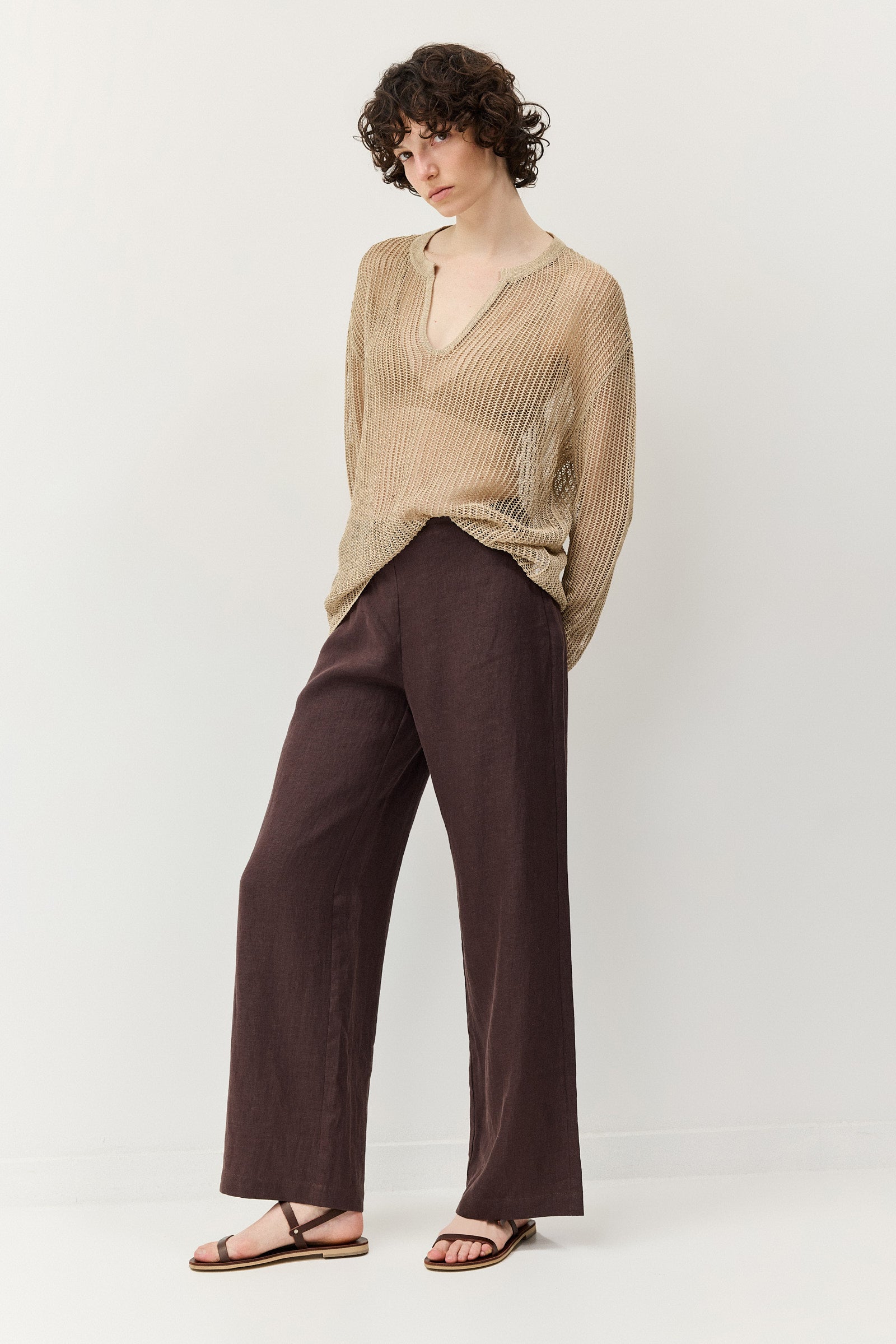 גזרה משוחררת עם שרוולים ארוכים ומפתח וי מעודן עם חיתוך קטן בקדמה שמוסיף עניין. הטקסטורה הפתוחה יוצרת מראה נינוח עם קריצה קיצית, ומאפשרת לשחק עם טופ או גופייה מתחת.
