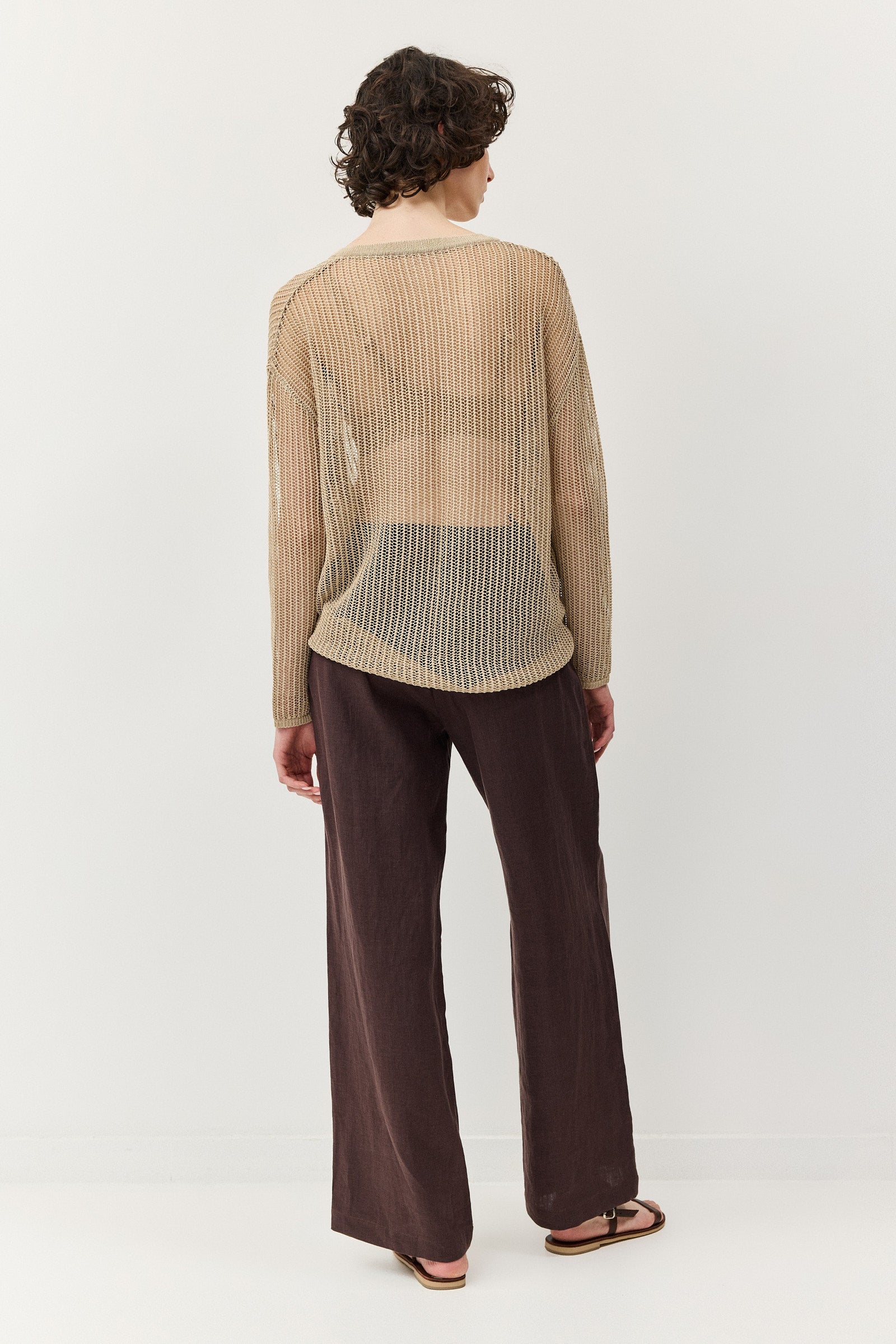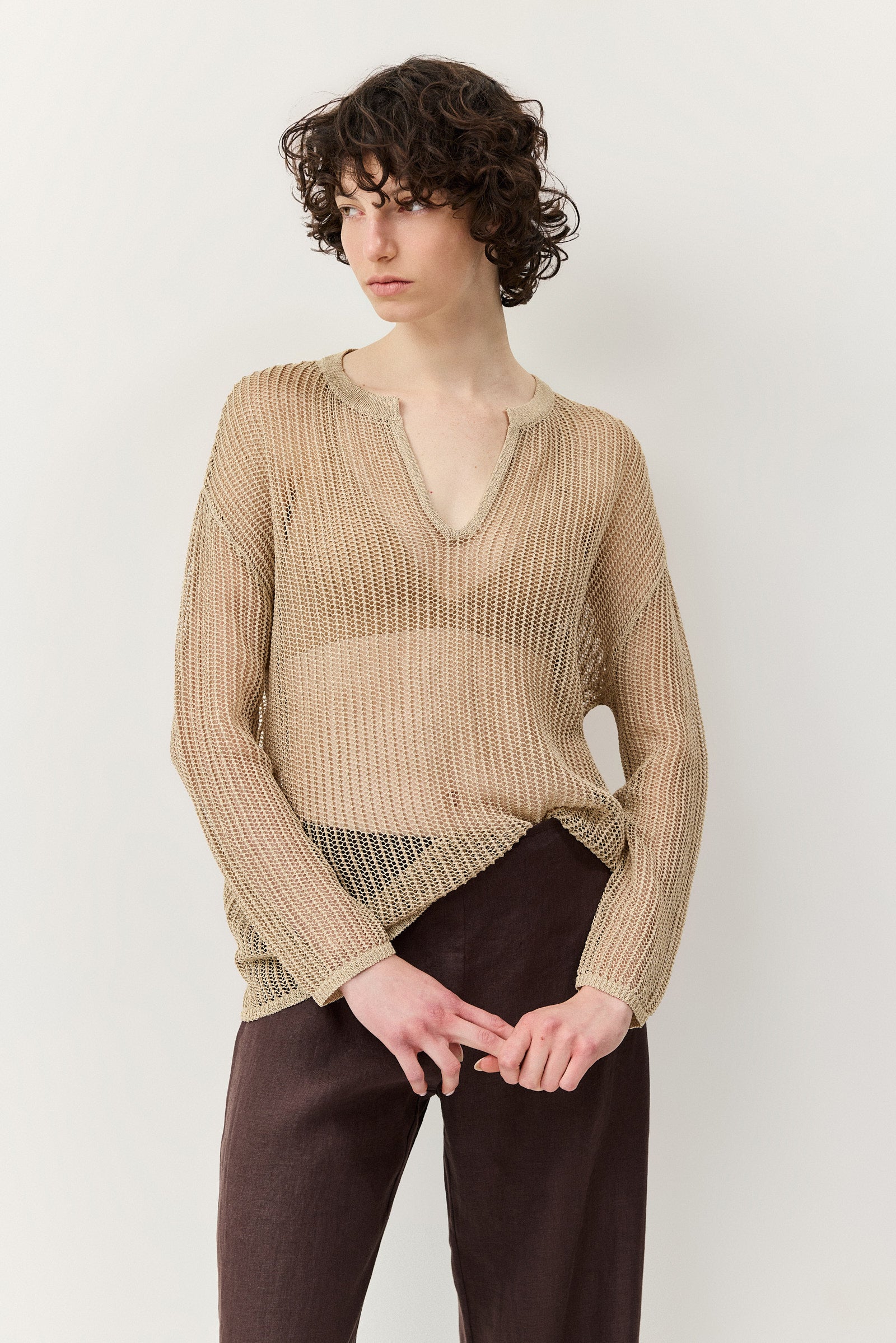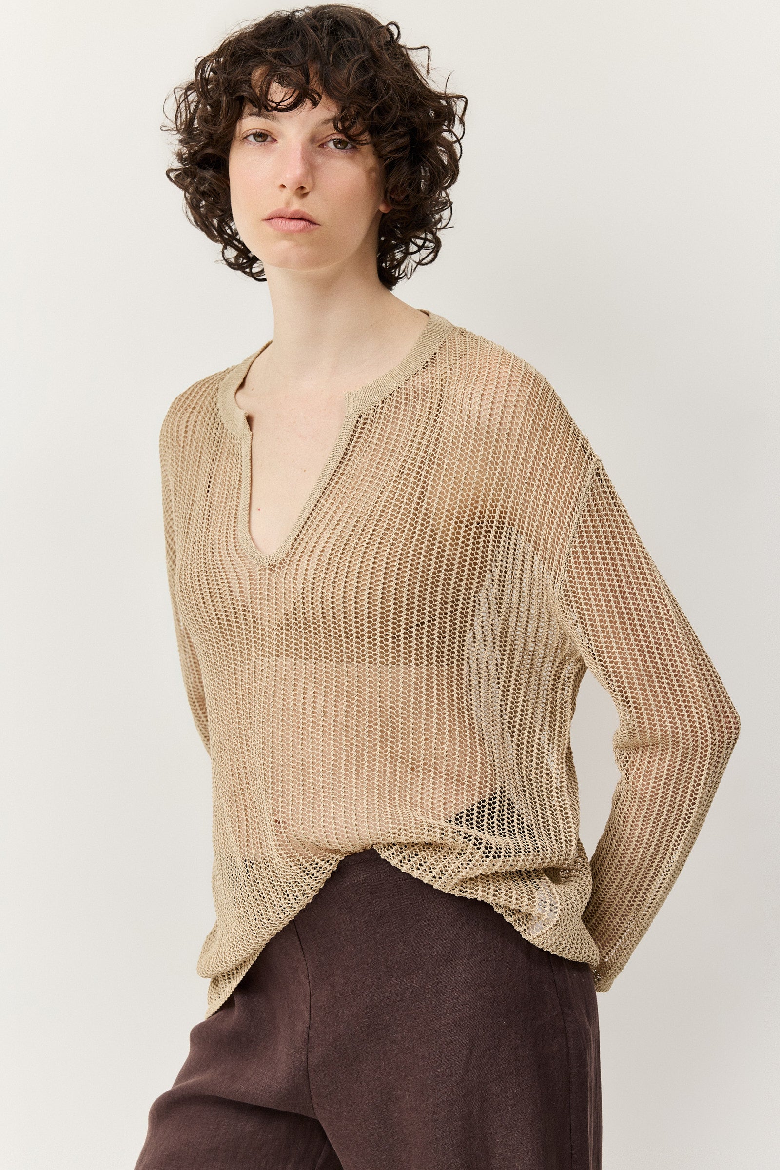 חולצת רשת סרוגה בגוון בז’ טבעי, קלילה, אוורירית ומדויקת לשכבות.