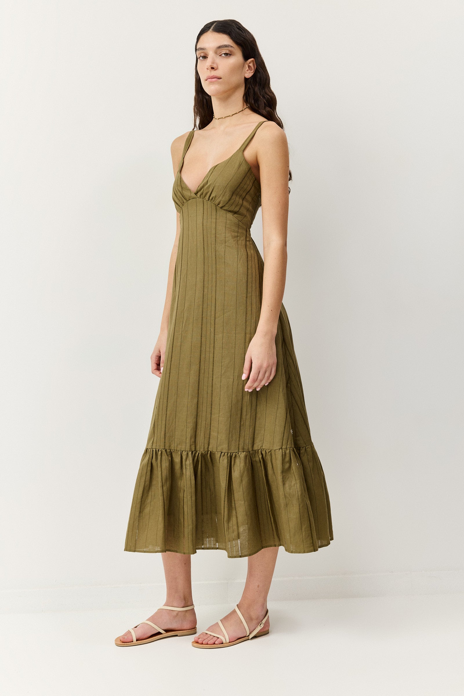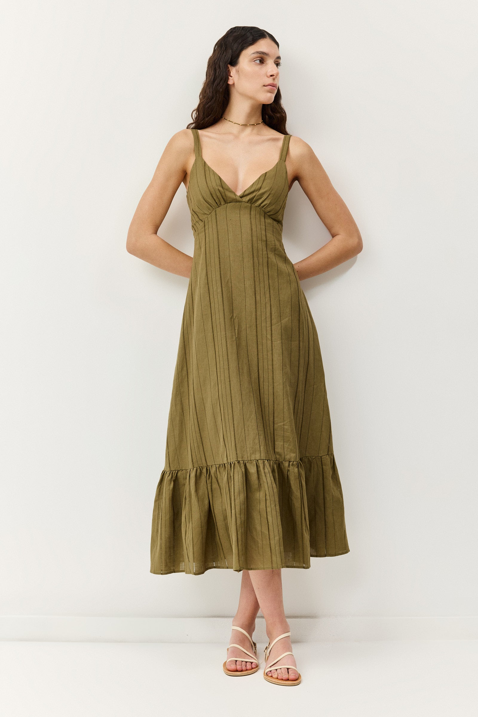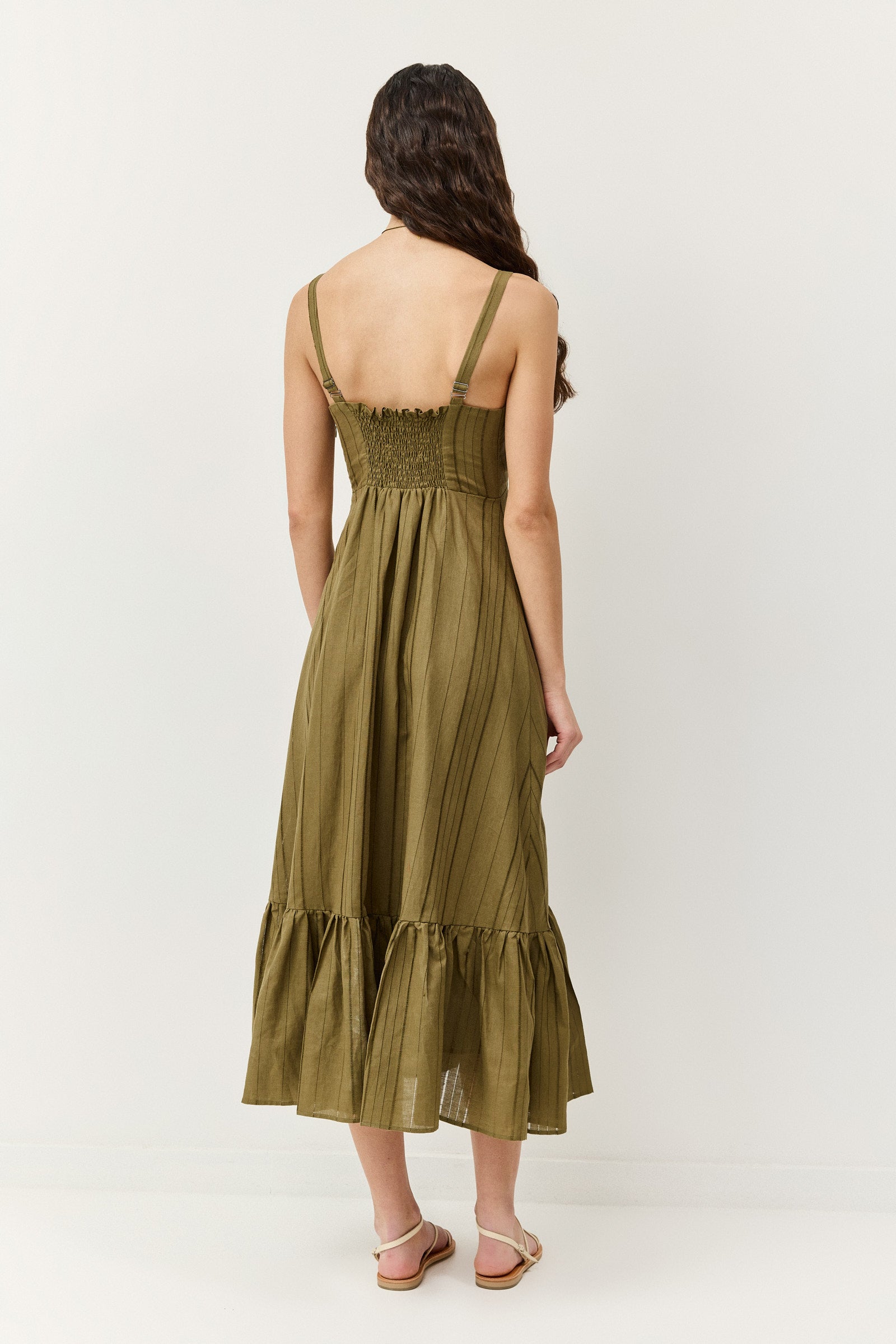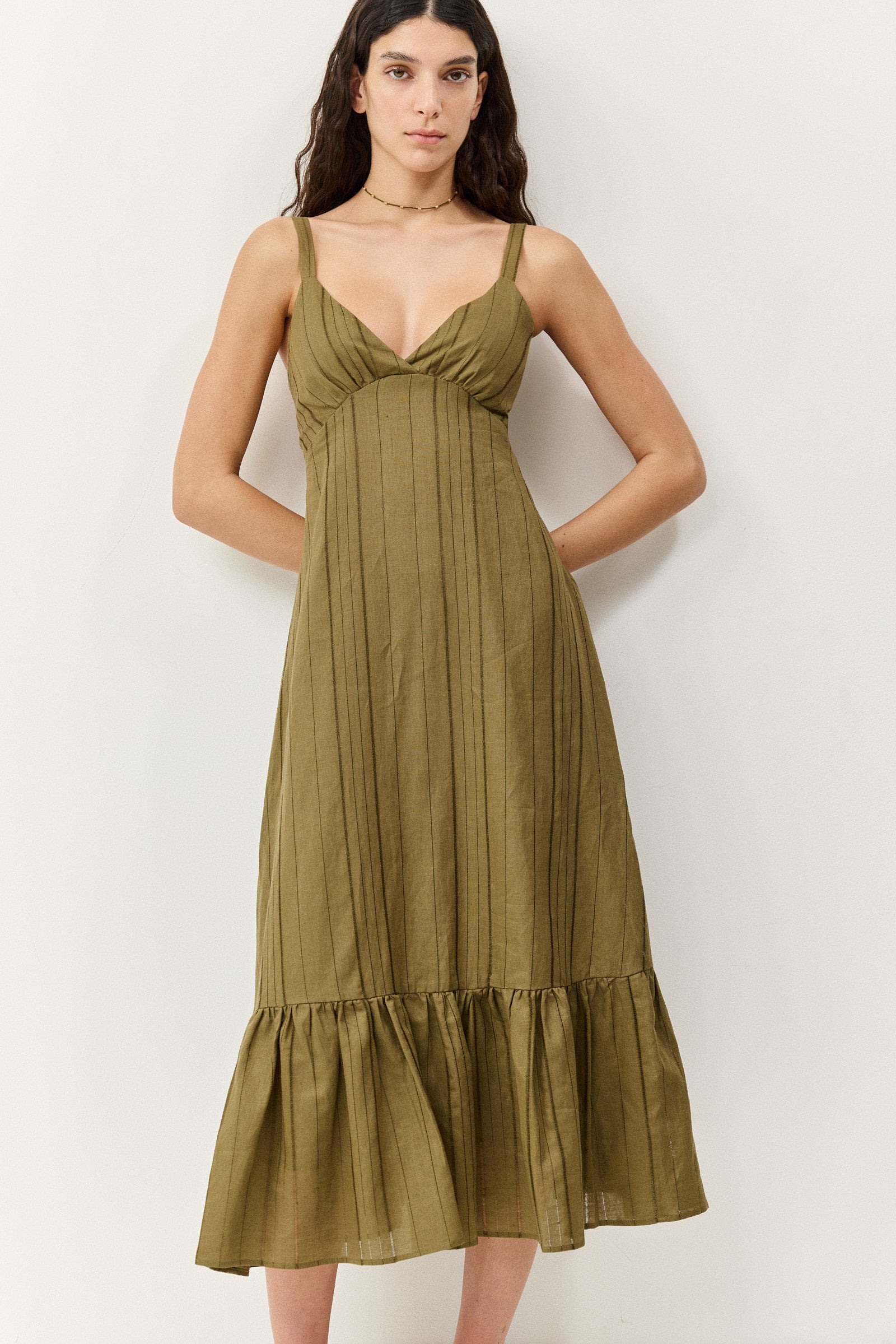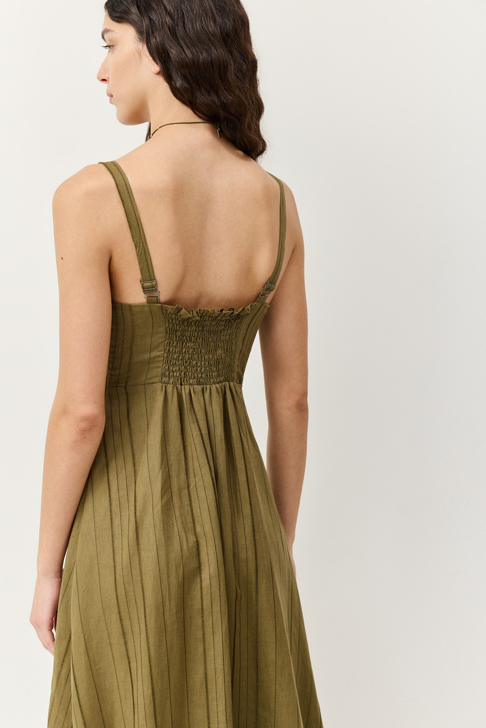 שמלת מידי בגוון זית חם עם וייב בוהו־אורבני מדויק. בגזרת כתפיות דקות עם מפתח וי מחמיא וחיתוך מתחת לחזה שמדגיש את הסילואטה בצורה רכה ונשית. החלק העליון צמוד ומעוצב בקפלים עדינים, ובגב כיווצים אלסטיים שמעניקים התאמה מושלמת ונוחות לאורך כל היום. החצאית נשפכת באורך מידי עם נפח טבעי וסיומת מלמלה שמוסיפה תנועה קלילה בכל צעד. הבד קליל ואוורירי, מושלם לימים חמים בעיר או לחופשה ספונטנית.