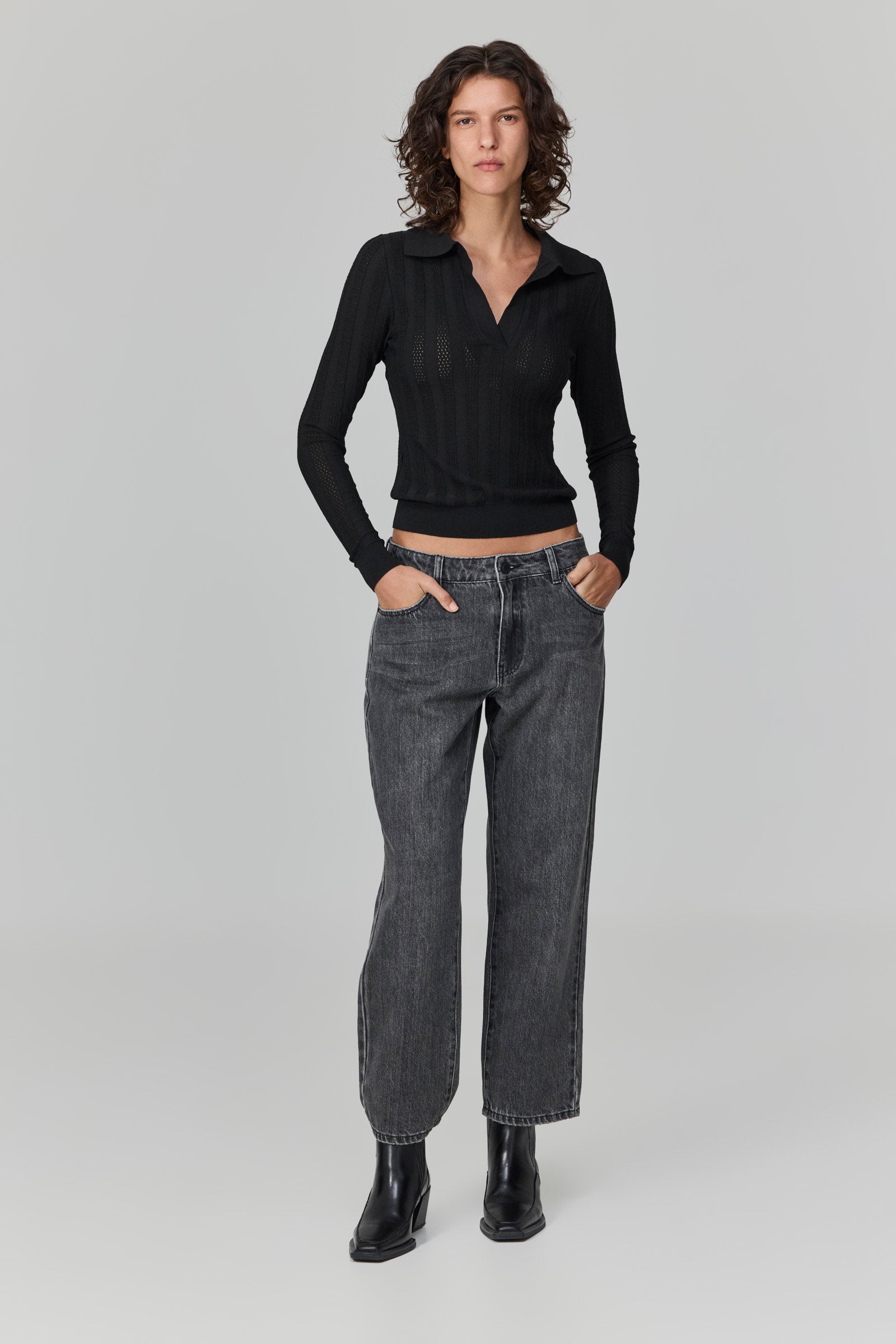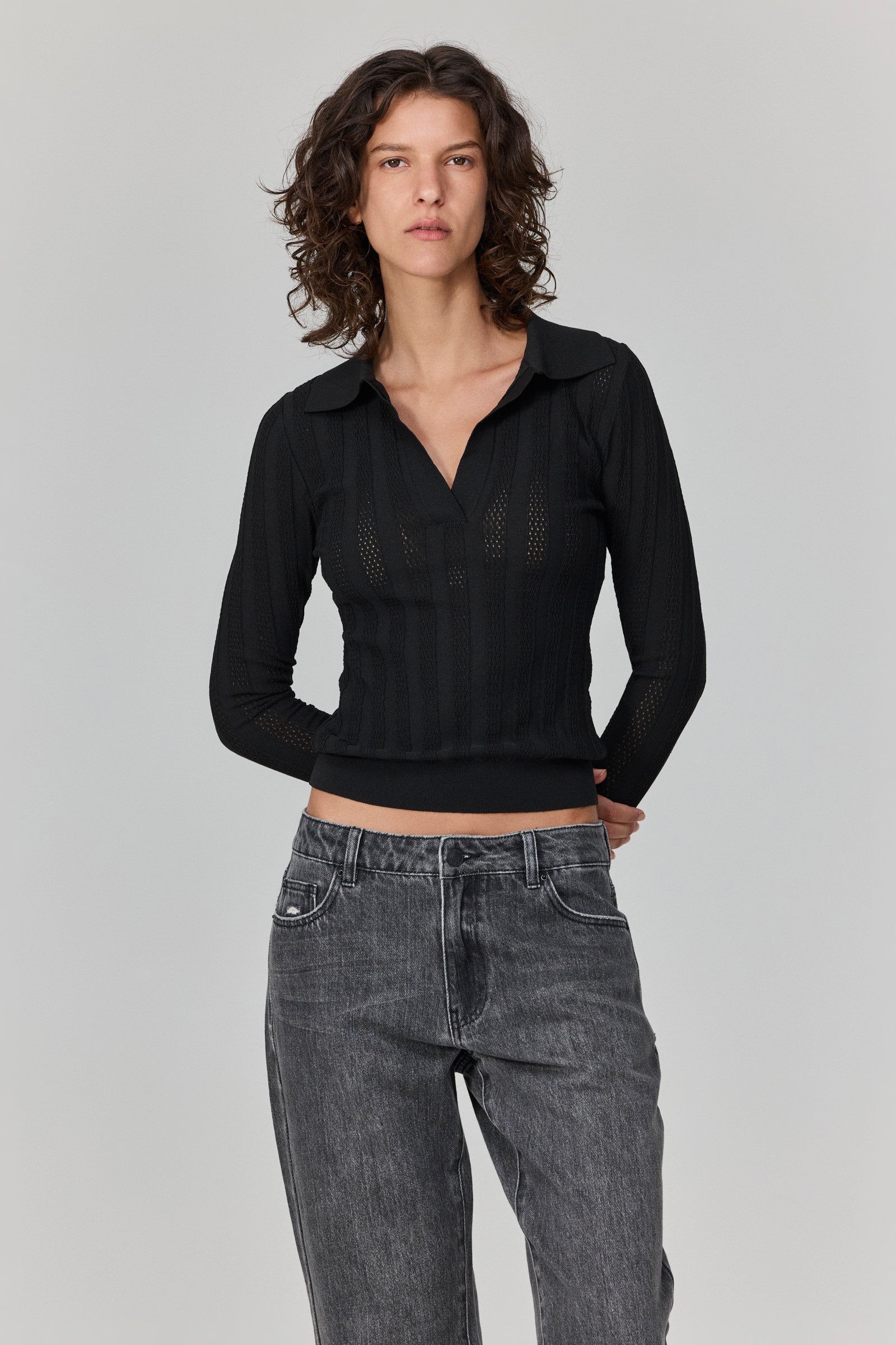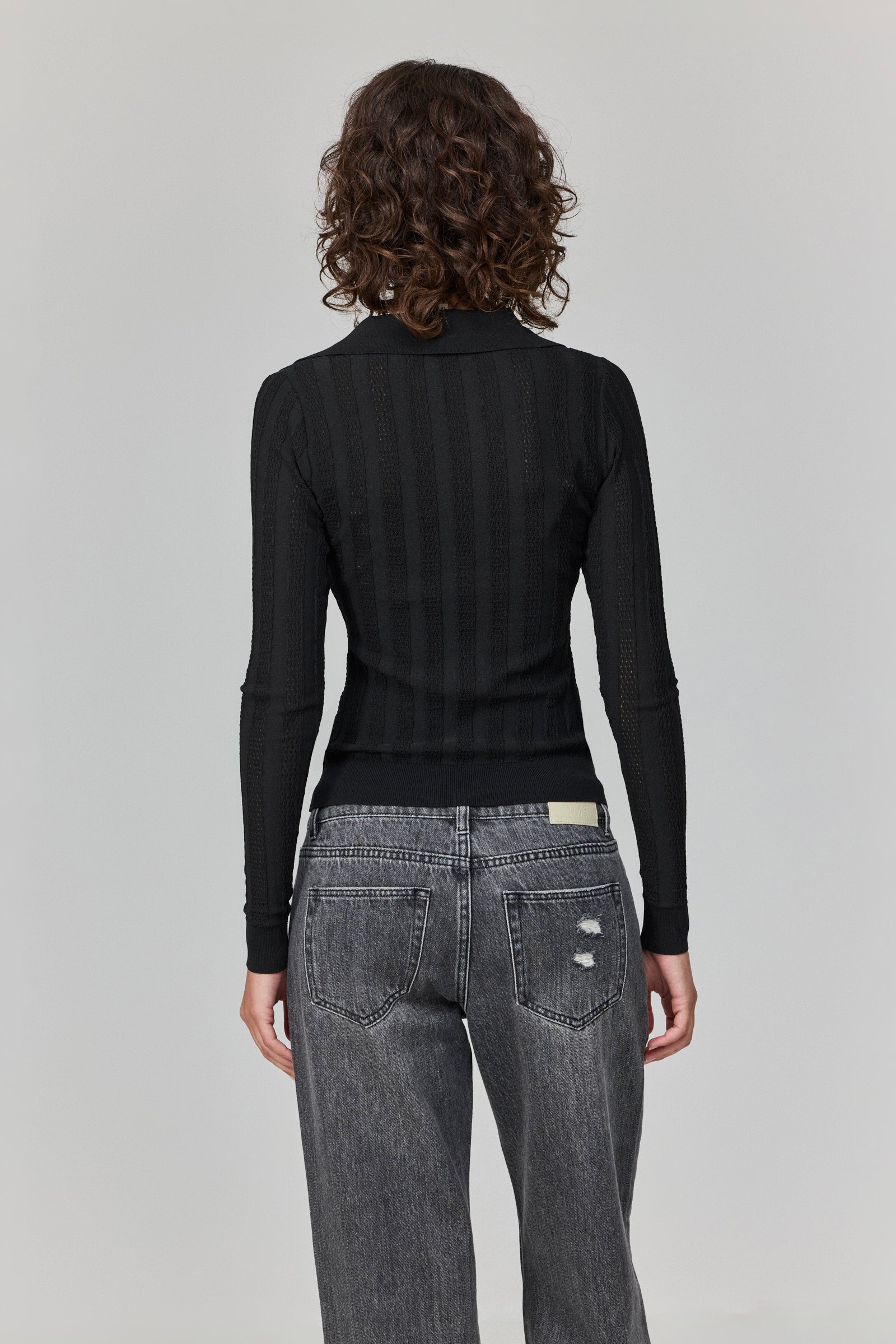 חולצת פולו שחורה עם צווארון קלאסי, בגזרת פיט קרובה לגוף שמדגישה את הסילואט במדויק. סריגת הפסים השקופה מוסיפה עומק וטקסטורה עדינה, שמעניקה לפריט מראה אלגנטי עם קריצה נועזת.