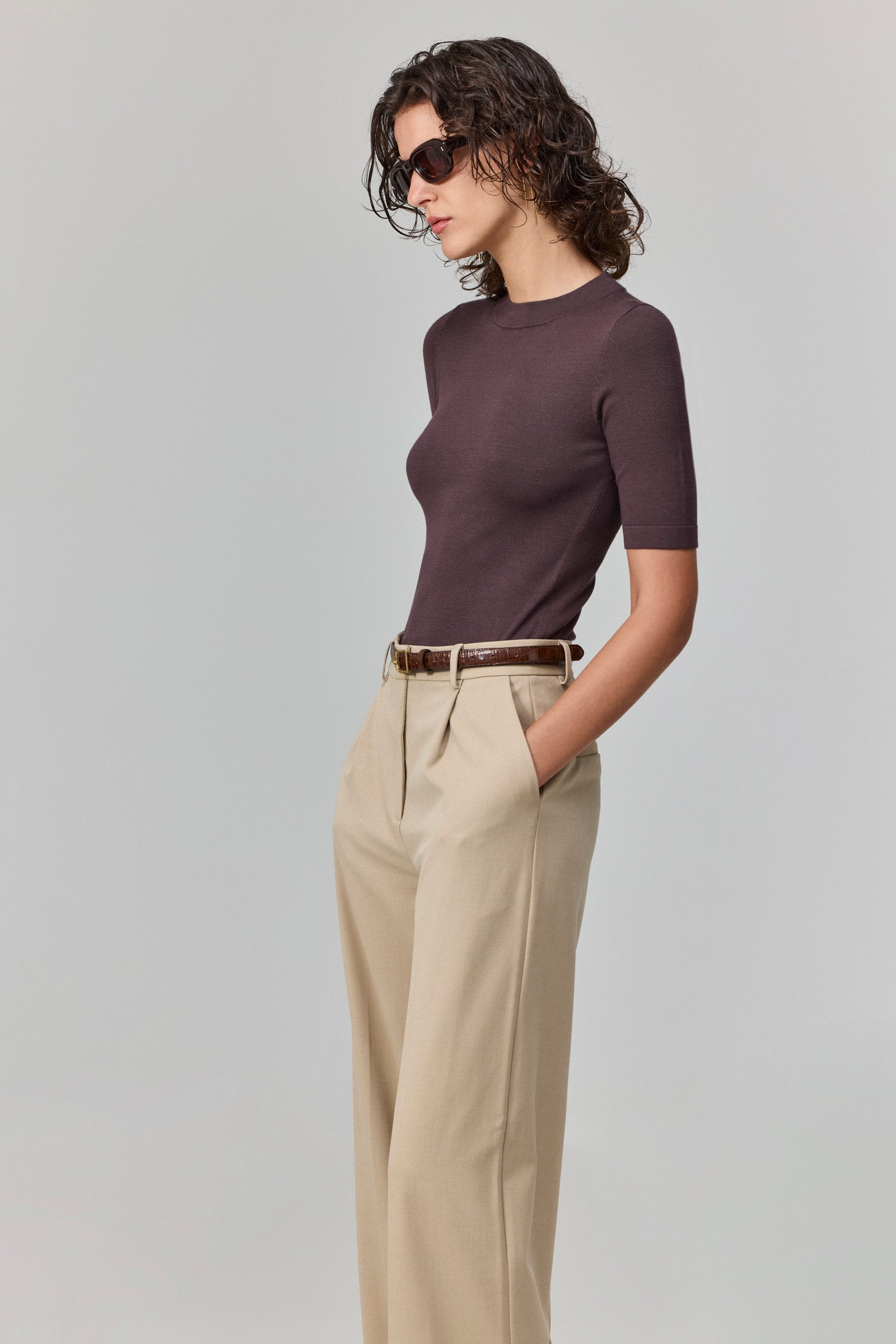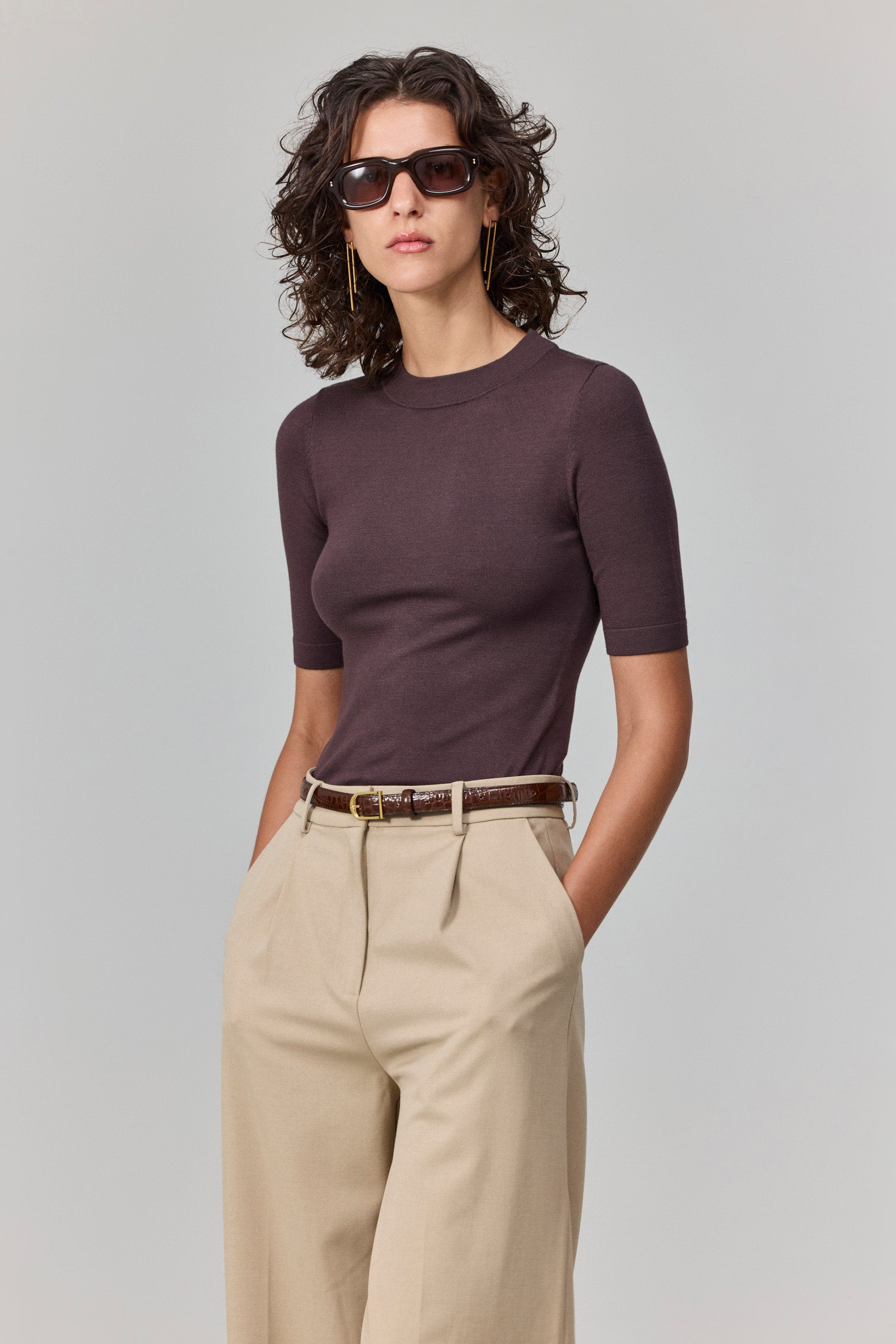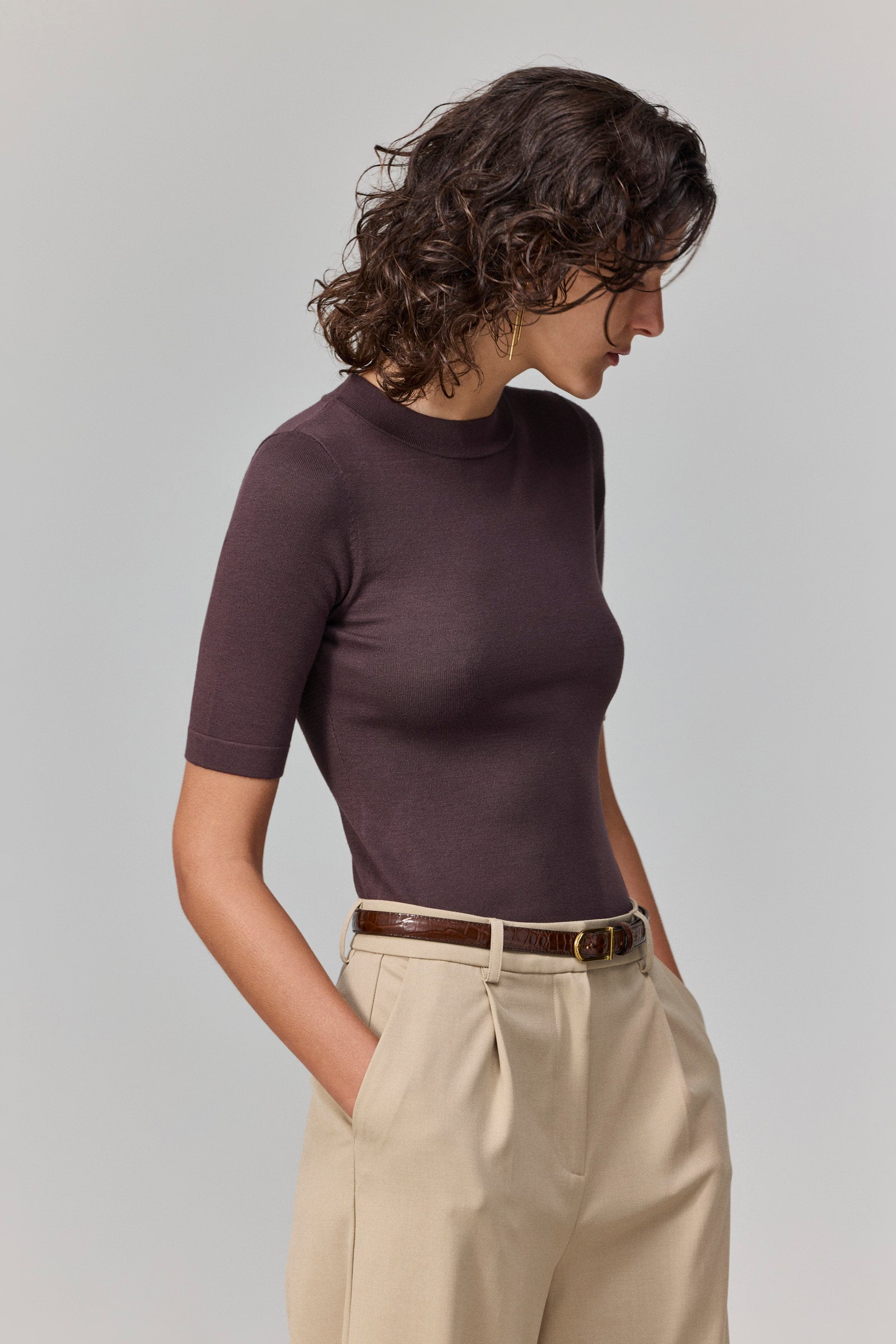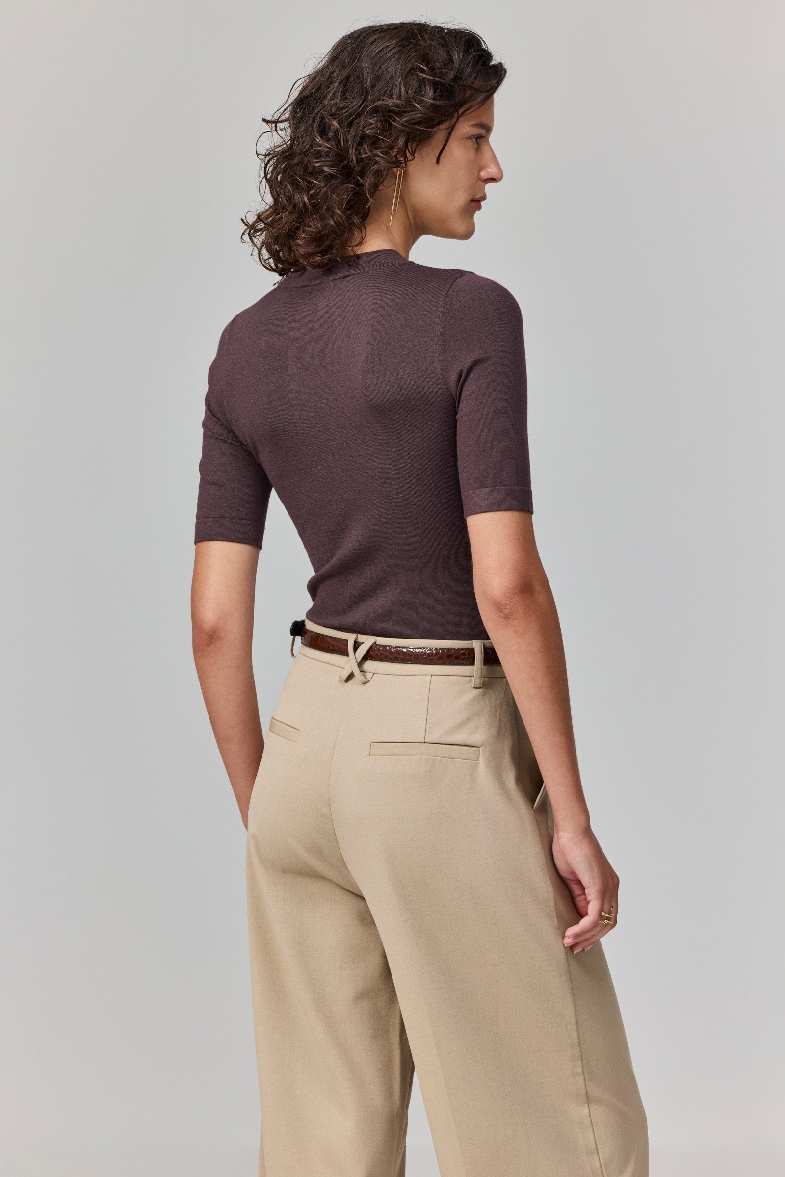 סריג דק, נעים ויומיומי. גזרה צמודה, צווארון ניקי סגור ושרוולים עד מעל למרפק.