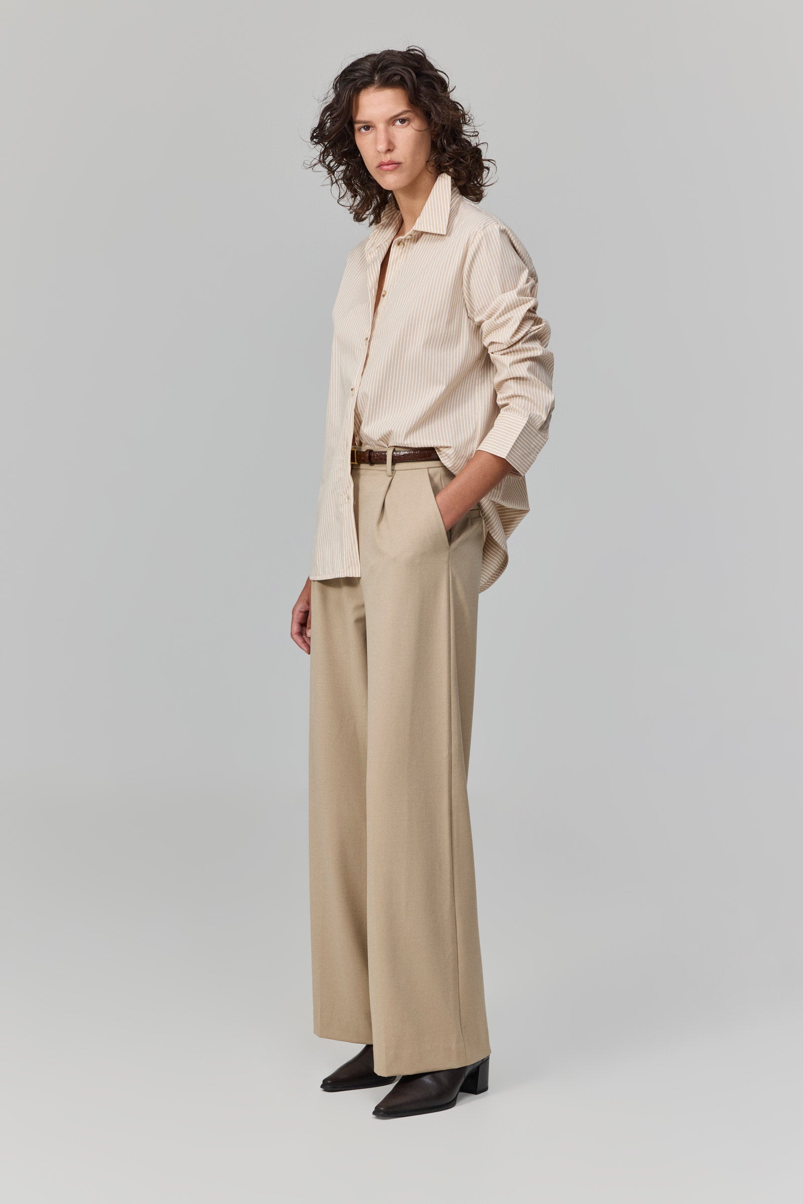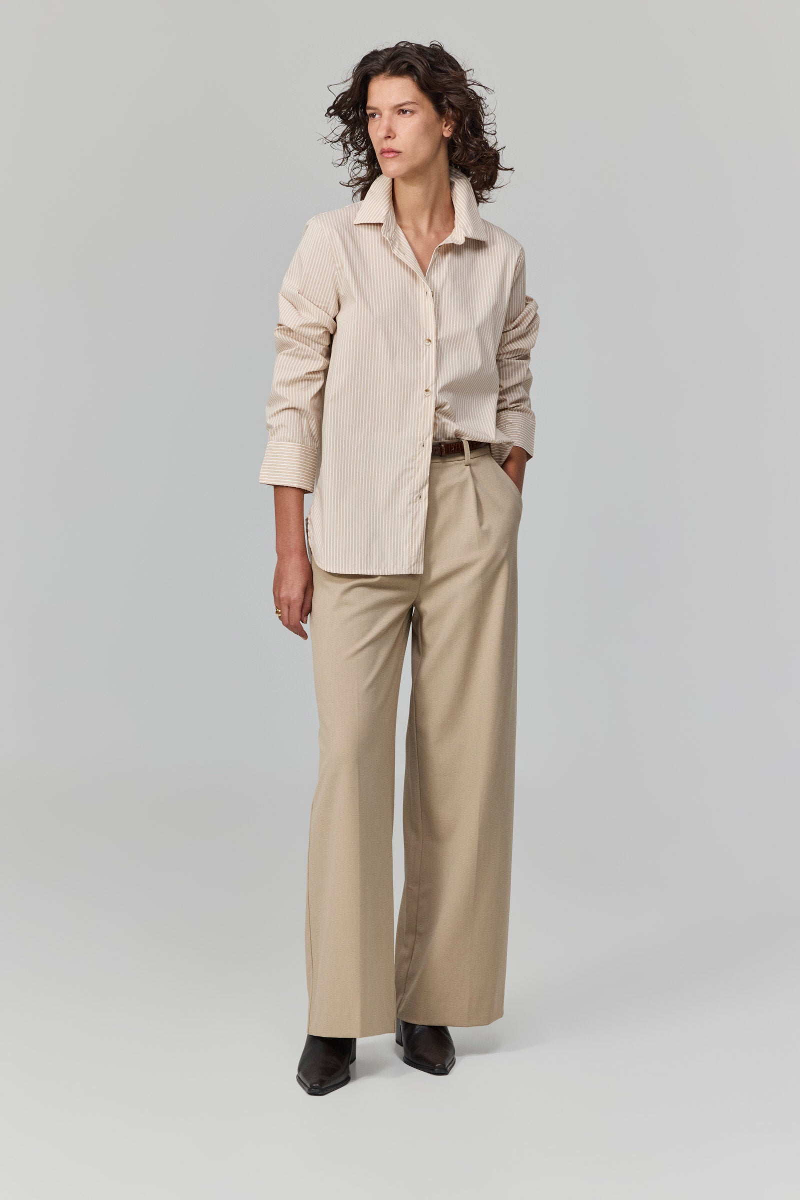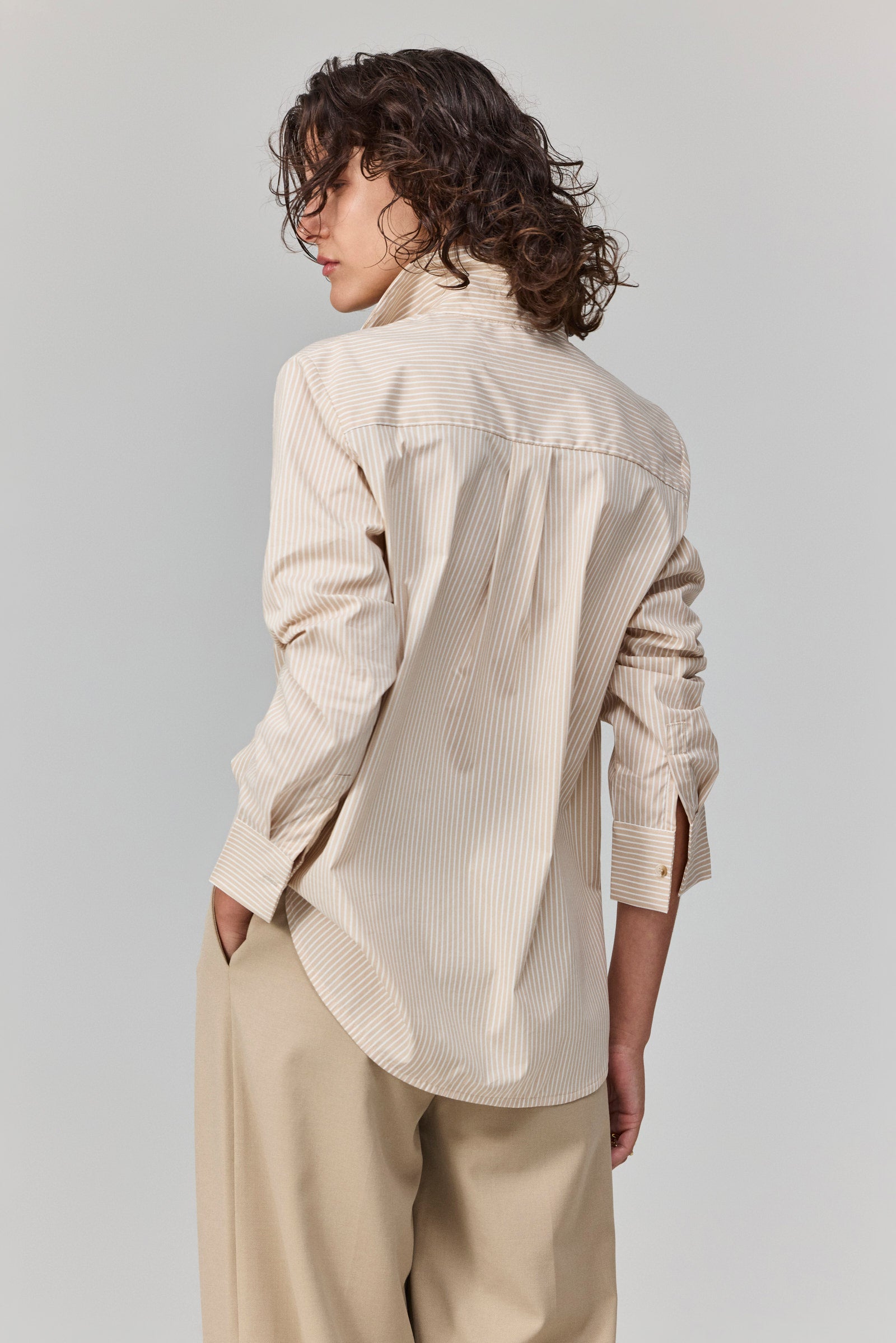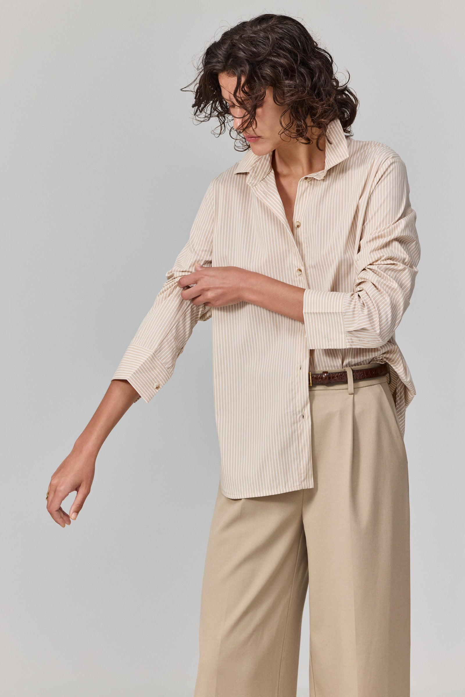 חולצת כפתורים אוברסייז פסים בגוון בז’ רך, עם גזרה קלילה שמביאה איתה את כל מה שמכופתרת אמורה להיות – נקייה ואלגנטית. הקווים המדויקים והצווארון המחודד מעניקים לה מראה מחויט. חולצה שהיא בסיס אמיתי לארון יוקרתי: משתלבת עם מכנסיים מחויטים, חצאיות קלאסיות או אפילו ג’ינס כהה – ותמיד נראית נכונה.