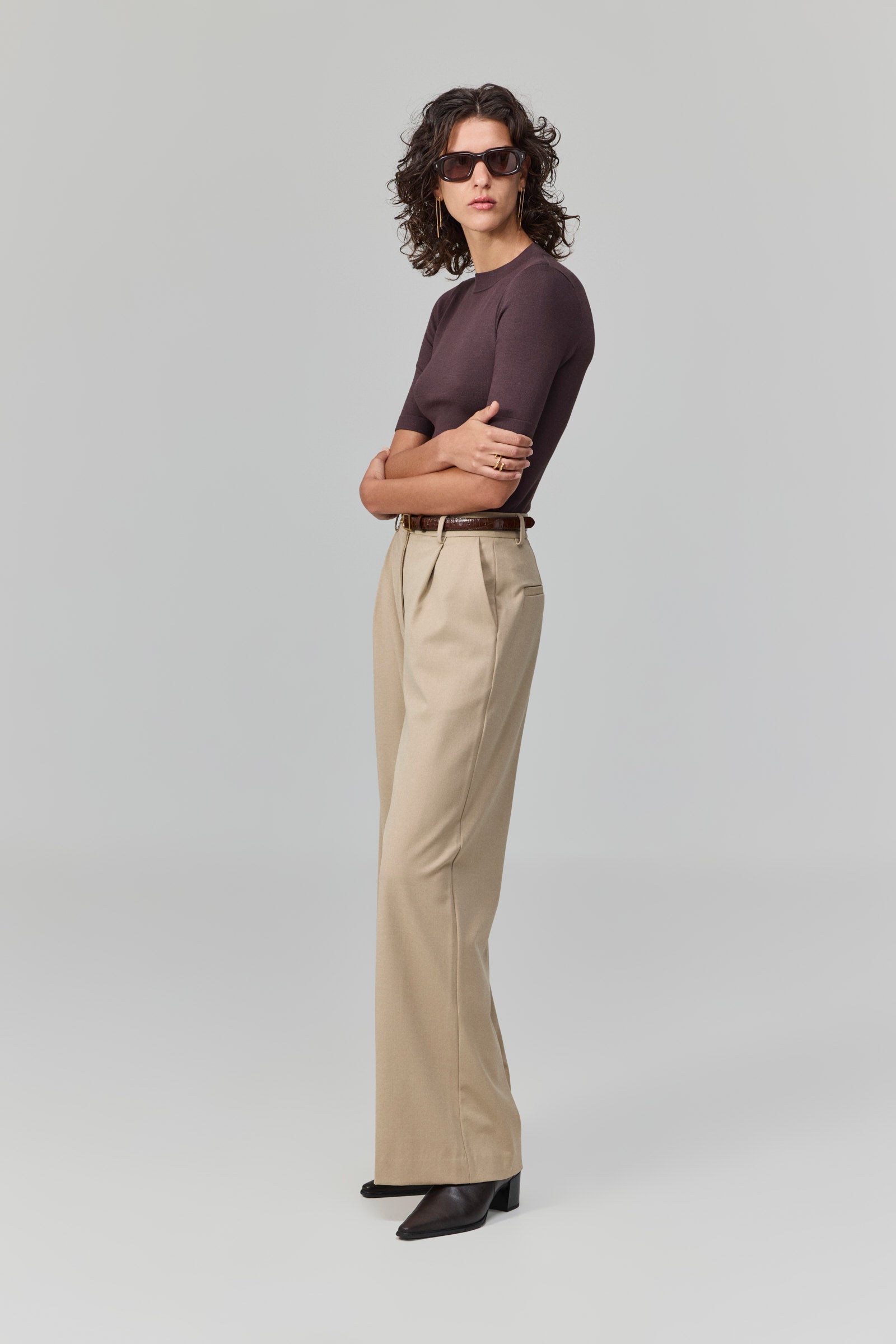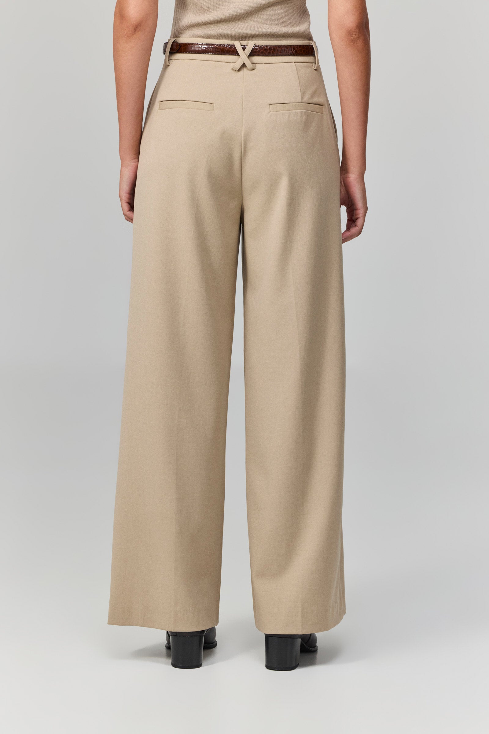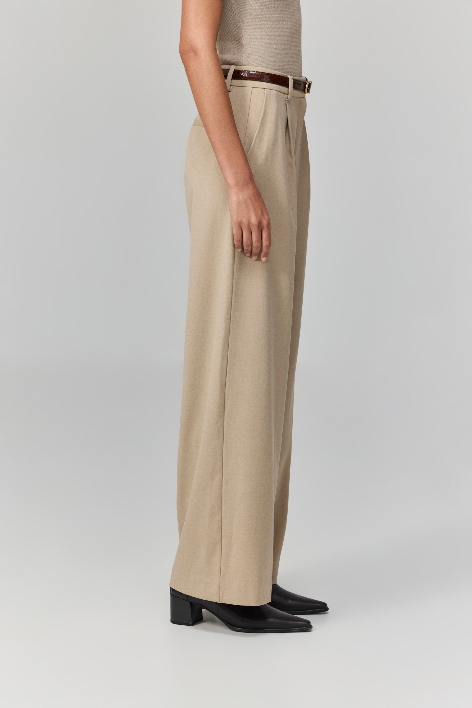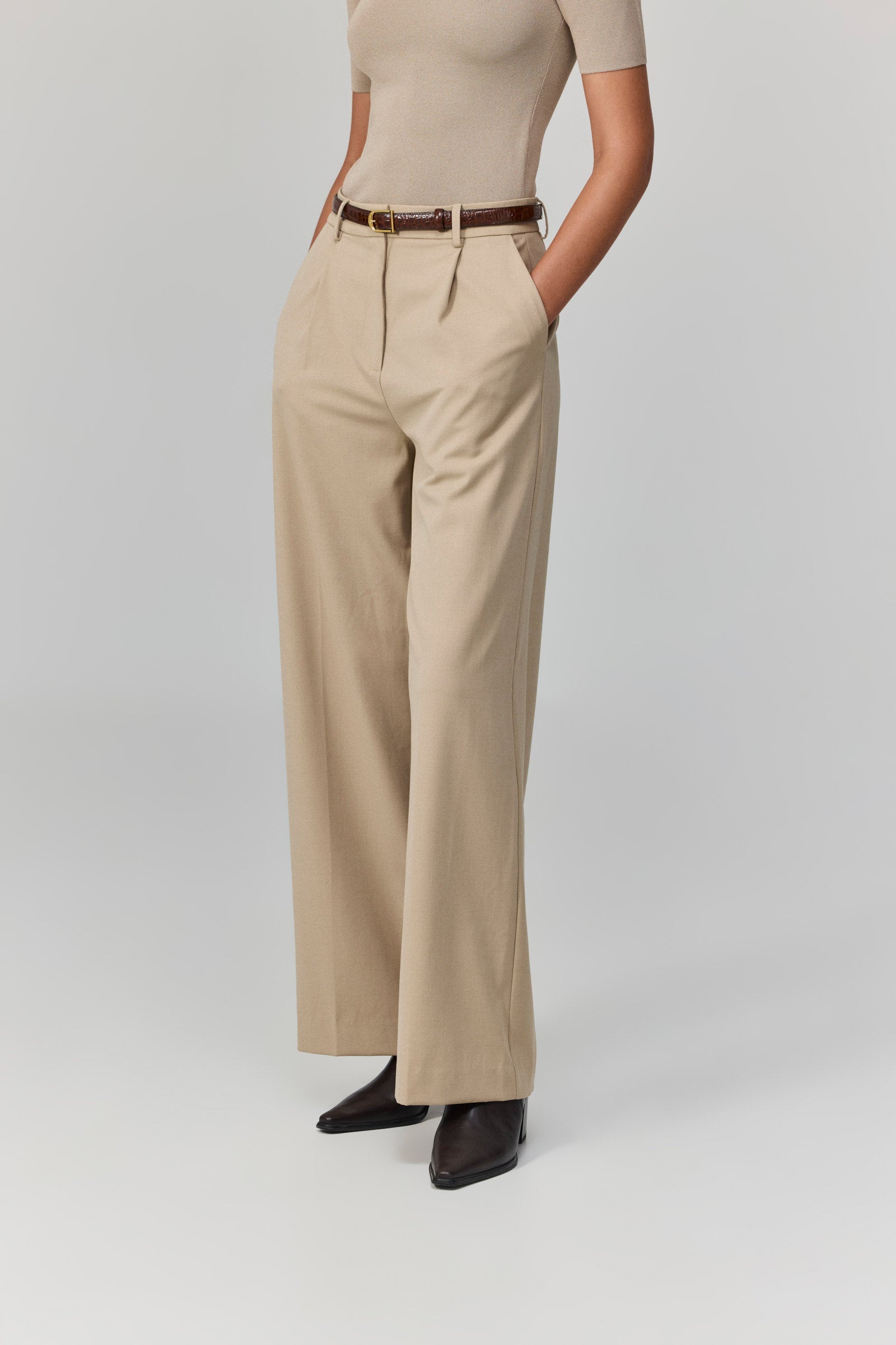מכנסיים רחבים בגוון בז’ בהיר, עם קפלים קדמיים ונפילה רכה שמעניקה תחושת זרימה ותנועה חופשית. הגזרה הגבוהה מחמיאה לגוף ומאריכה את הצללית, בעוד שהבד האלגנטי שומר על מראה מוקפד ויוקרתי.