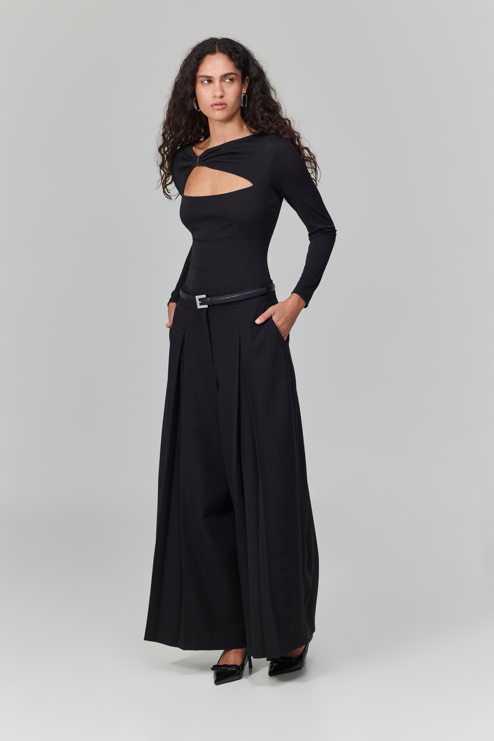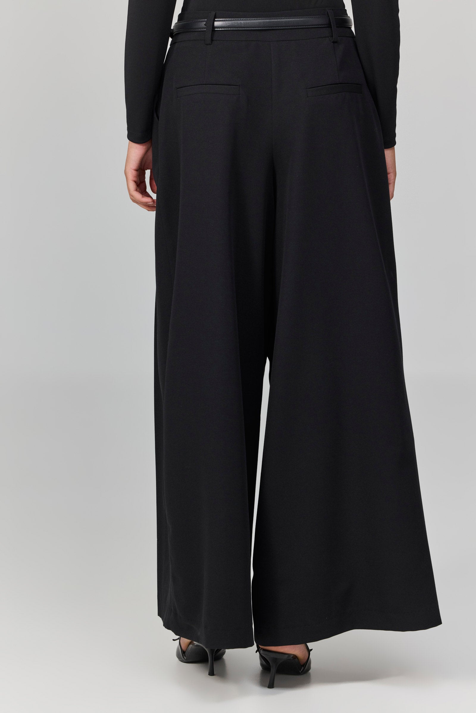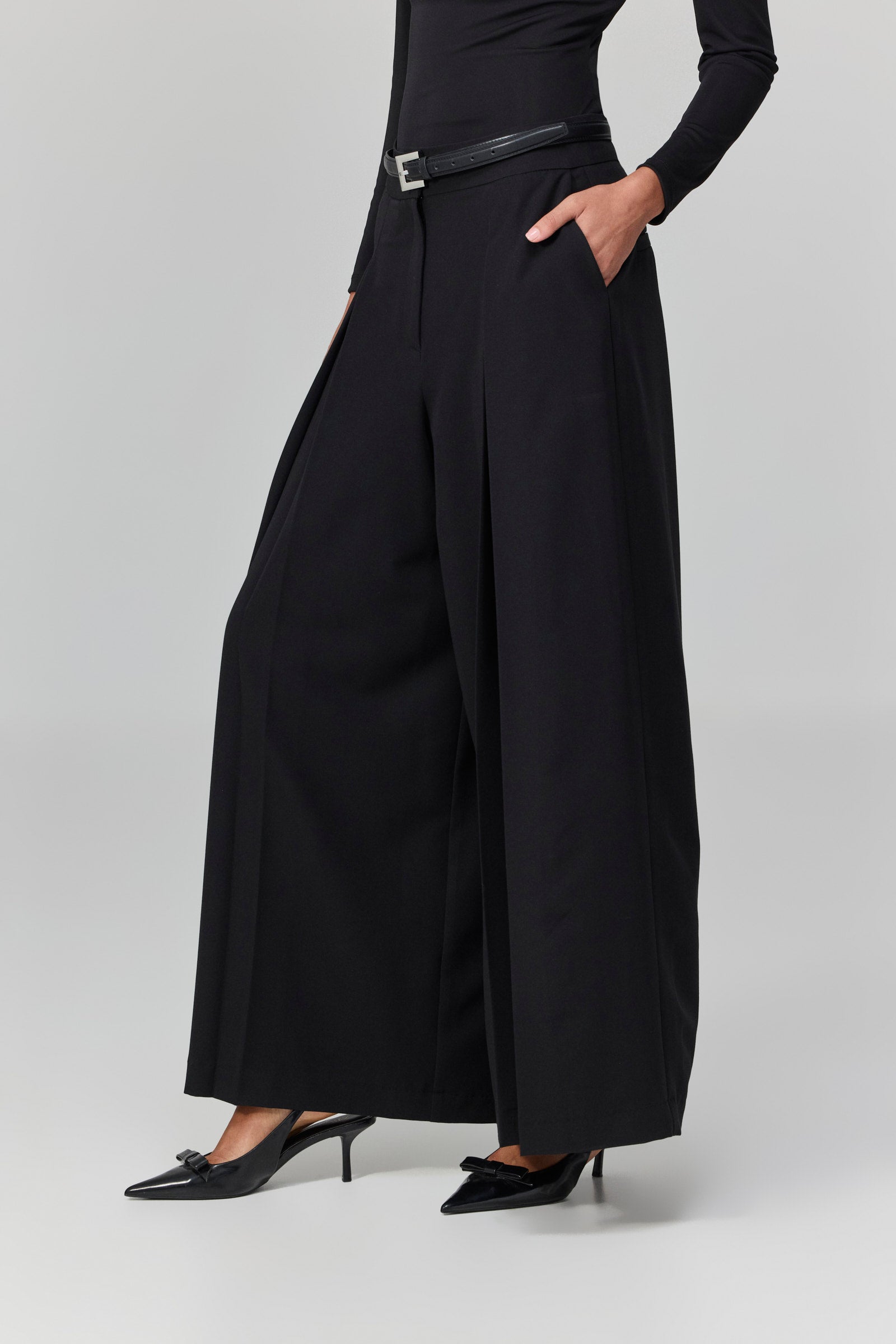 מכנסיים בגזרה דרמטית במיוחד, עם מותן גבוהה וקפלים נפגשים עמוקים שמעניקים סילואט מוגזם ואלגנטי בו־זמנית. הבד הנוזלי והנפילה המדויקת יוצרים תנועה מרשימה שמושכת תשומת לב בכל צעד. זהו פריט סטייטמנט.