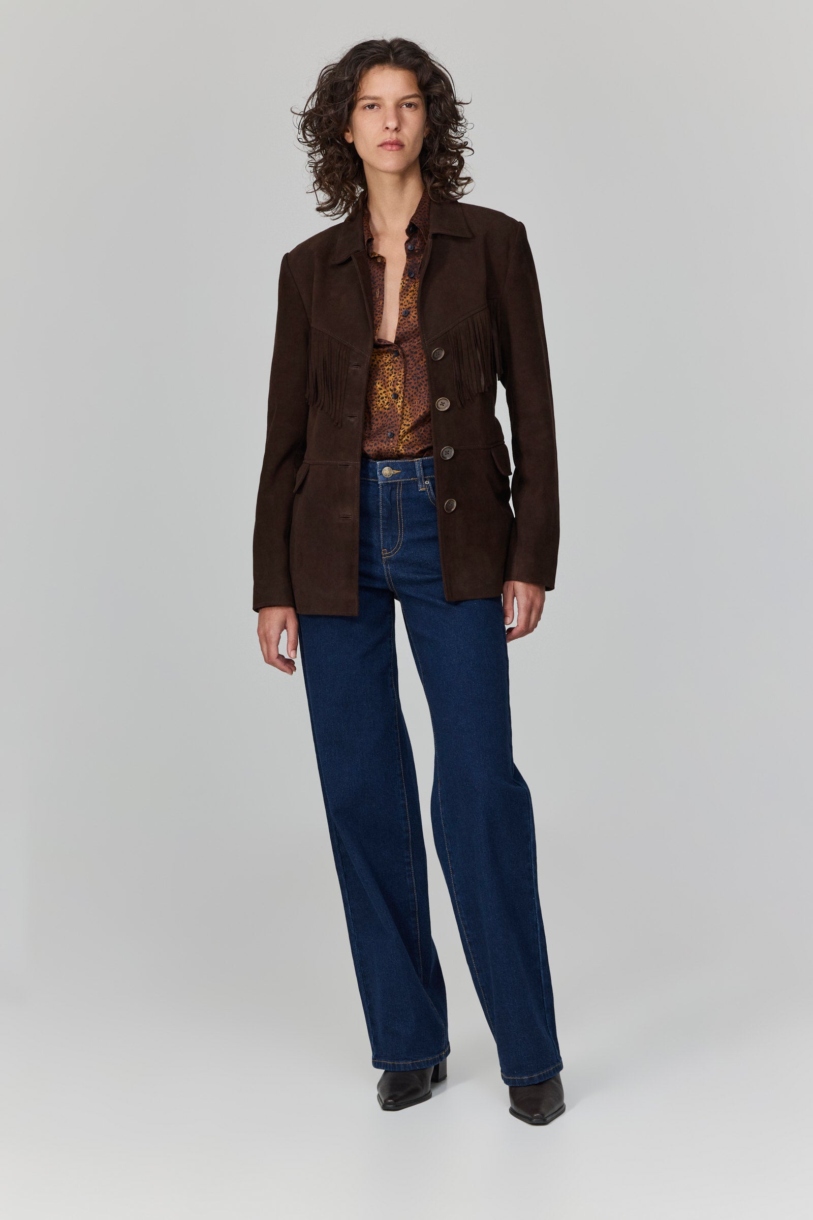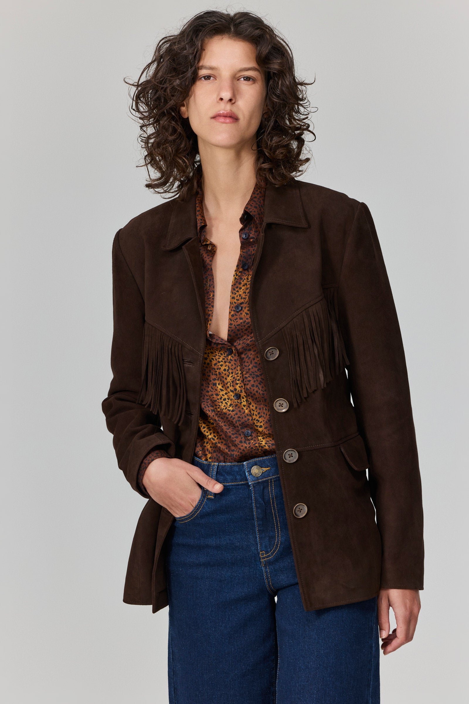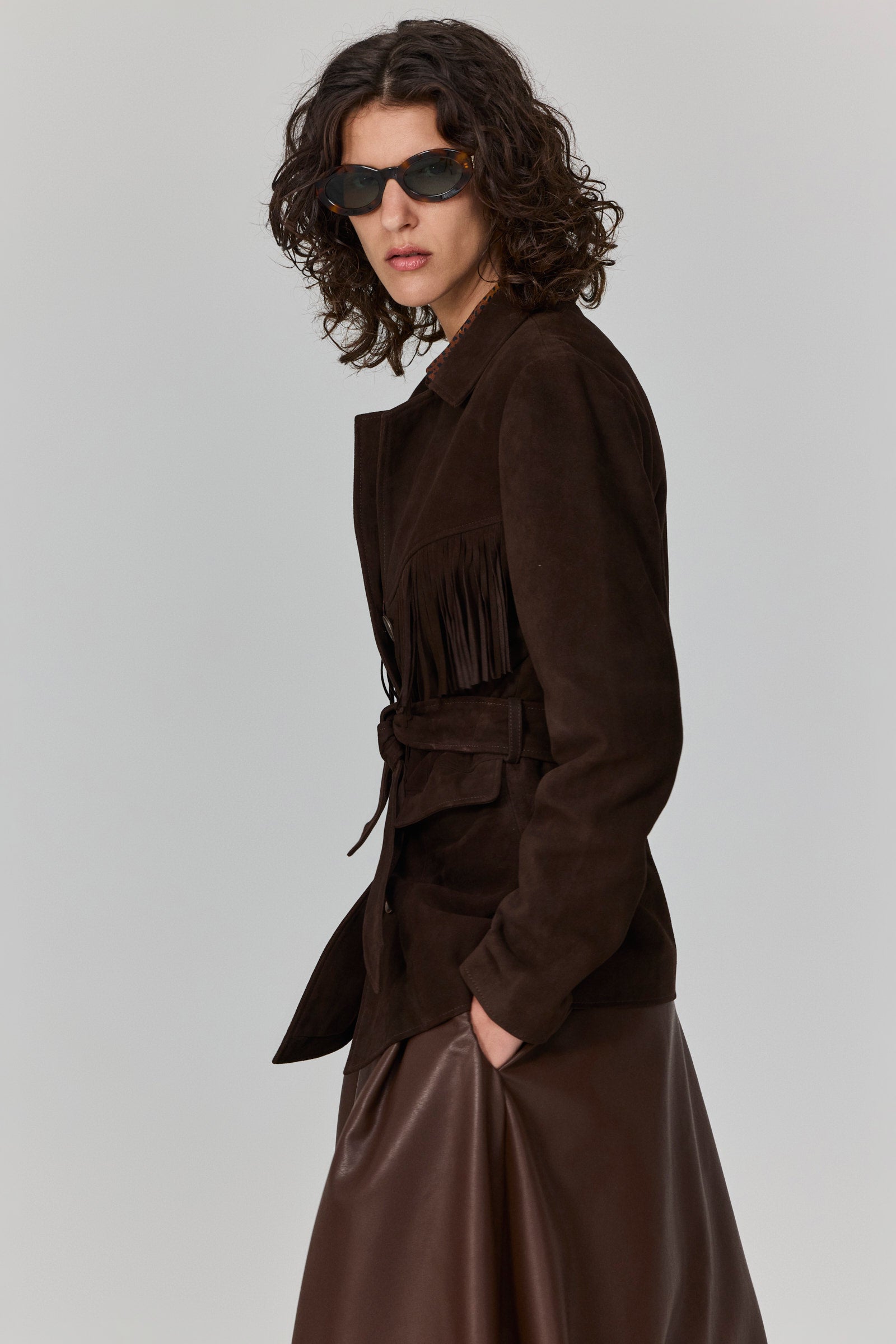 ז'קט מהמערב הפרוע – ז'קט זמש חום עם פרנזים דרמטיים בחזית, כפתורים גדולים וחגורה נקשרת במותן. השראה ישירה מעולם המערבונים, עם טוויסט עכשווי ואלגנטי. פריט שמכניס אופי וביטחון לכל הופעה, ומוסיף נגיעה שוברת שגרה בלב העיר.