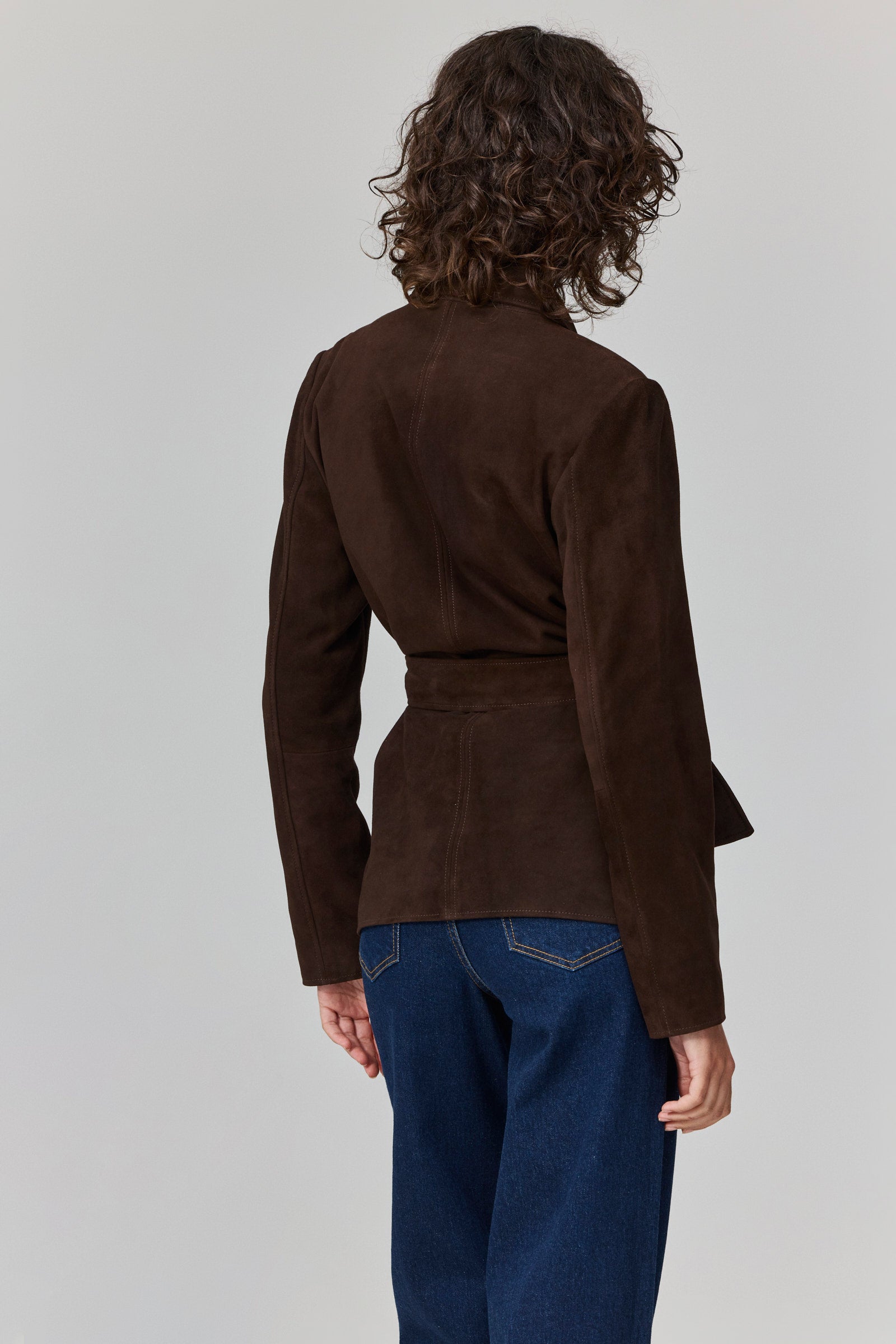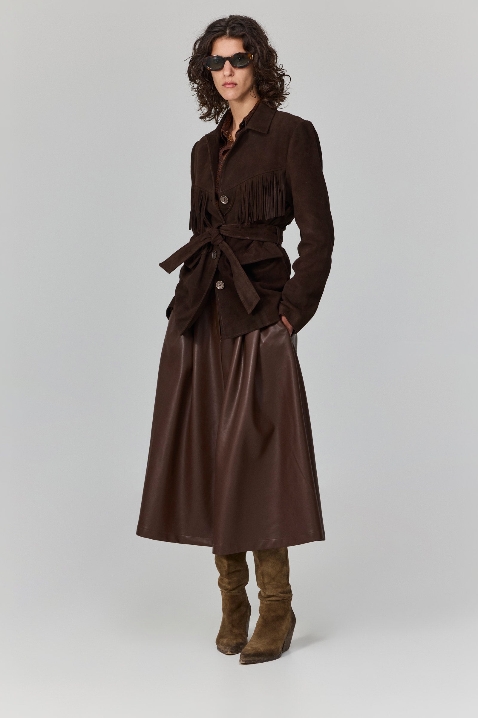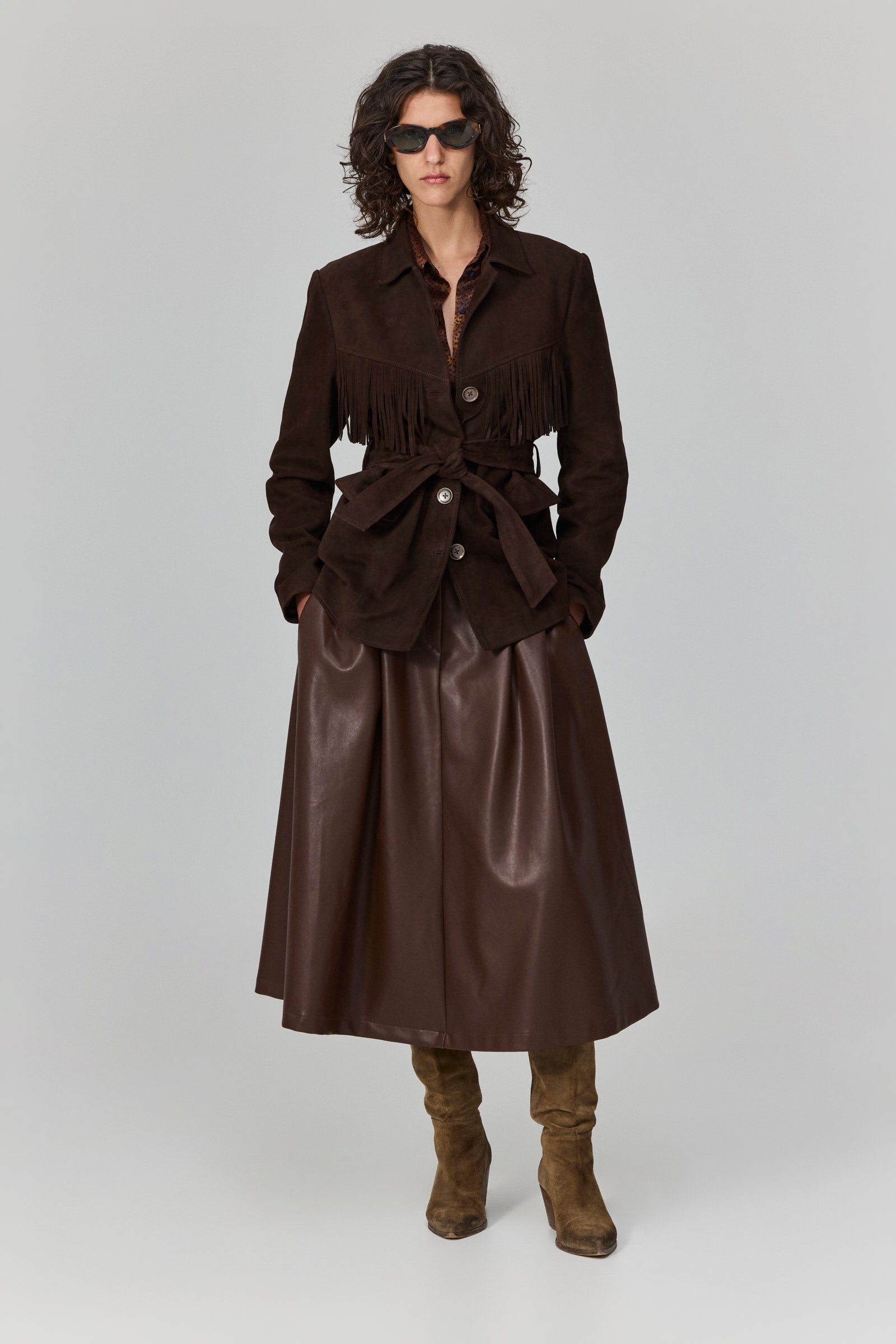 ז'קט מהמערב הפרוע – ז'קט זמש חום עם פרנזים דרמטיים בחזית, כפתורים גדולים וחגורה נקשרת במותן. השראה ישירה מעולם המערבונים, עם טוויסט עכשווי ואלגנטי. פריט שמכניס אופי וביטחון לכל הופעה, ומוסיף נגיעה שוברת שגרה בלב העיר.