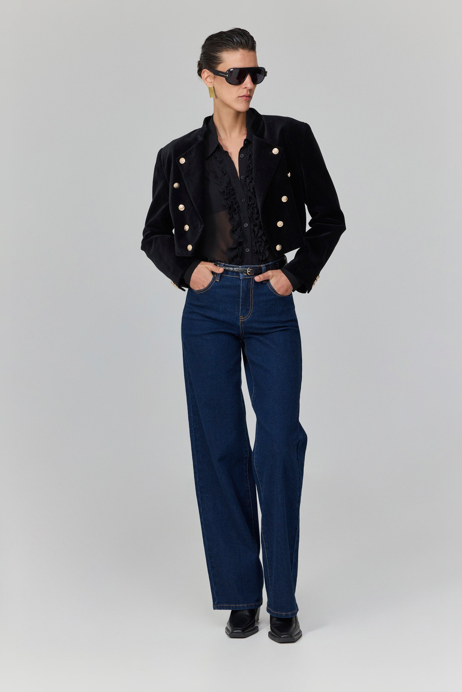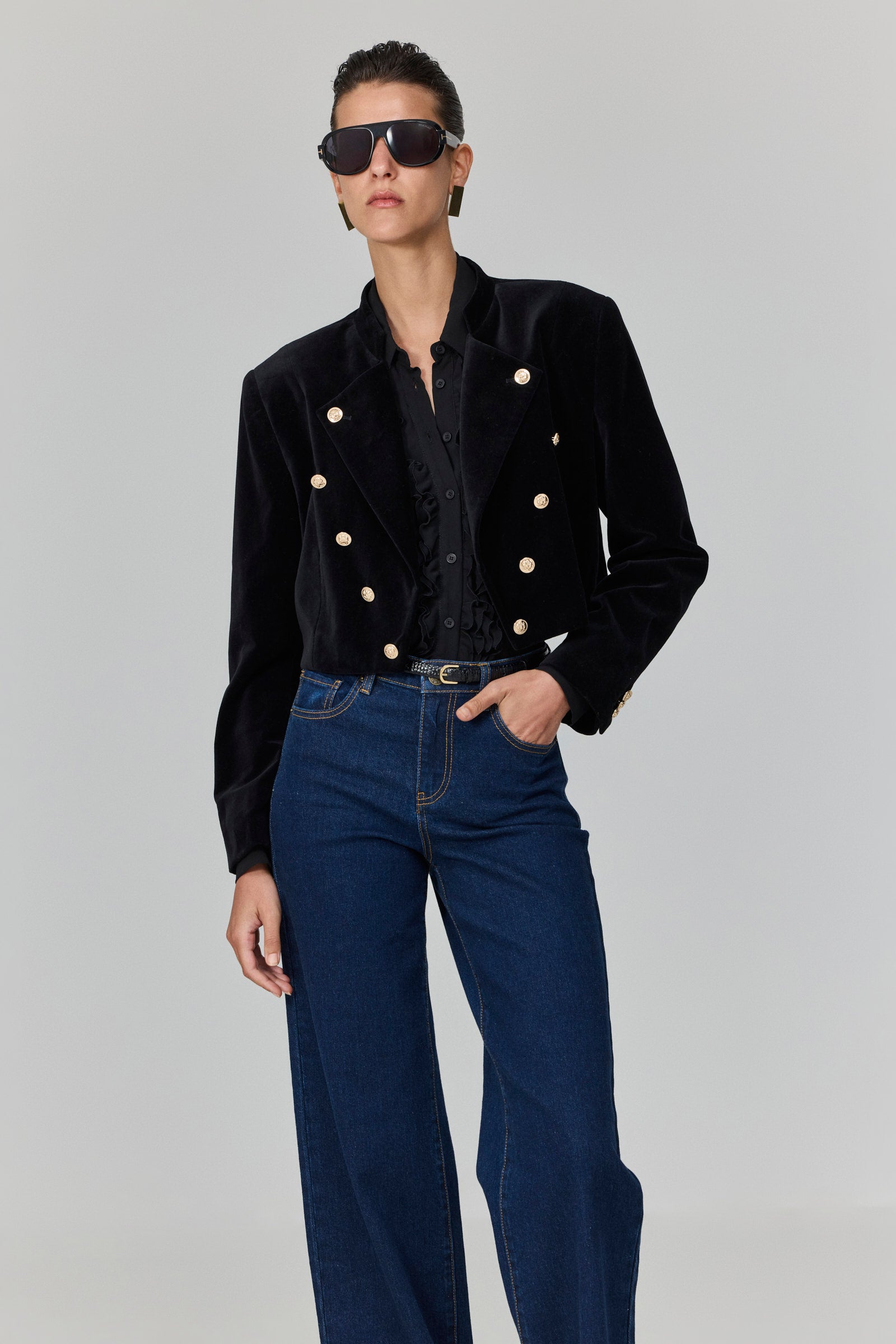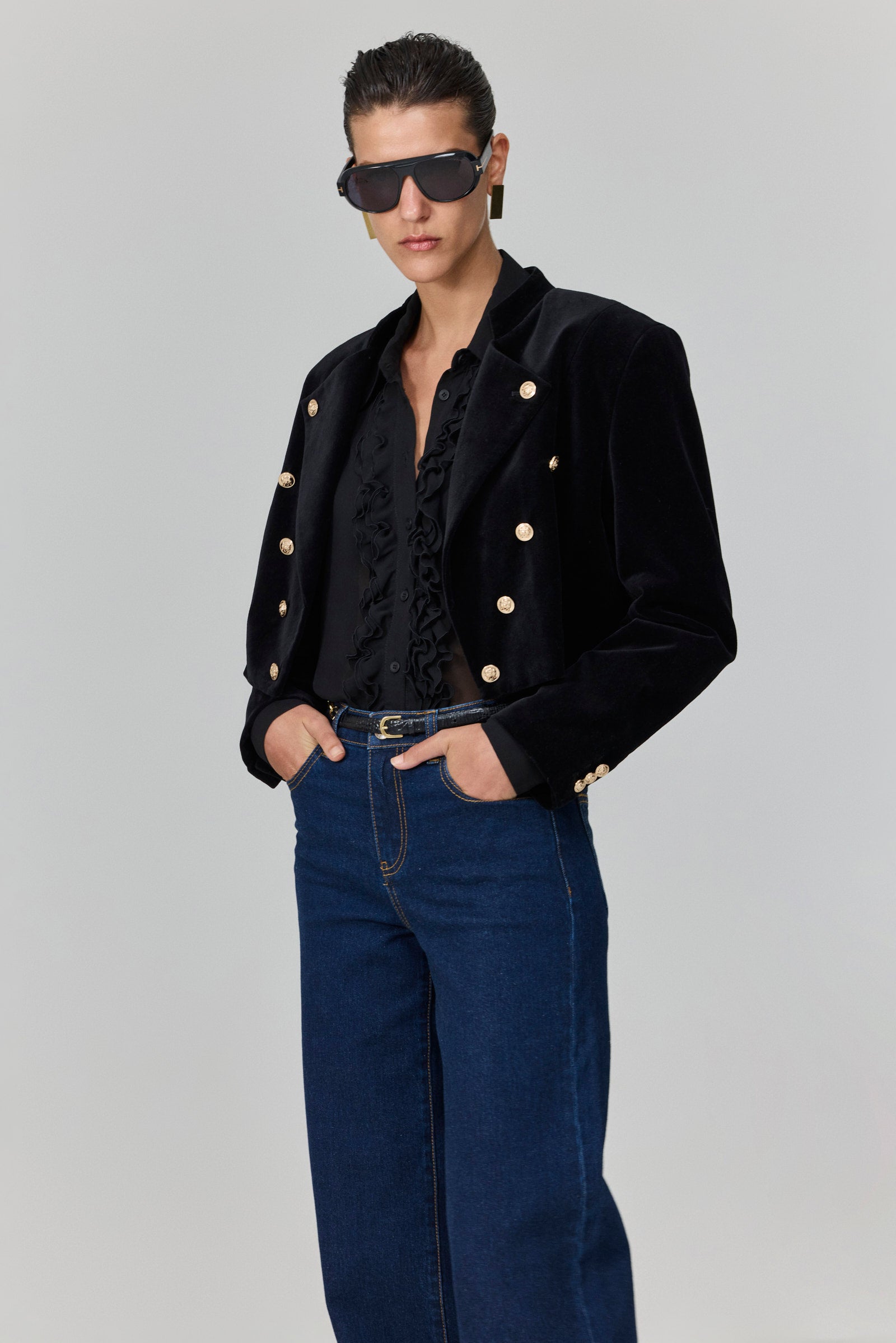 ז׳קט קטיפה שחור בגזרת קרופ מחויטת, עם שורת כפתורי מתכת מוזהבים כפולים בחזית ובשרוולים.