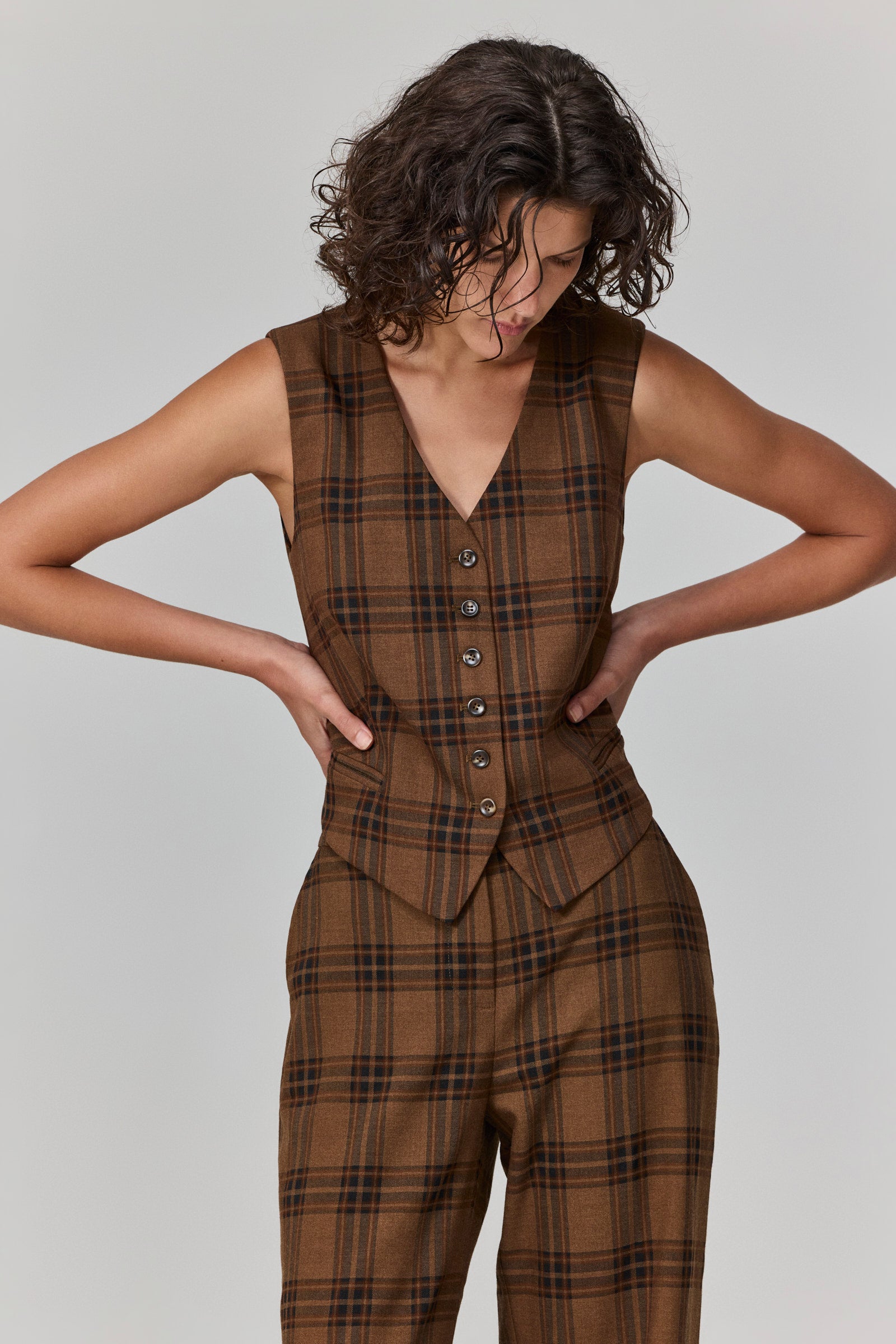 וסט מחויט בגזרת V עמוקה עם כפתרה קדמית, בהדפס משבצות קלאסי בגווני חום. הגזרה המדויקת והחיתוכים בצדדים יוצרים מראה חד ואסוף, כזה שמצליח לשלב בין שיק גברי לאלגנטיות נשית. פריט שמוסיף תחכום לכל הופעה – בין אם לובשים אותו לבד, מעל חולצה מכופתרת או כסט עם המכנסיים והז’קט התואמים.