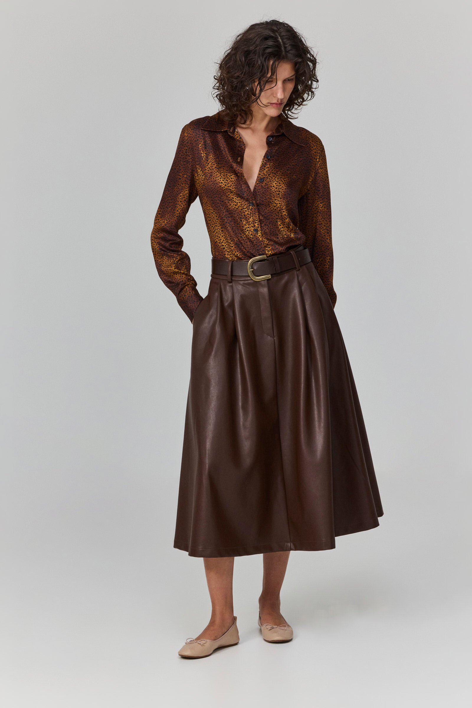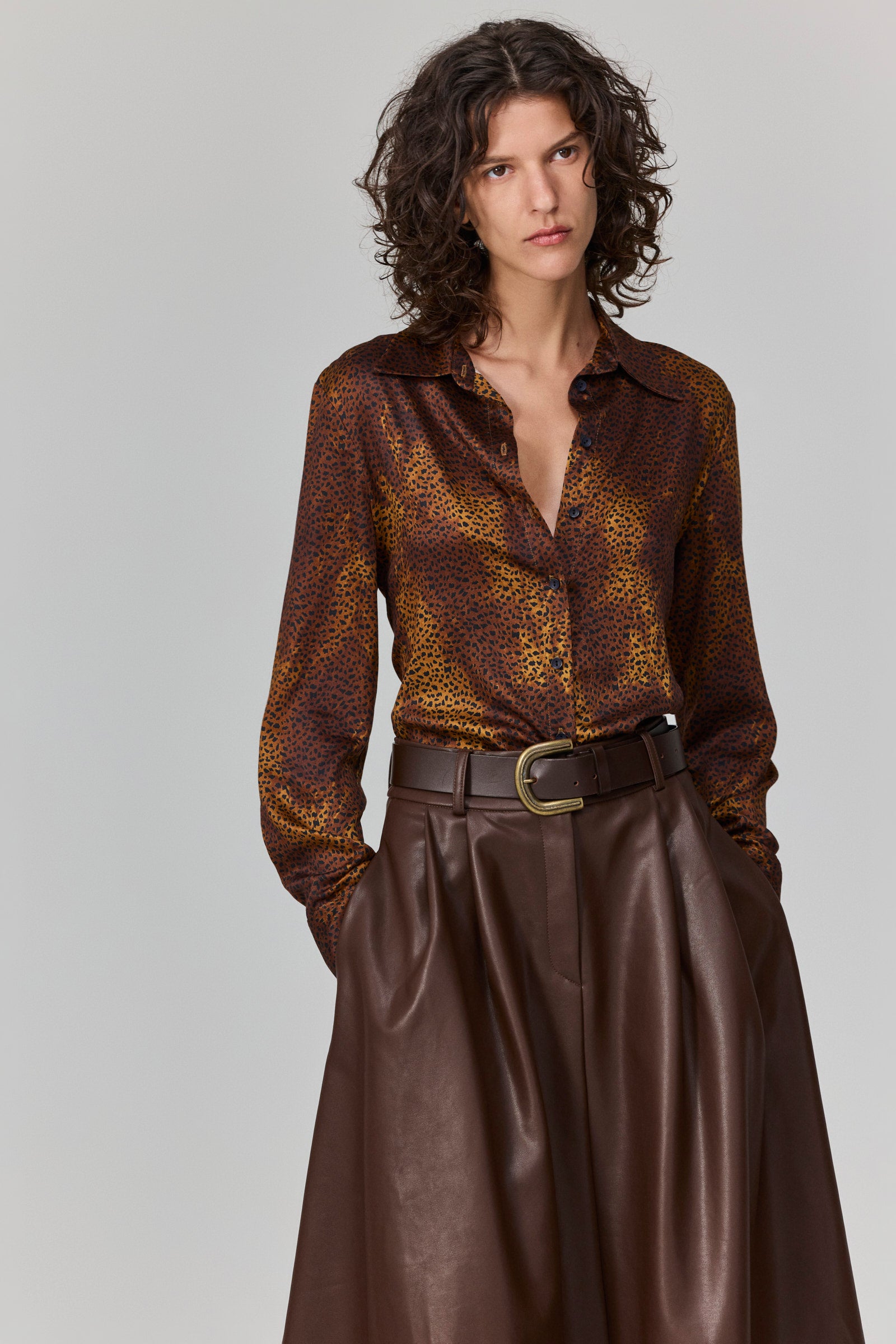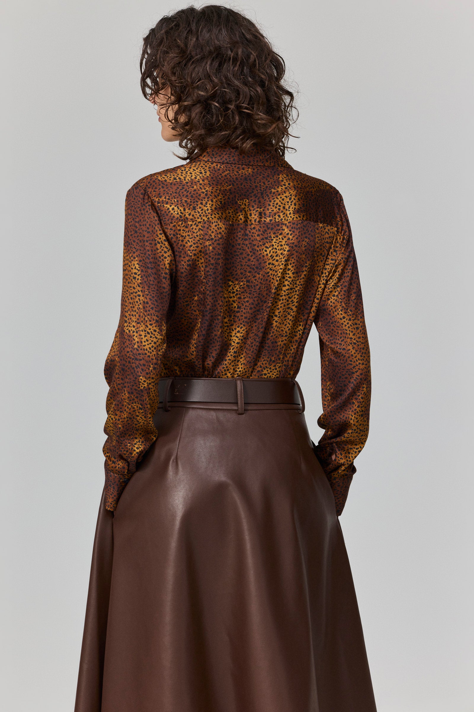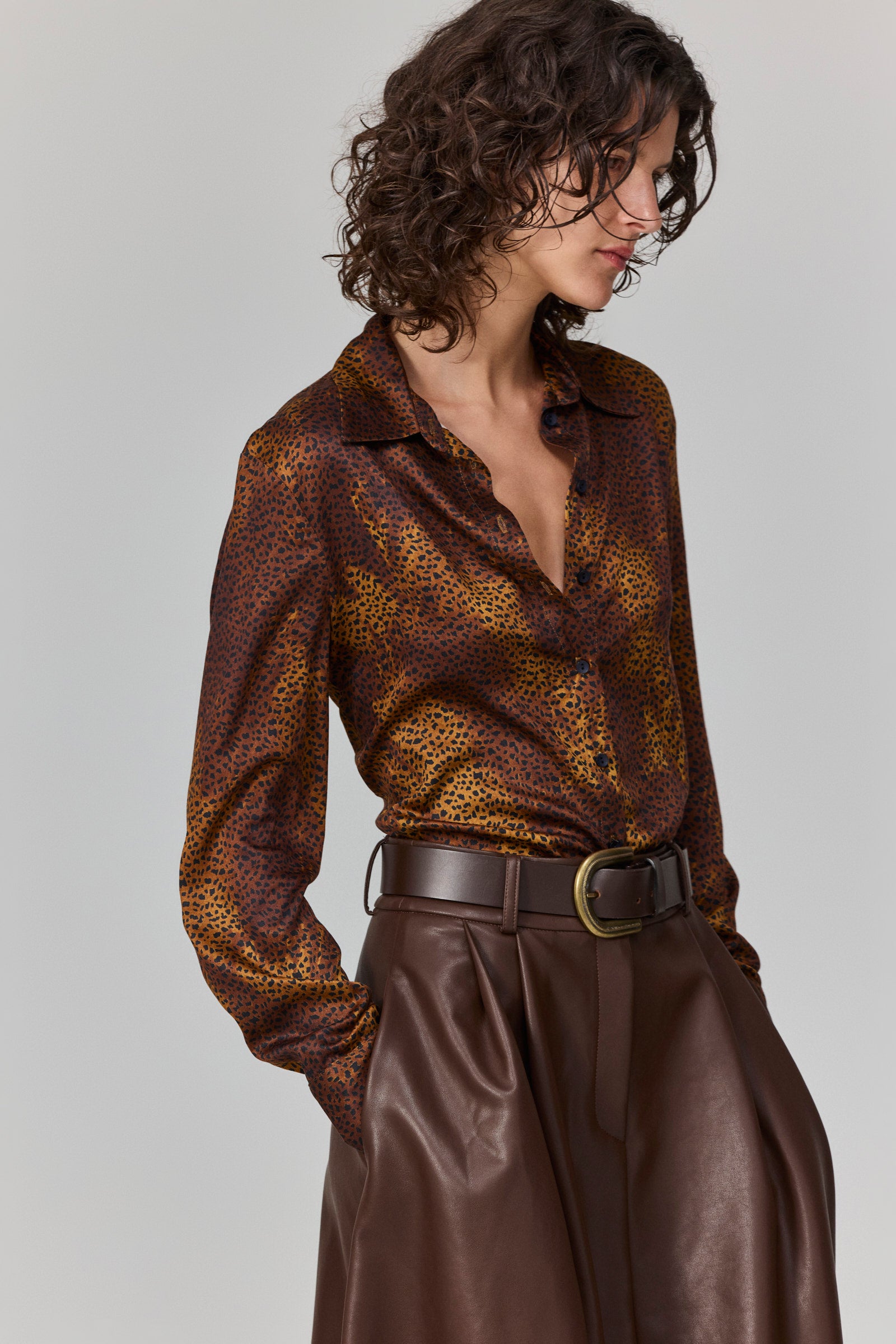 חולצה מכופתרת בגזרה רכה עם הדפס מנומר עדין בגווני חום־זהב, שמוסיף עומק ועניין מבלי להשתלט. הבד נשפך ונעים על הגוף, המפתח הקדמי יוצר קו נשי ולא מתאמץ, והשרוולים הארוכים מאזנים בין פראיות לאלגנטיות. .