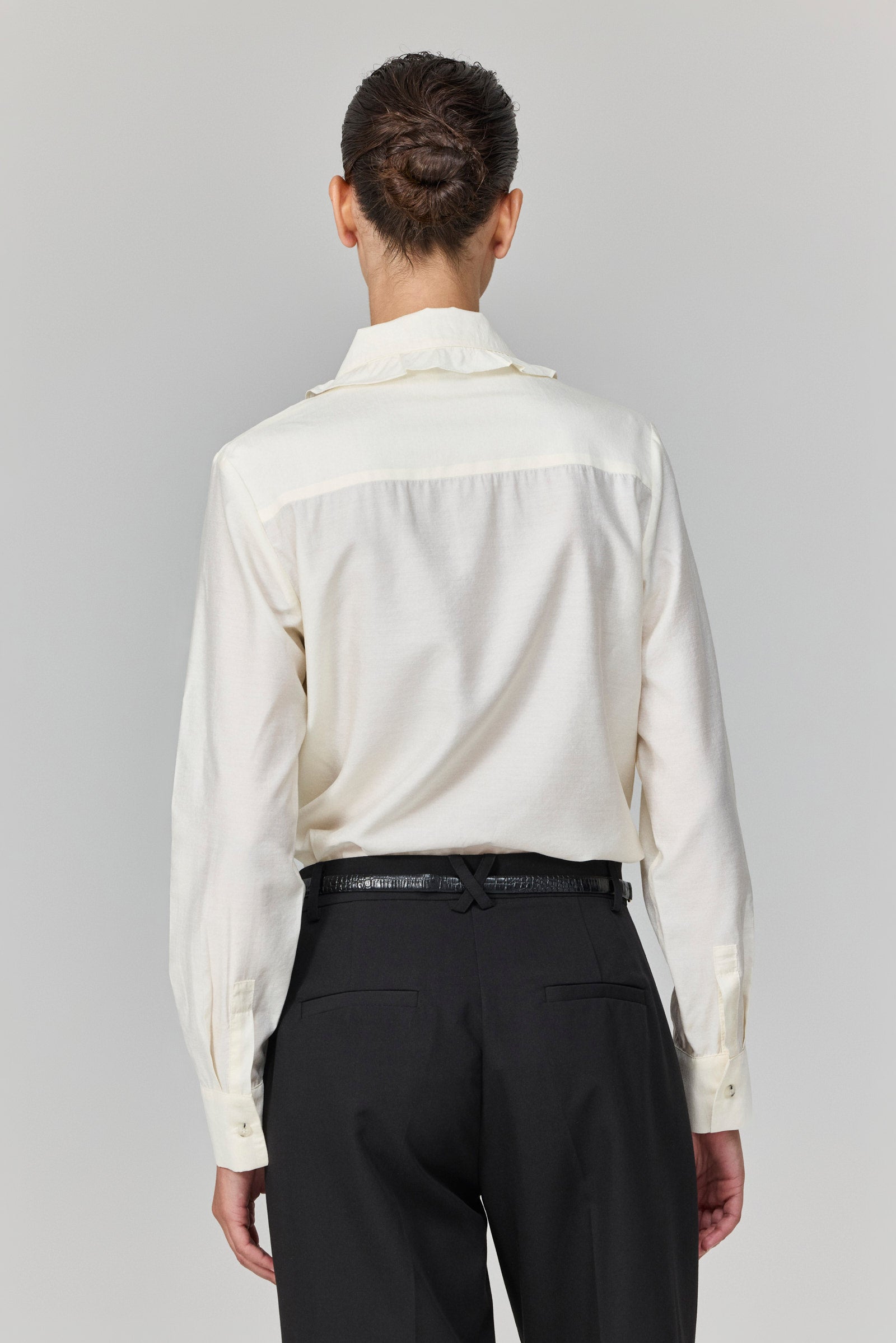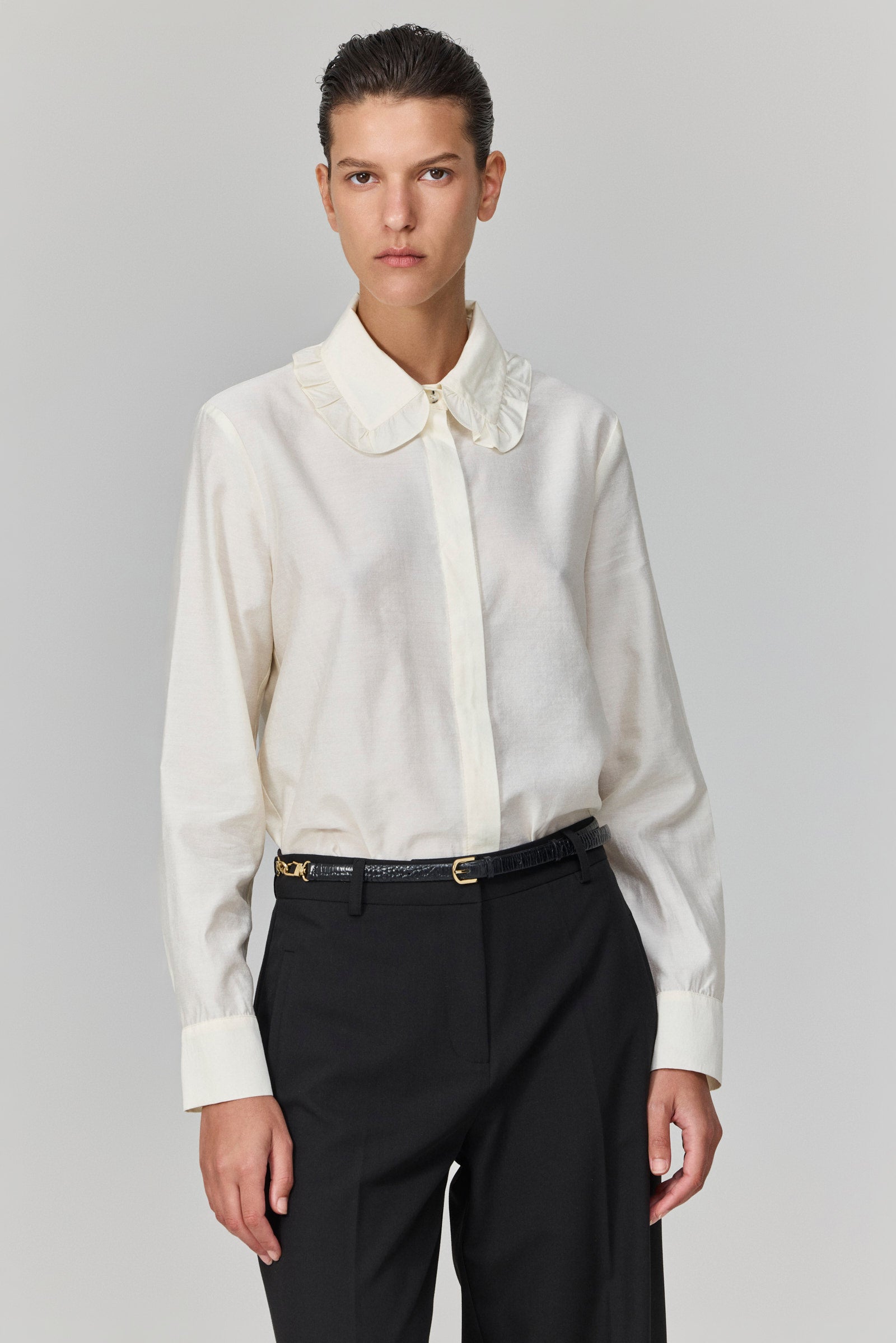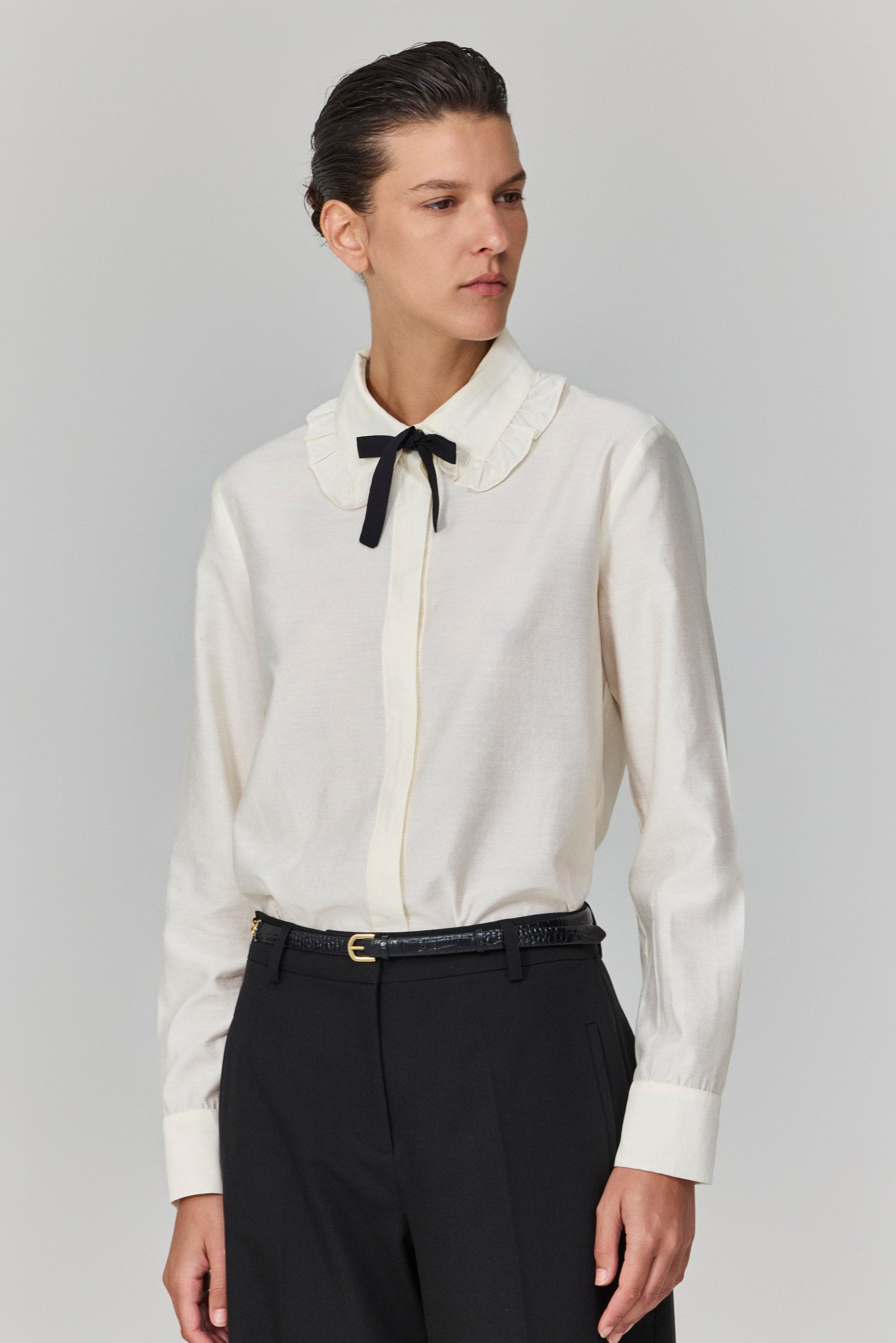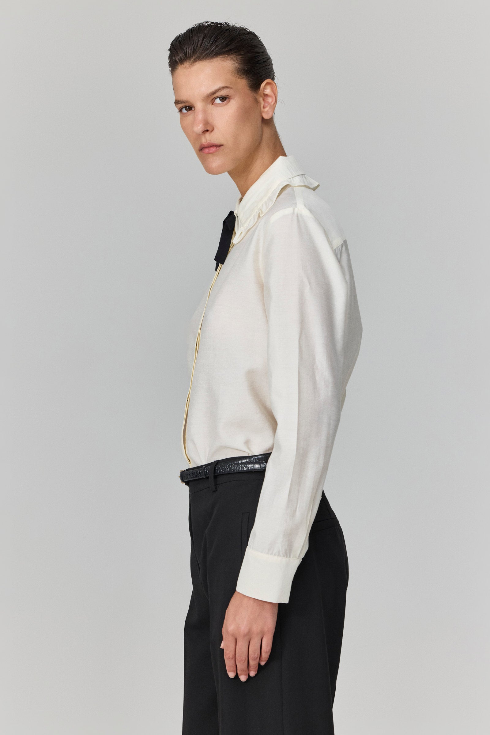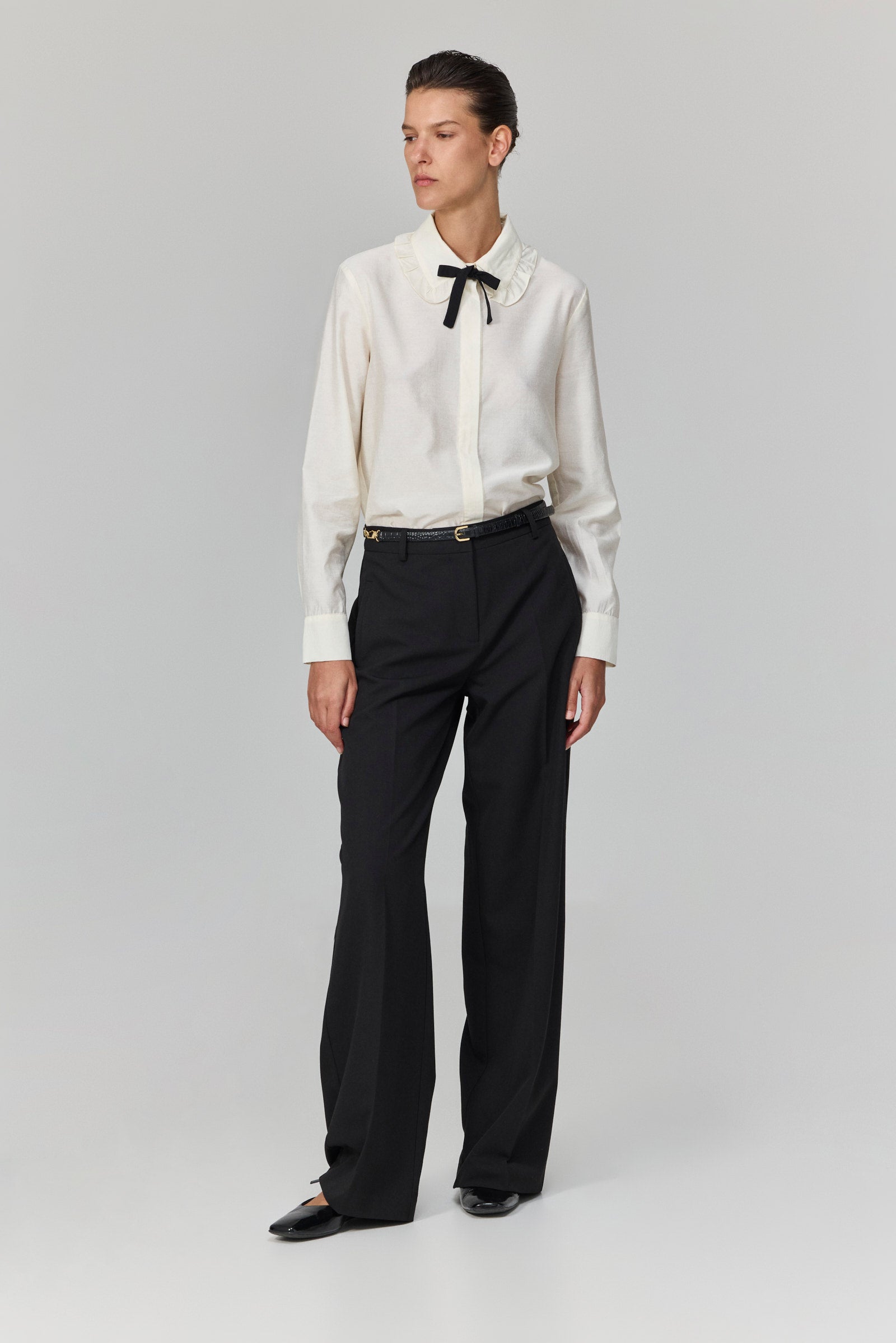 חולצה עם סיפור – מכופתרת לבנה עם צווארון עגול מקושט ברפרפות עדינות, ושרוך שחור שמוסיף לה נגיעה דרמטית. השילוב בין הניקיון הקלאסי לבין האלמנט המשחקי של הסרטון יוצר מראה שיש בו קריצה לעבר, אבל הוא נשאר עכשווי ומלא אופי. חולצה שמתיישבת בדיוק במקום שבו פריט הופך לנרטיב אישי.
