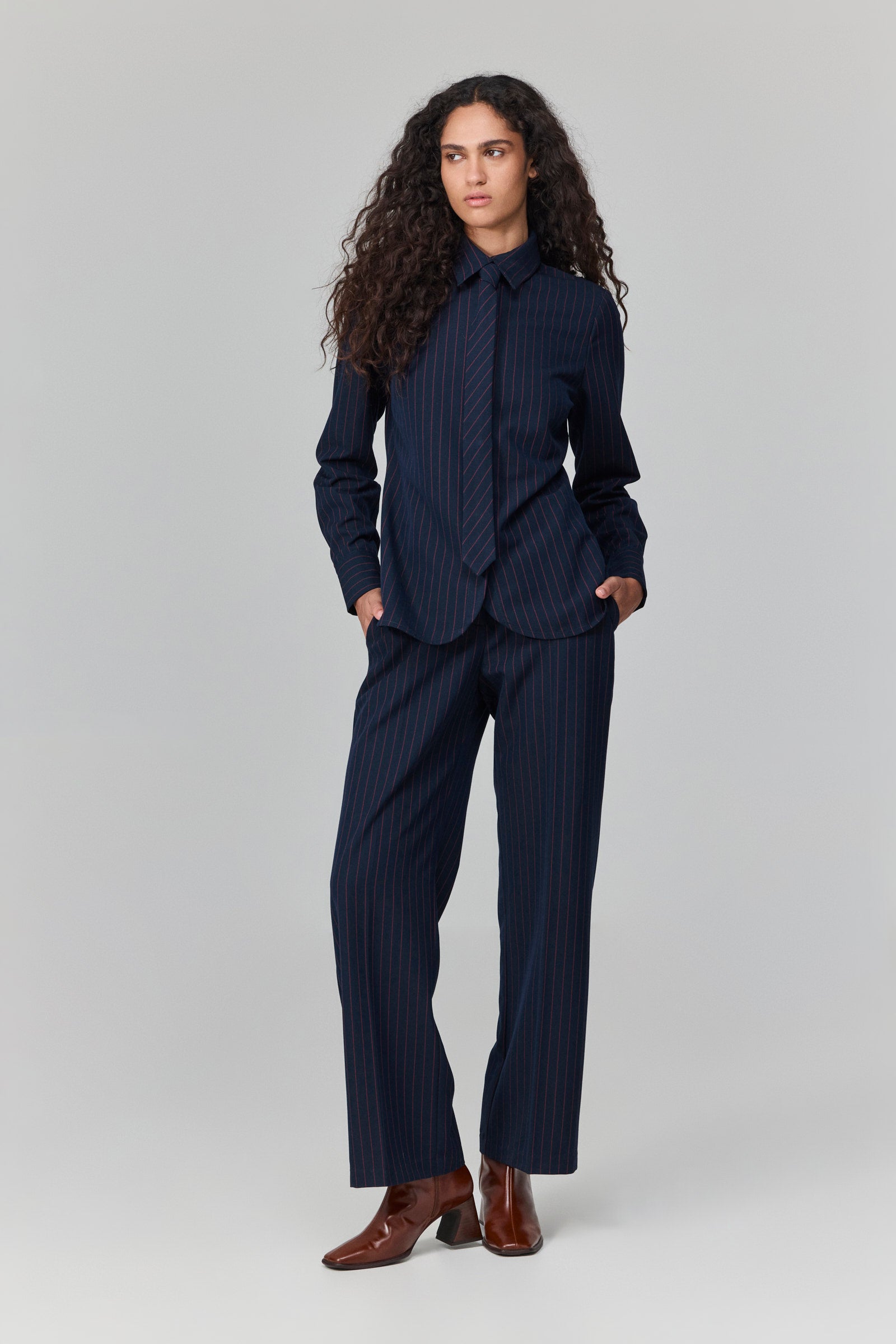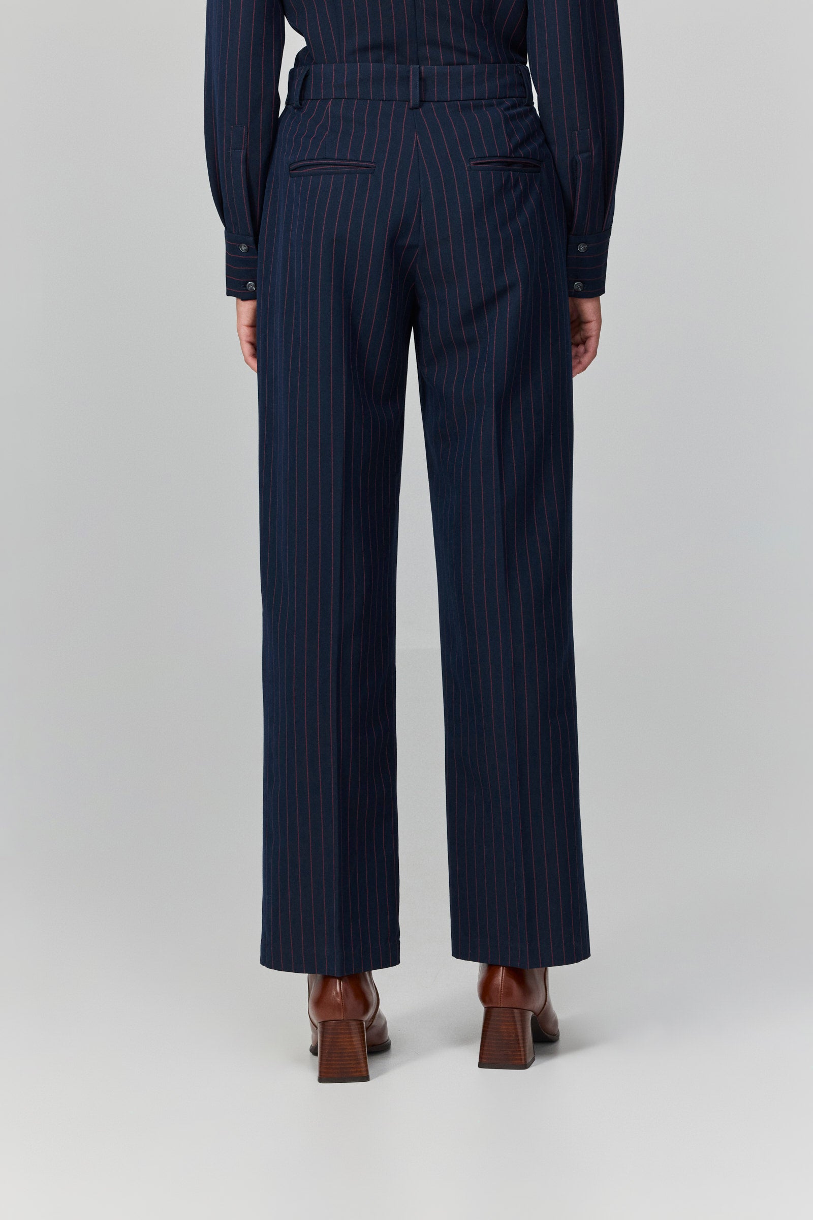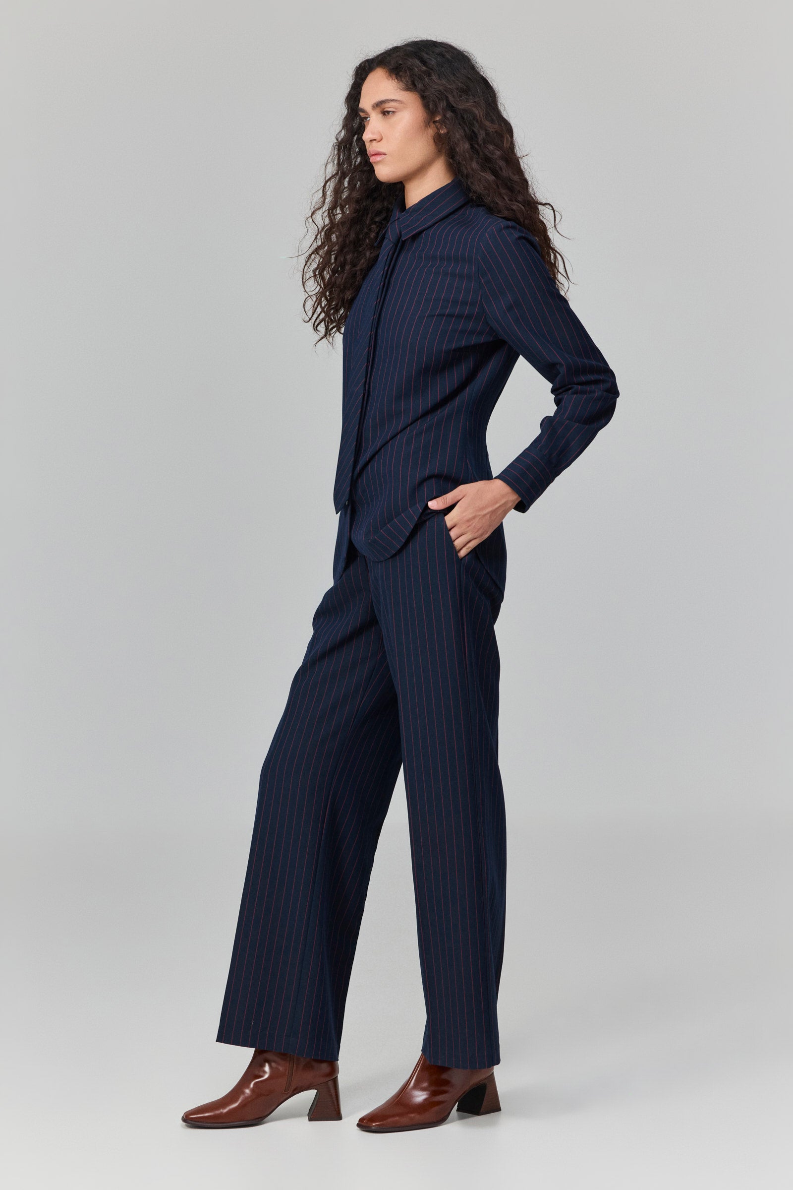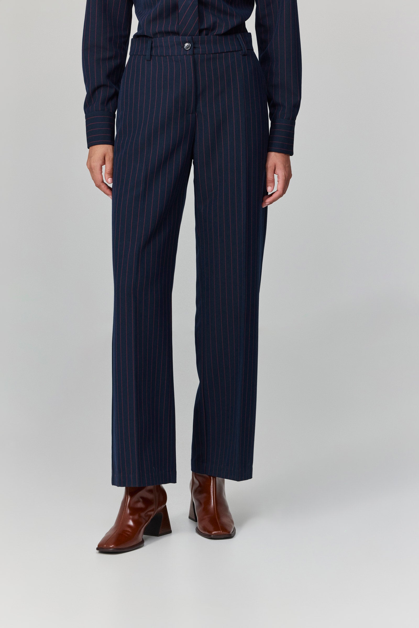 מכנסיים בגזרה מחויטת עם פסים אנכיים עדינים, שמאריכים את הסילואט ויוצרים מראה חד ומדויק. המותניים הגבוהים והגזרה הישרה משדרות אלגנטיות רגועה, בעוד הבד הנעים שומר על מבנה רך ונוח לאורך היום. זהו פריט שמאזן בין קלאסיקה לעדכניות – עובד מושלם עם חולצה תואמת ללוק חזק ומוקפד, או עם טופ חלק לסטייל יומי מתוחכם. מכנסיים שמחזיקים נוכחות, בלי להרים קול.