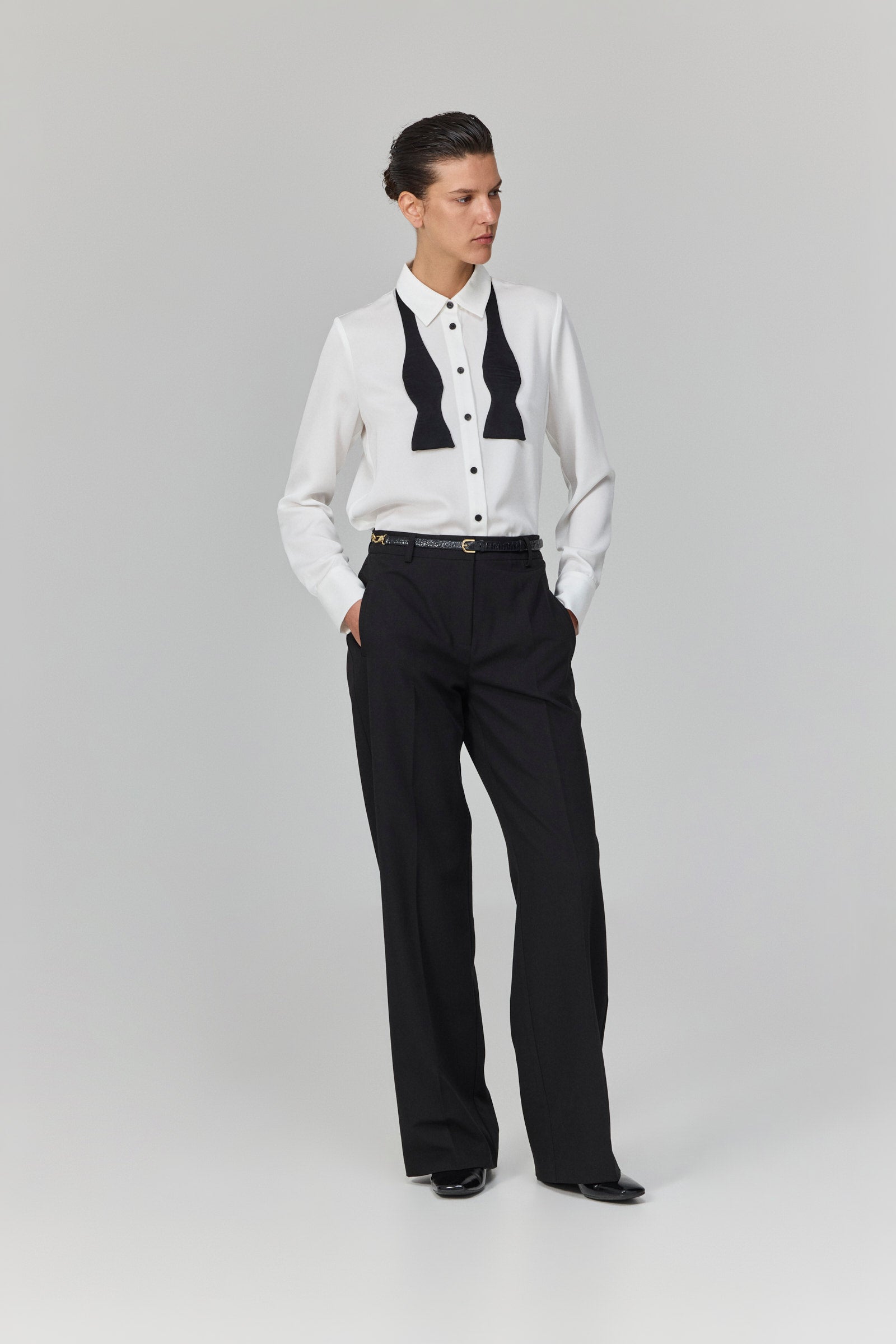 עניבת פפיון שחורה במראה משוחרר, עשויה בד אלגנטי במרקם עדין. הסילואט הרפוי מעניק לה נגיעה מודרנית ולא מתאמצת, שמסירה את הפורמליות הנוקשה ומשאירה את כל התחכום.