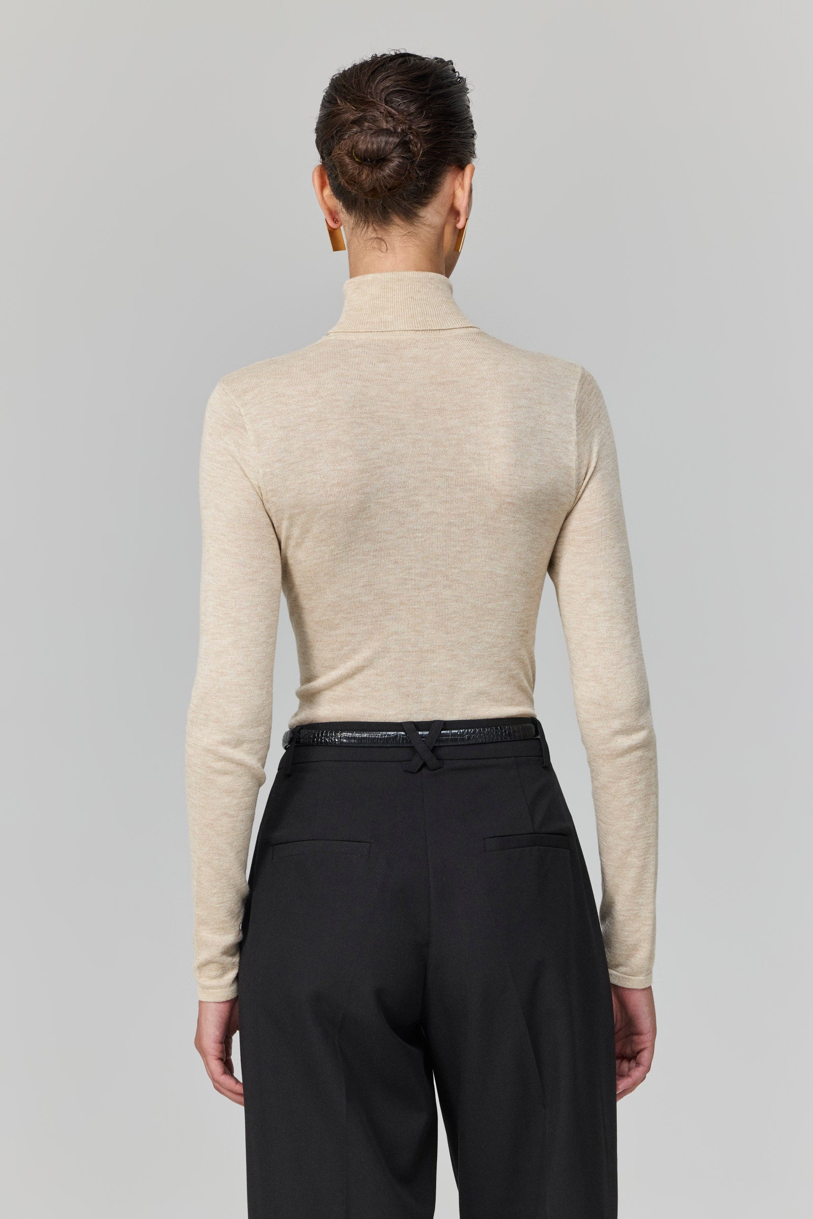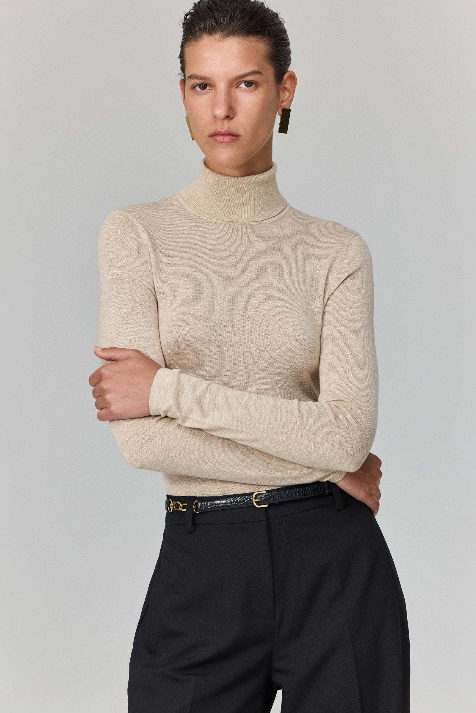 סריג דקיק בגוון ניוד רך, עם צווארון גולף שנופל בעדינות ומעניק מראה מתוחכם ואלגנטי. הגזרה הצמודה מחמיאה ומדגישה את הקווים הנקיים של הגוף, והבד הסרוג הקליל מתאים לשכבות או ללבישה בפני עצמה