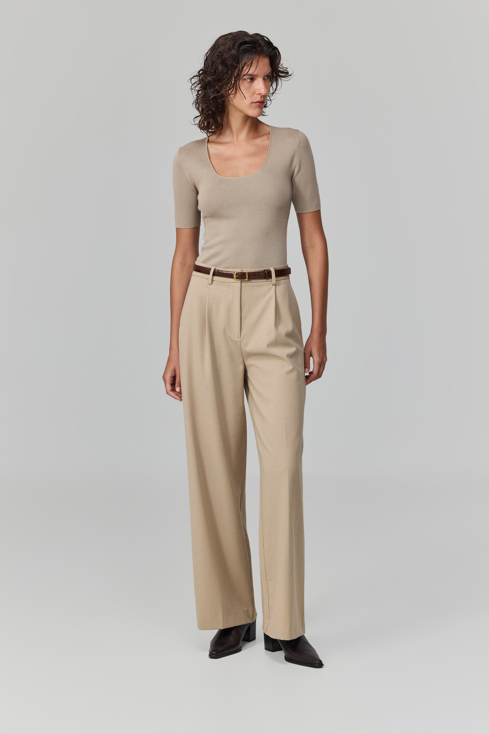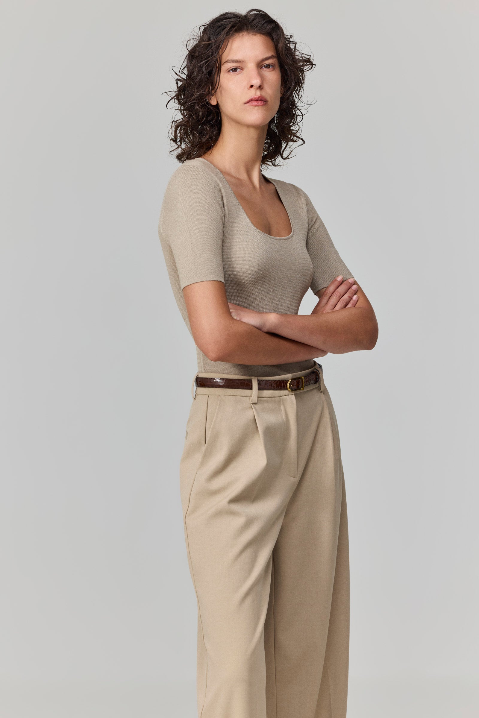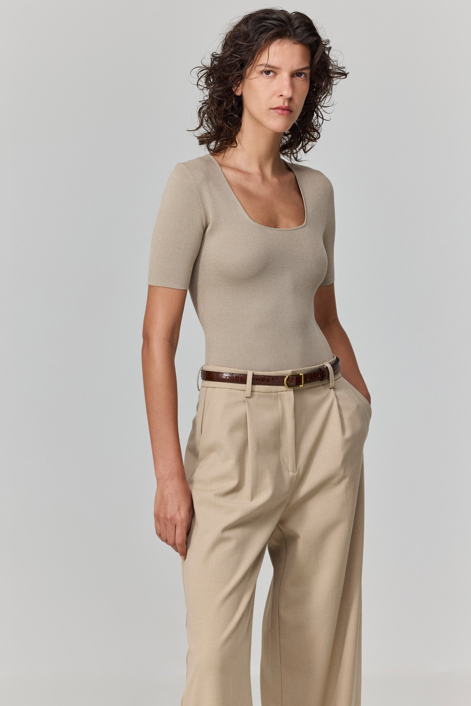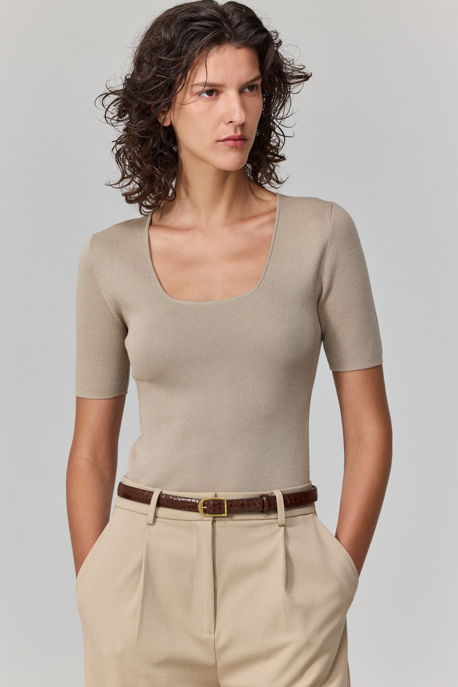 סריג קצר הדוק עם מחשוף מרובע מדויק. פריט ורסטילי שמתחבר בקלות לכל לוק – עם מכנסיים מחויטים למראה מוקפד, או עם ג’ינס לסטייל יומיומי משודרג. סריג שמצליח להפוך את הקווים הרכים לקלאסיקה חדה – ולרבע את המעגל בסטייל.