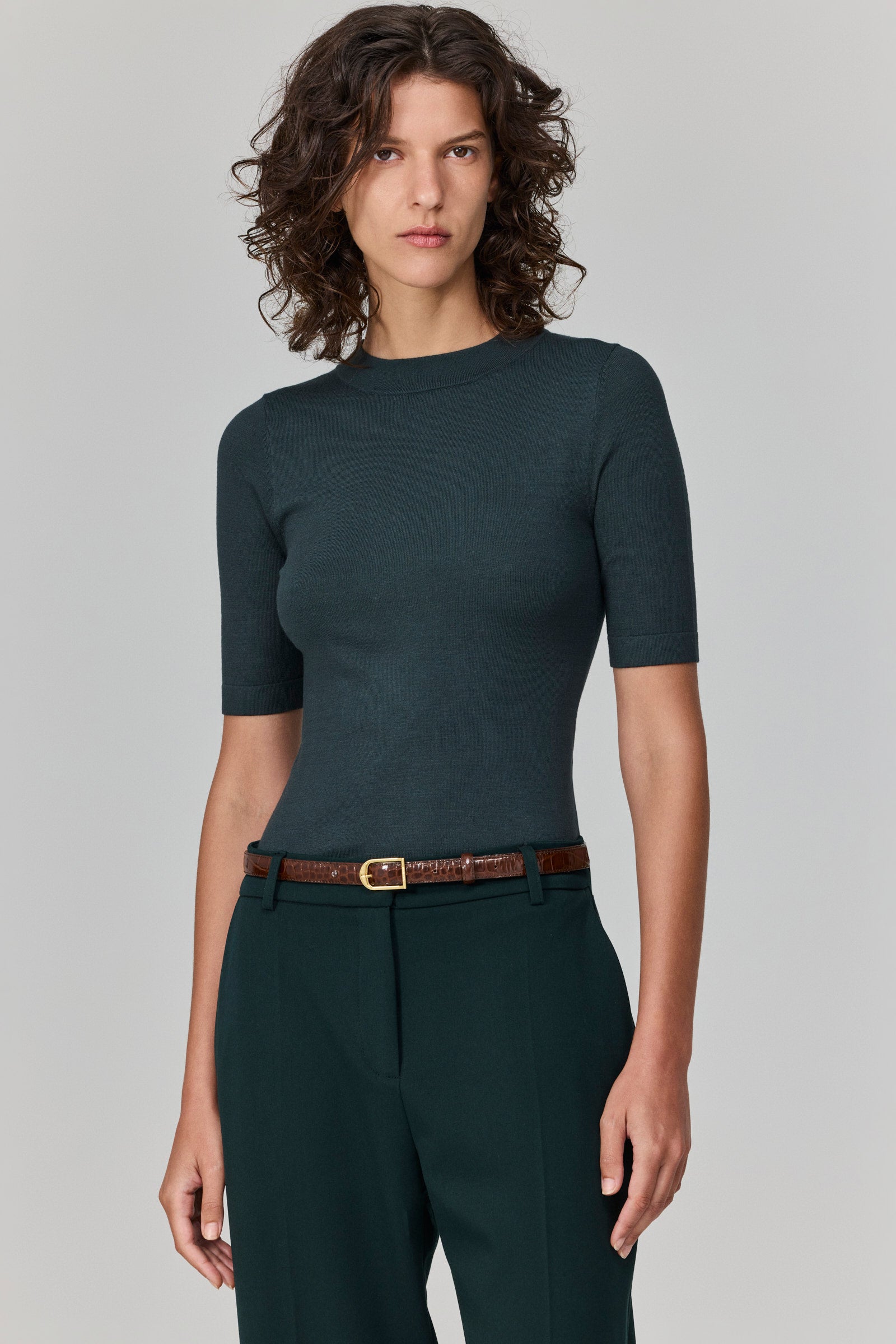סריג דק, נעים ויומיומי. גזרה צמודה, צווארון ניקי סגור ושרוולים עד מעל למרפק.