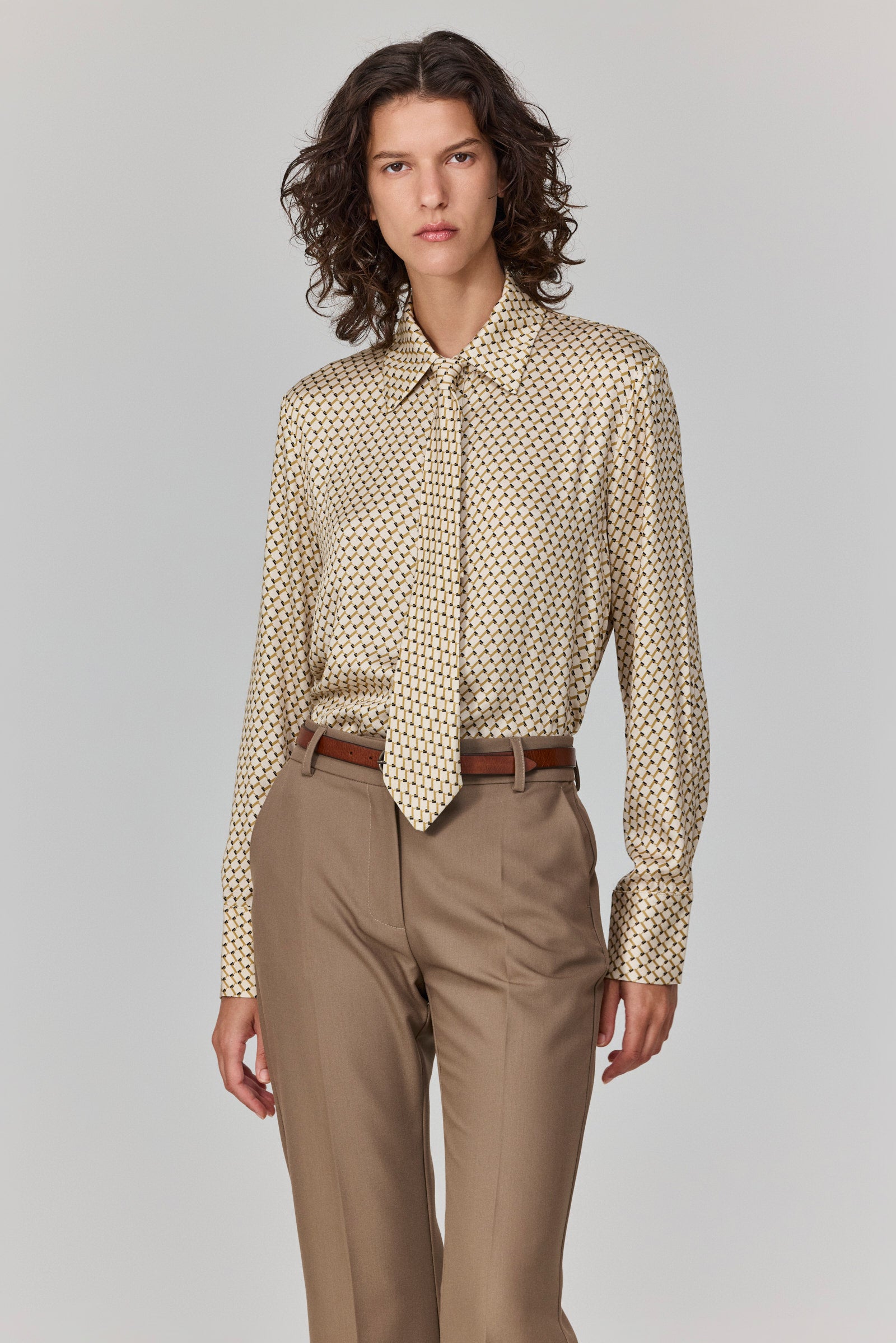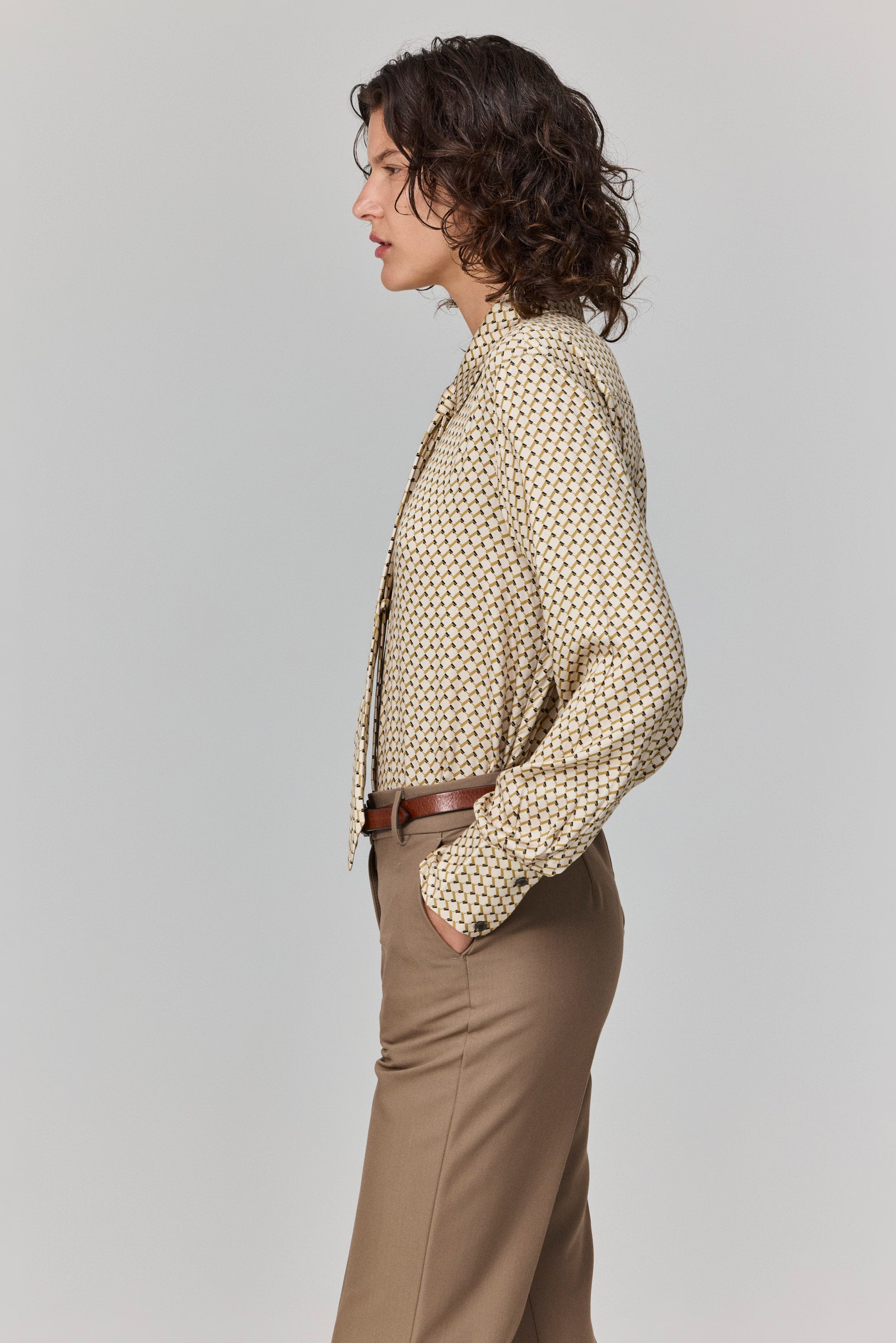 חולצה אלגנטית מבד ויסקוזה בדפוס בהשראת סבנטיז בגווני בז’ וזהב. שילוב הדוגמה הגיאומטרית הקלאסית עם הנפילה הרכה של הבד יוצר חולצה מכופתרת מושלמת. ניתן לשלב עם עניבה תואמת למראה מלא נוכחות, או ללא ללבוש משוחרר יותר ליום קליל.