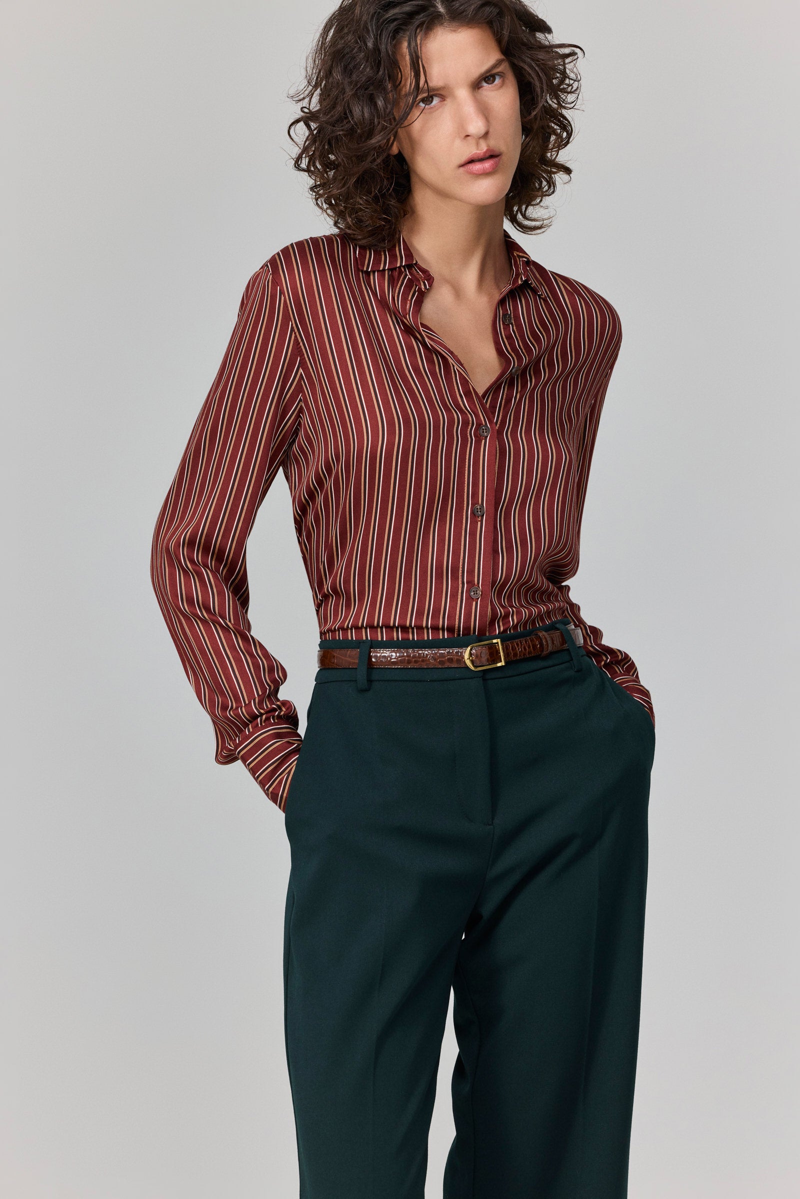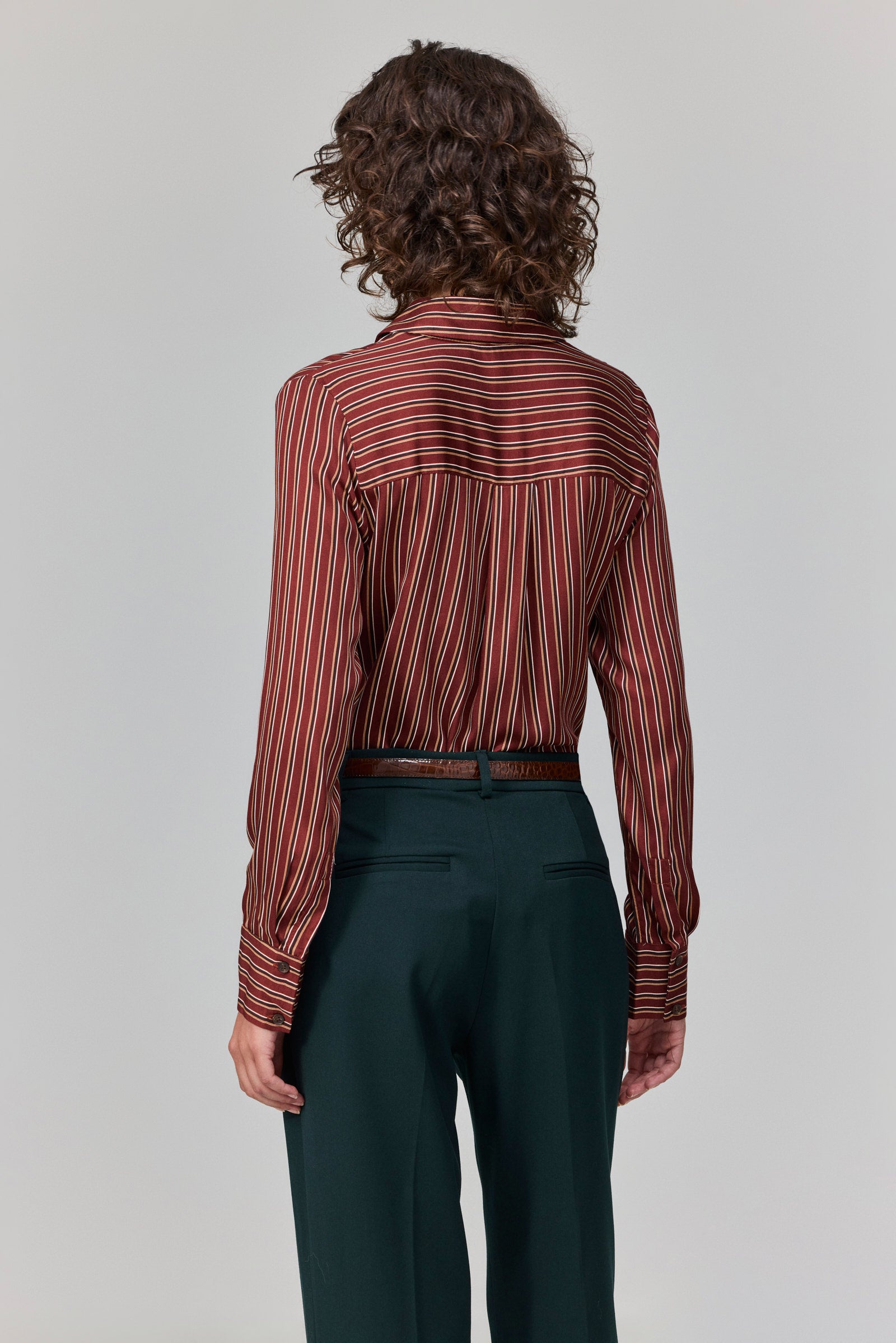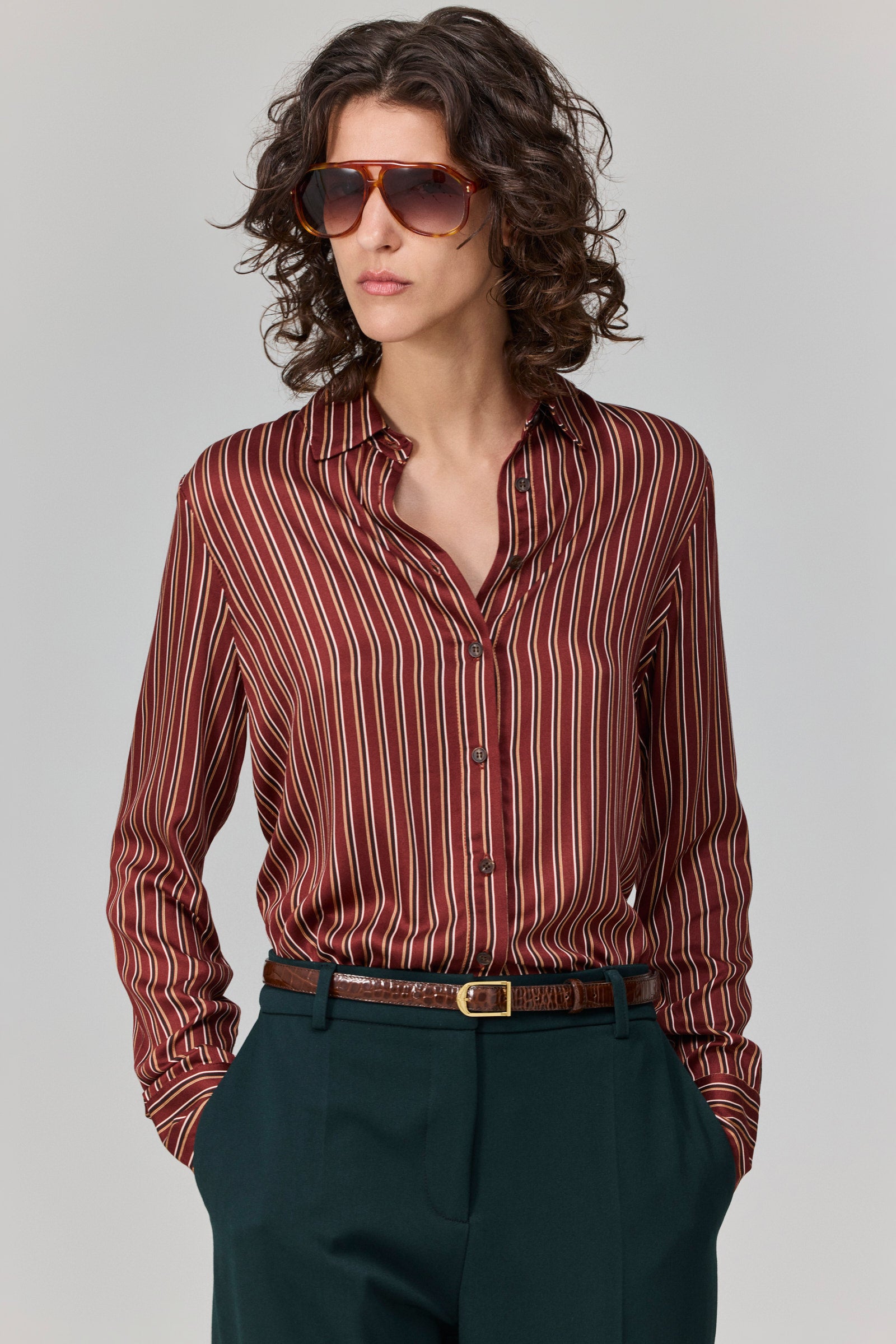 חולצת כפתורים בהדפס פסים דקים בגווני אדום-בורדו צהוב ולבן, עם גזרה קרובה לגוף. הצווארון הקלאסי והבד הנשפך מעניקים לה מראה מתוחכם ושיקי