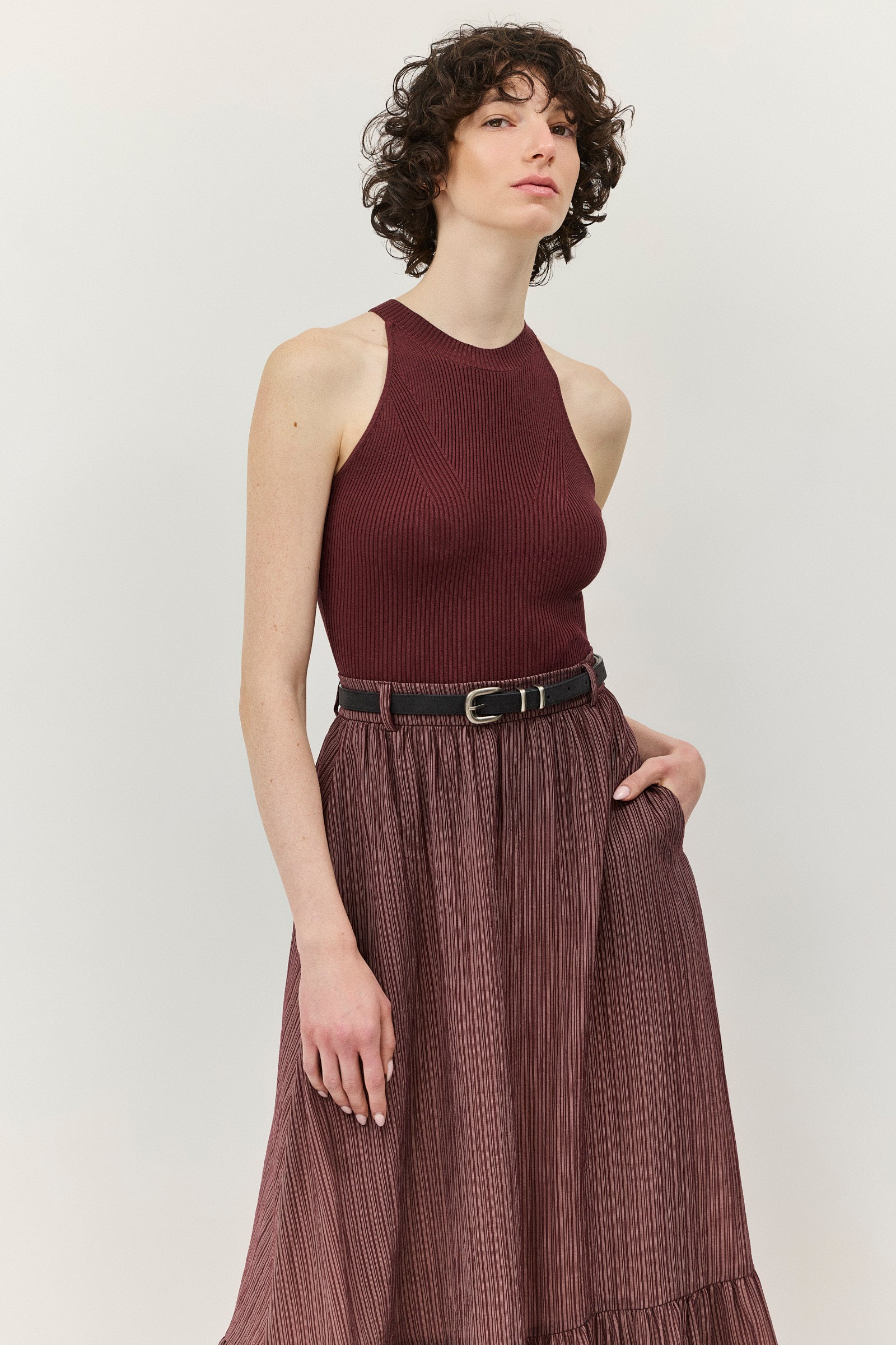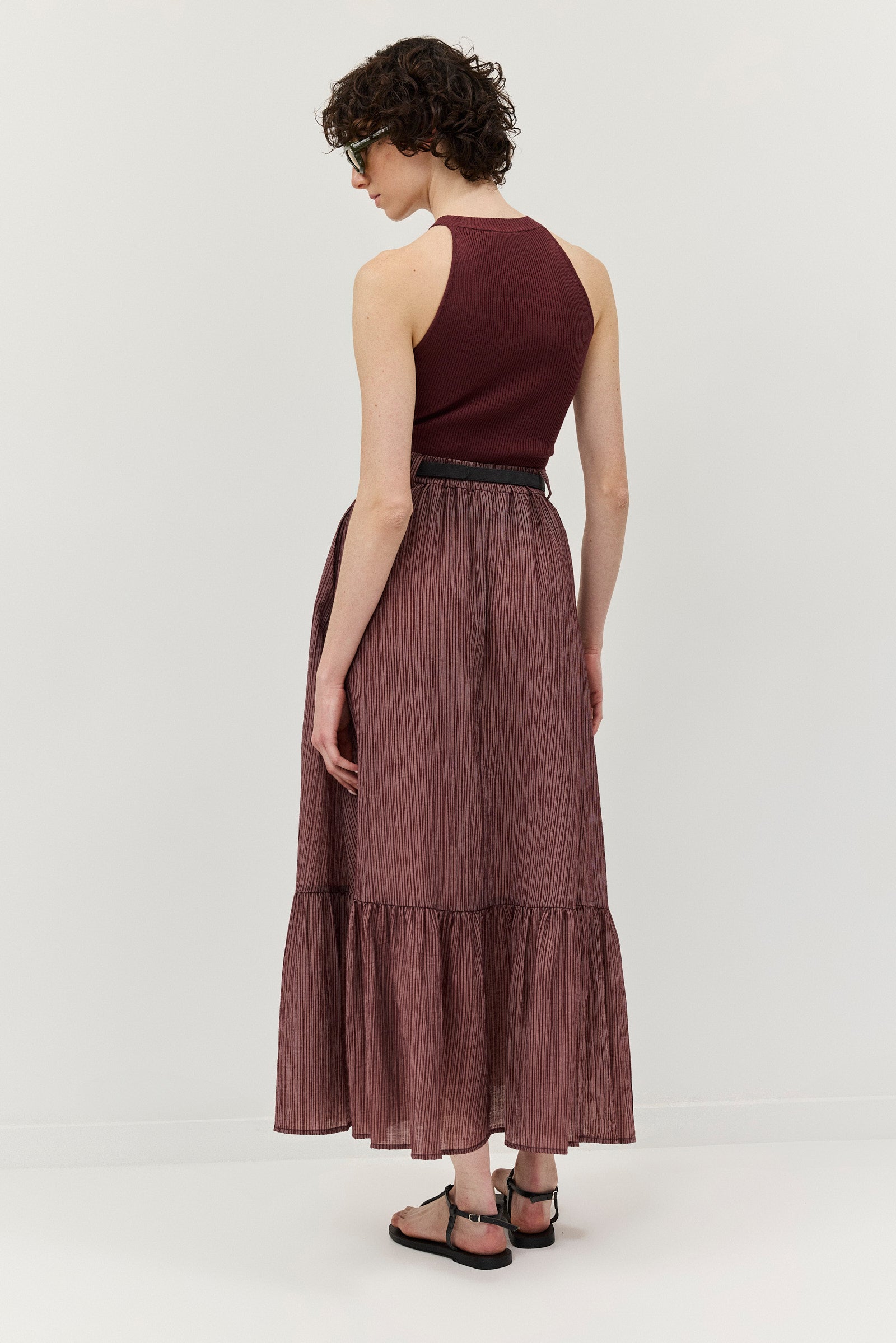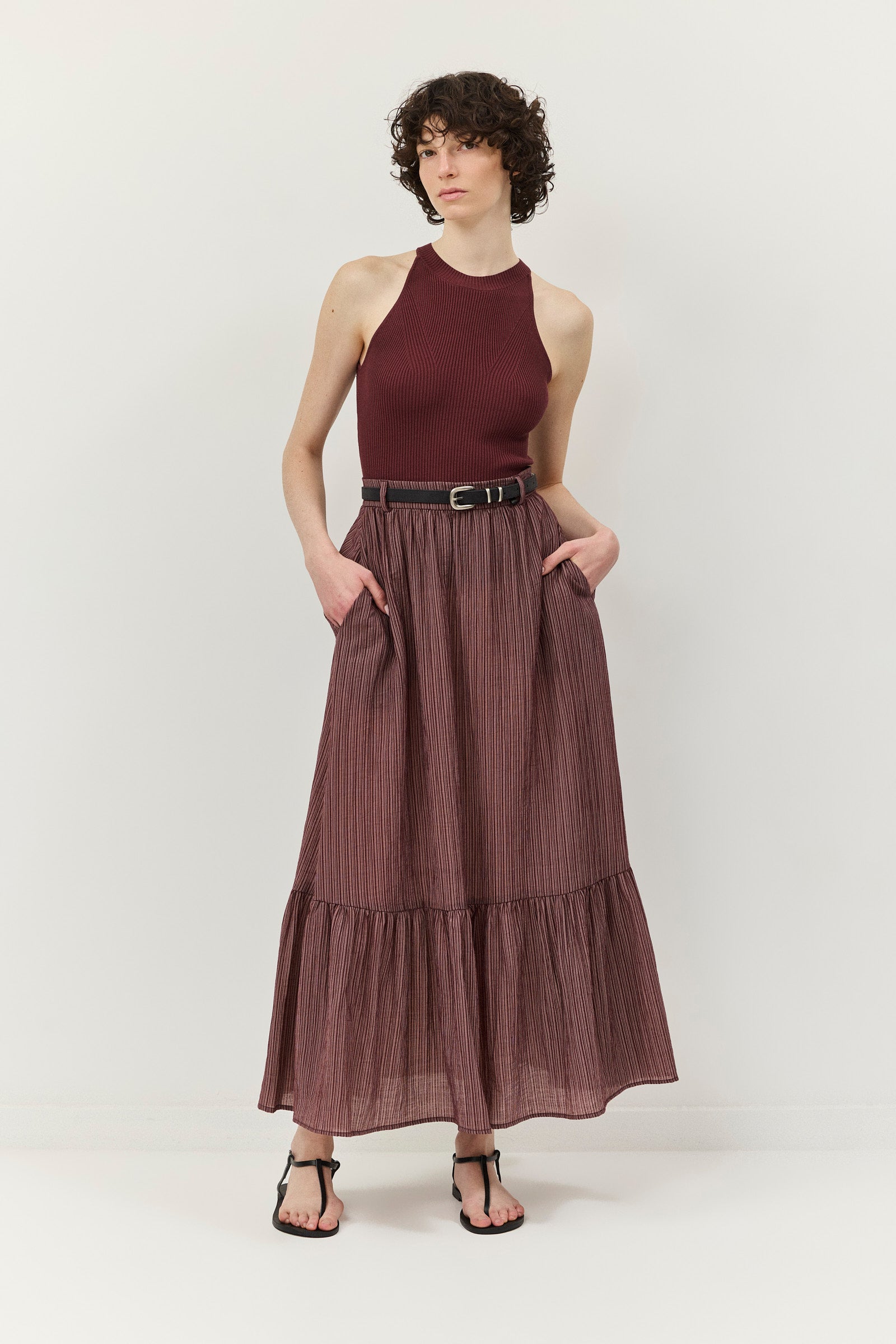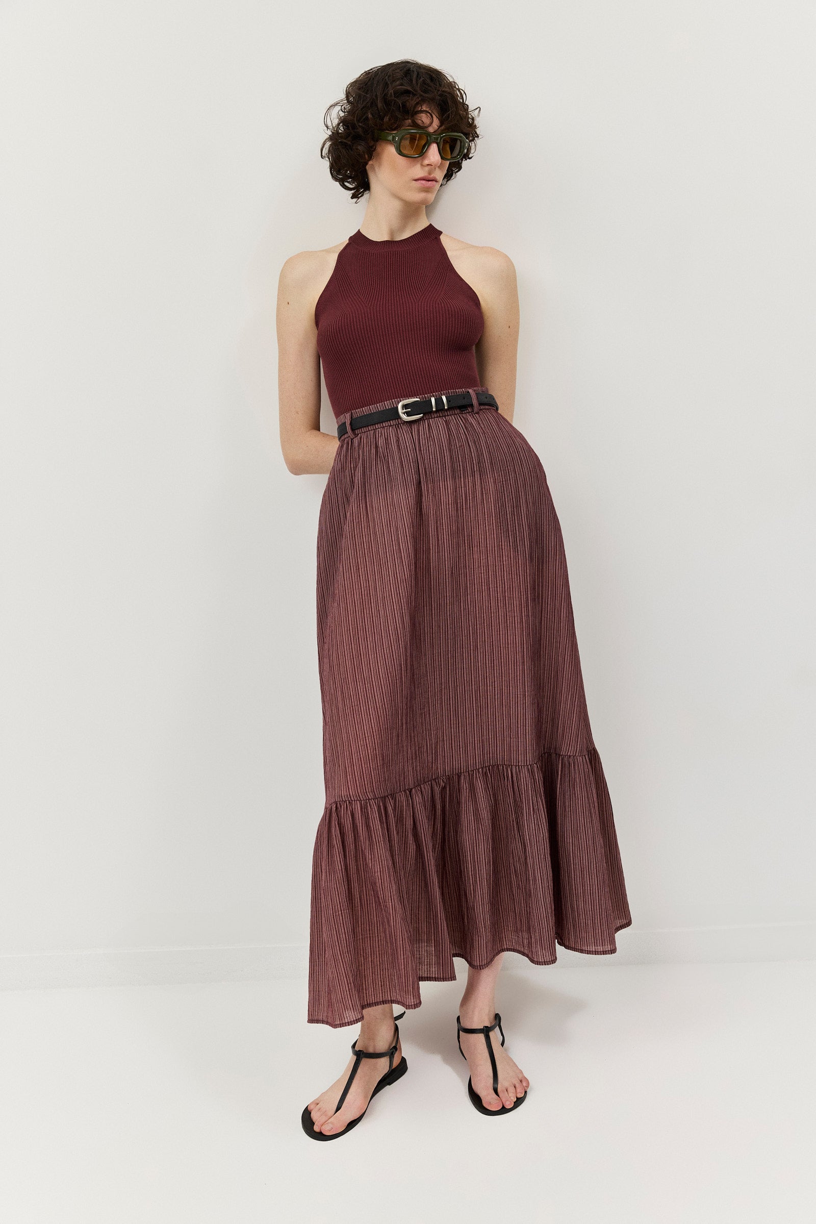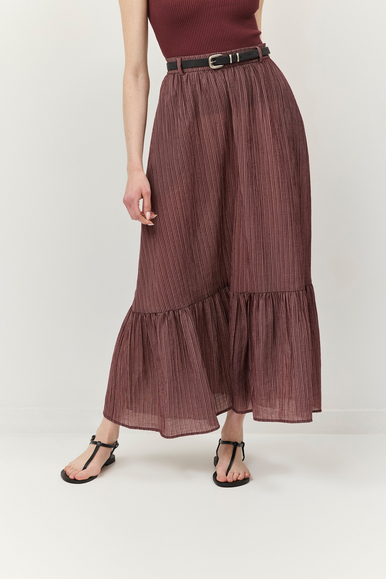 חצאית נפלאה, עשירה בבד בדוגמת פסים ובמרקם קימוט מעודן. בחגורת המותניים משולבות לולאות להשחלת חגורה ובחלקה האחורי משולב גומי לנוחות מירבית. לחצאית שני כיסי צד והיא נסגרת ברוכסן צידי נסתר. השמלה אינה מגיעה עם החגורה.