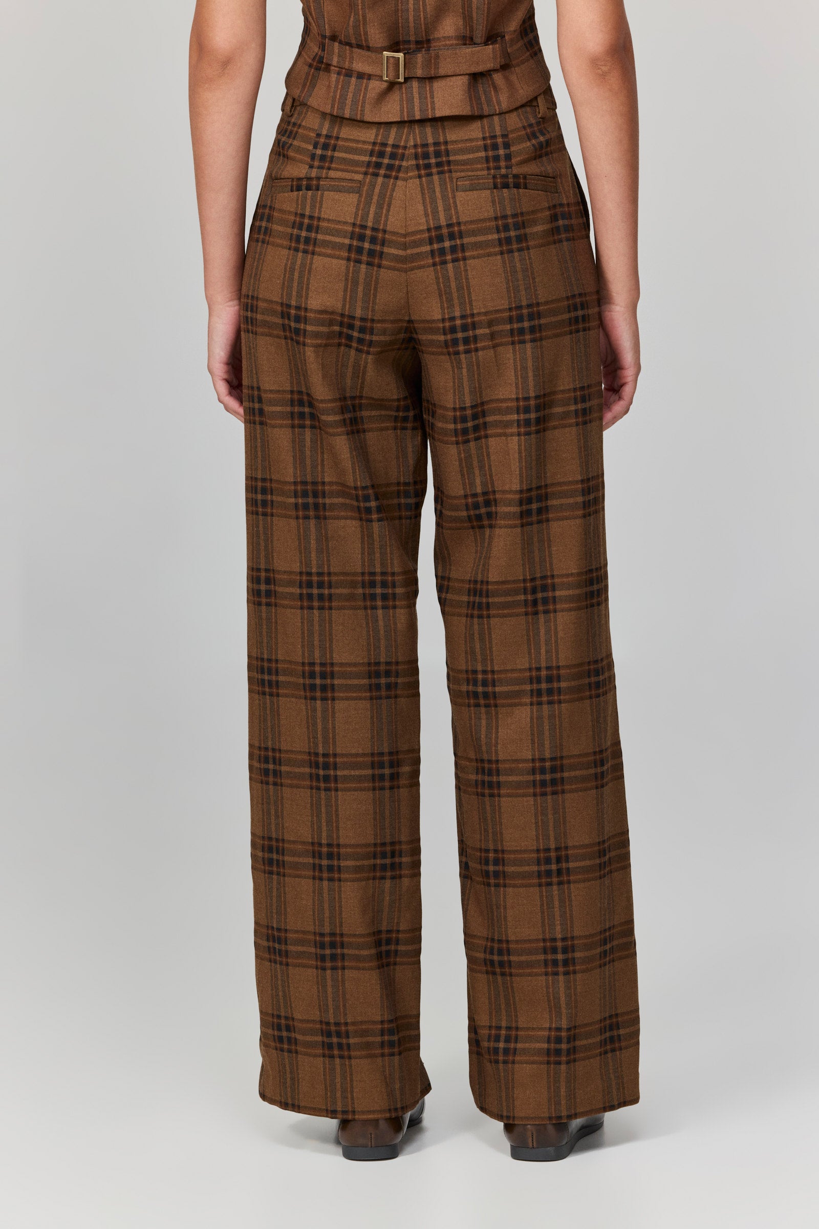 מכנסיים מחויטים בגזרה ישרה עם קפל קדמי, עשויים בד משובץ בגווני חום-קמל. הגזרה הנקייה והנפילה המדויקת מעניקים להם מראה אלגנטי ורב־עוצמה, כזה שמתאים גם ליום במשרד וגם לערב מתוחכם.