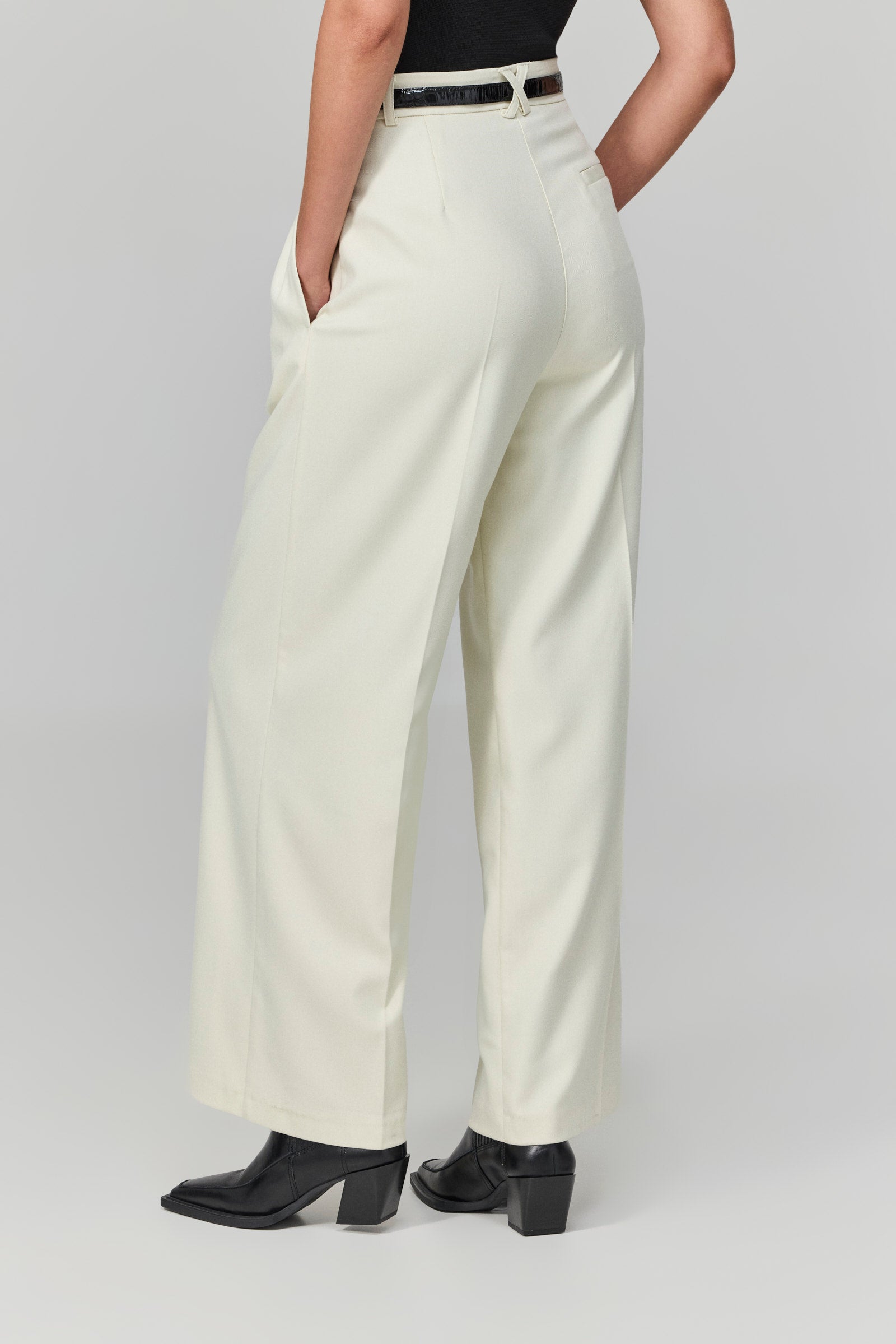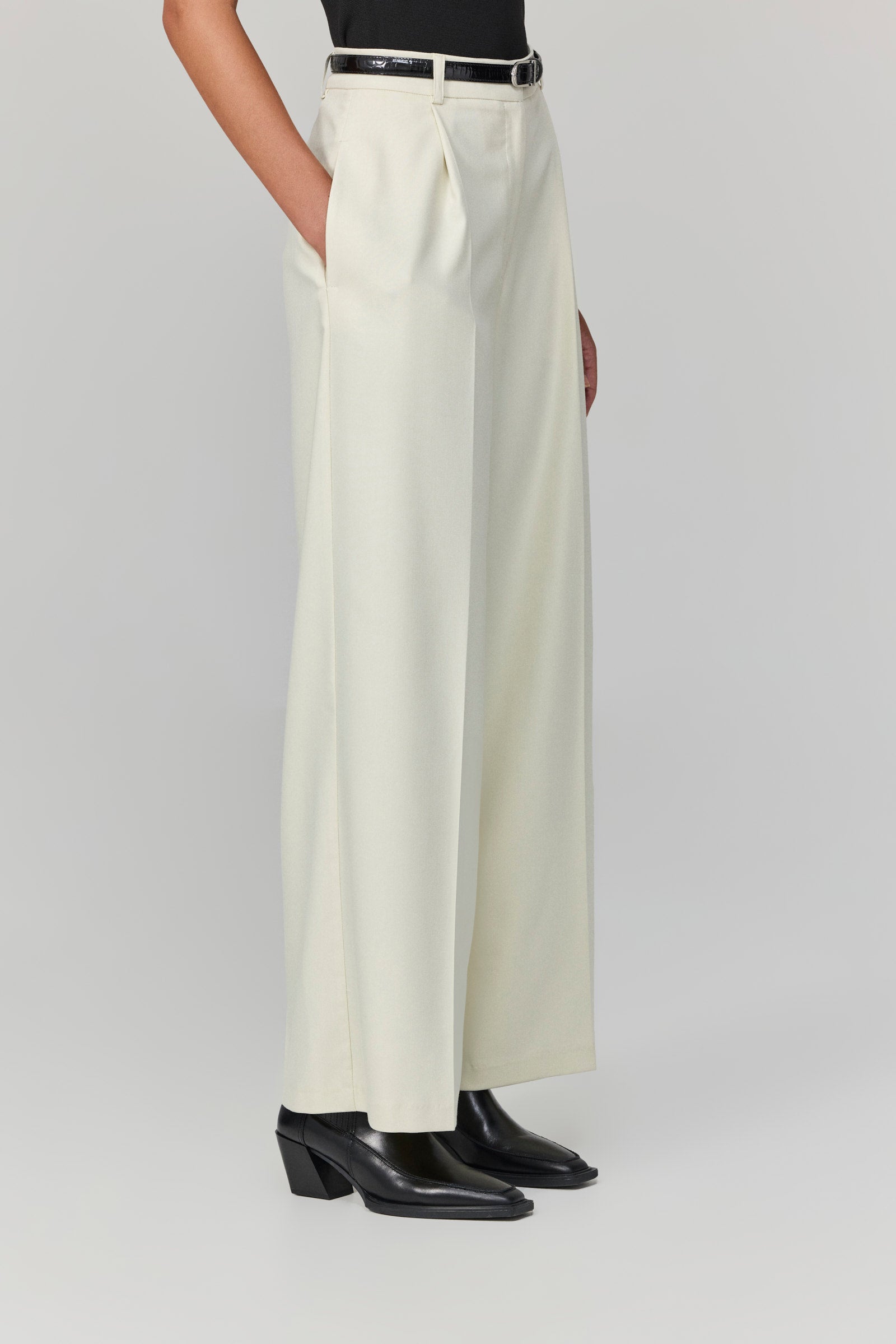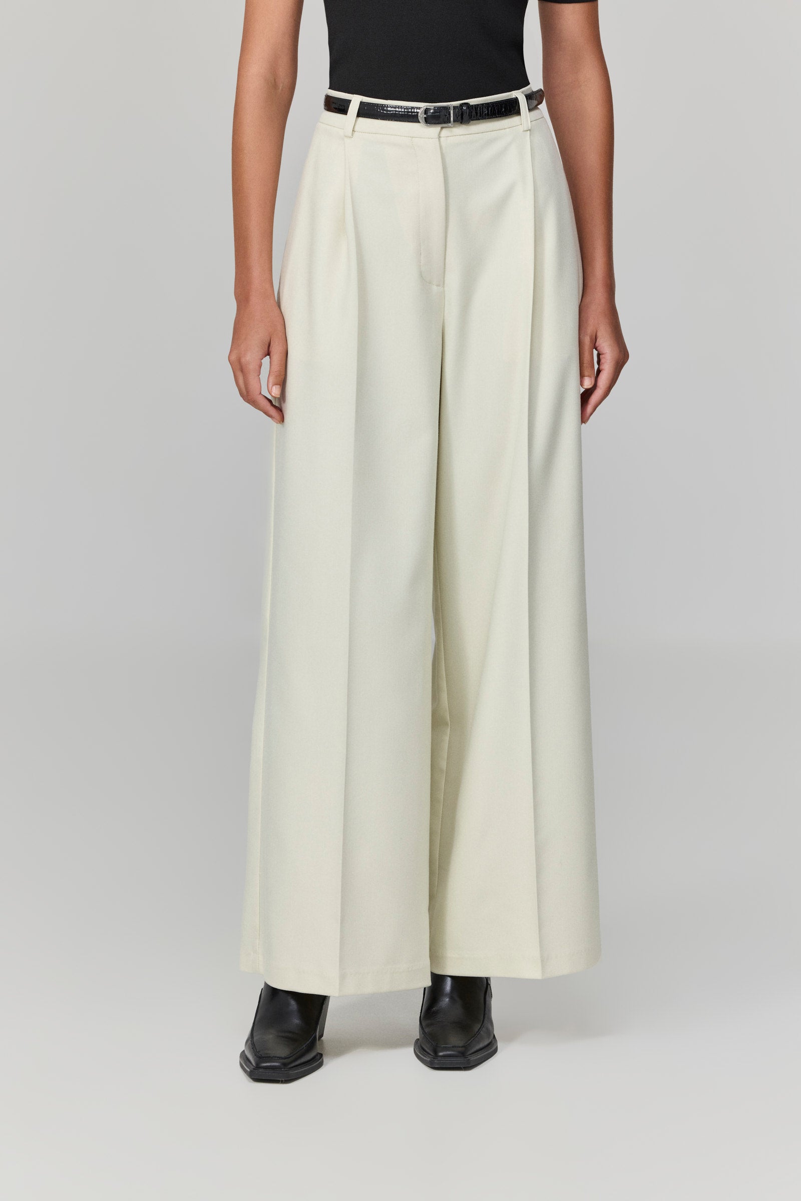 מכנסיים בגזרה רחבה ונשפכת, עם כיסים וקפלים קדמיים שמוסיפים מבנה אלגנטי. הבד הקליל והתנועה החופשית יוצרים סילואט זורם שמחמיא לגוף ומעניק תחושה של קלילות יוקרתית.