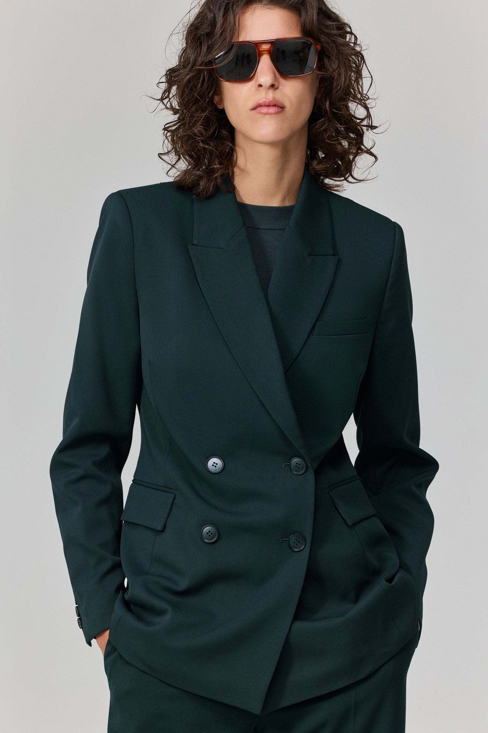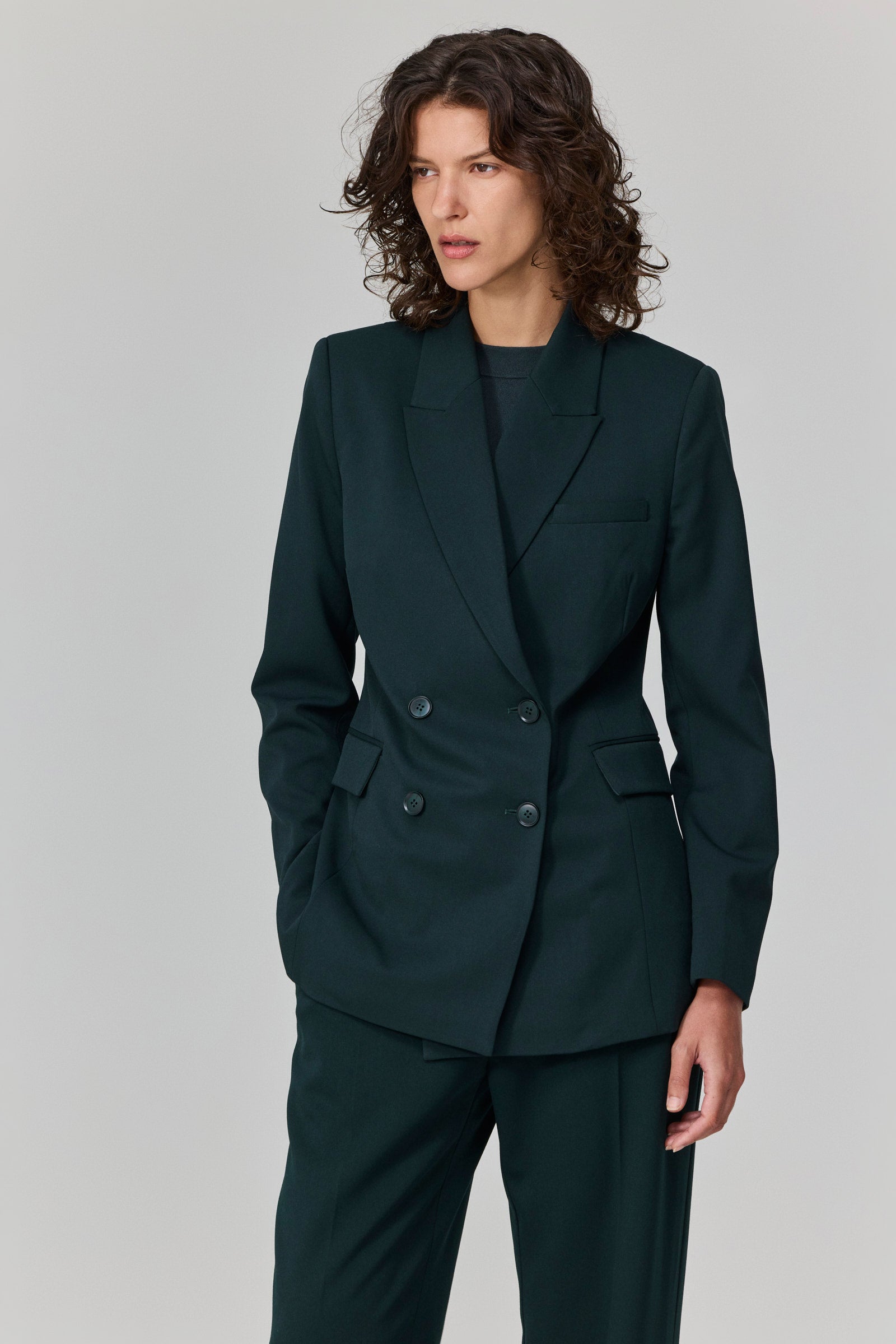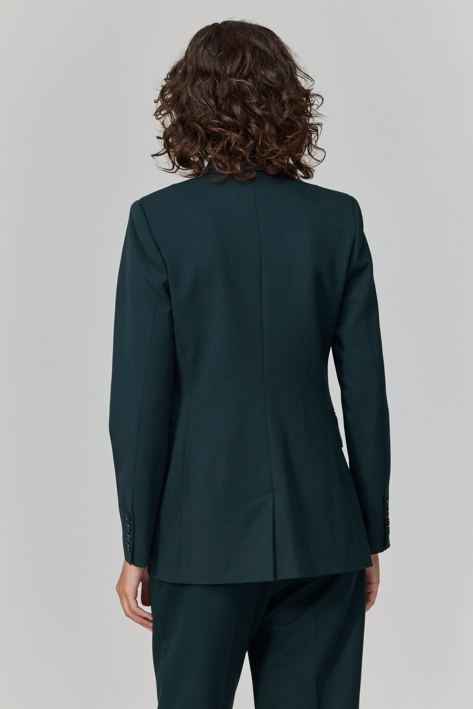 ז׳קט מחויט בגזרת דאבל-ברסט בצבע ירוק כהה עמוק.