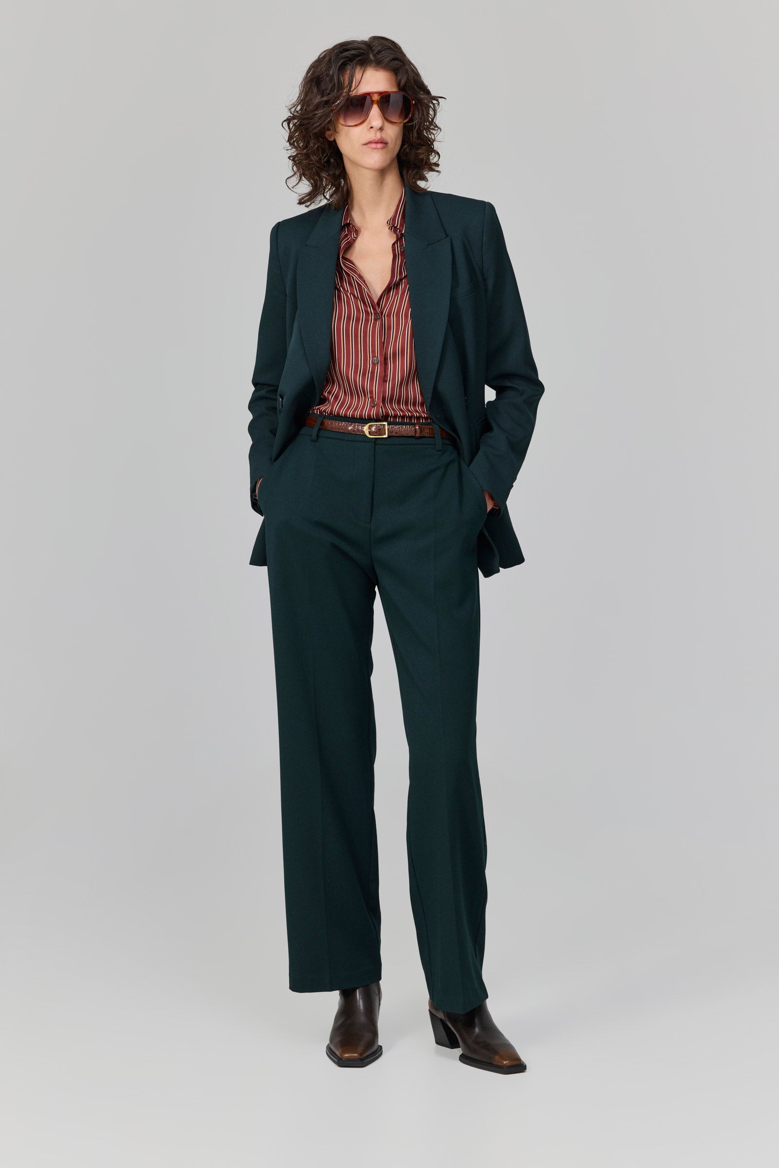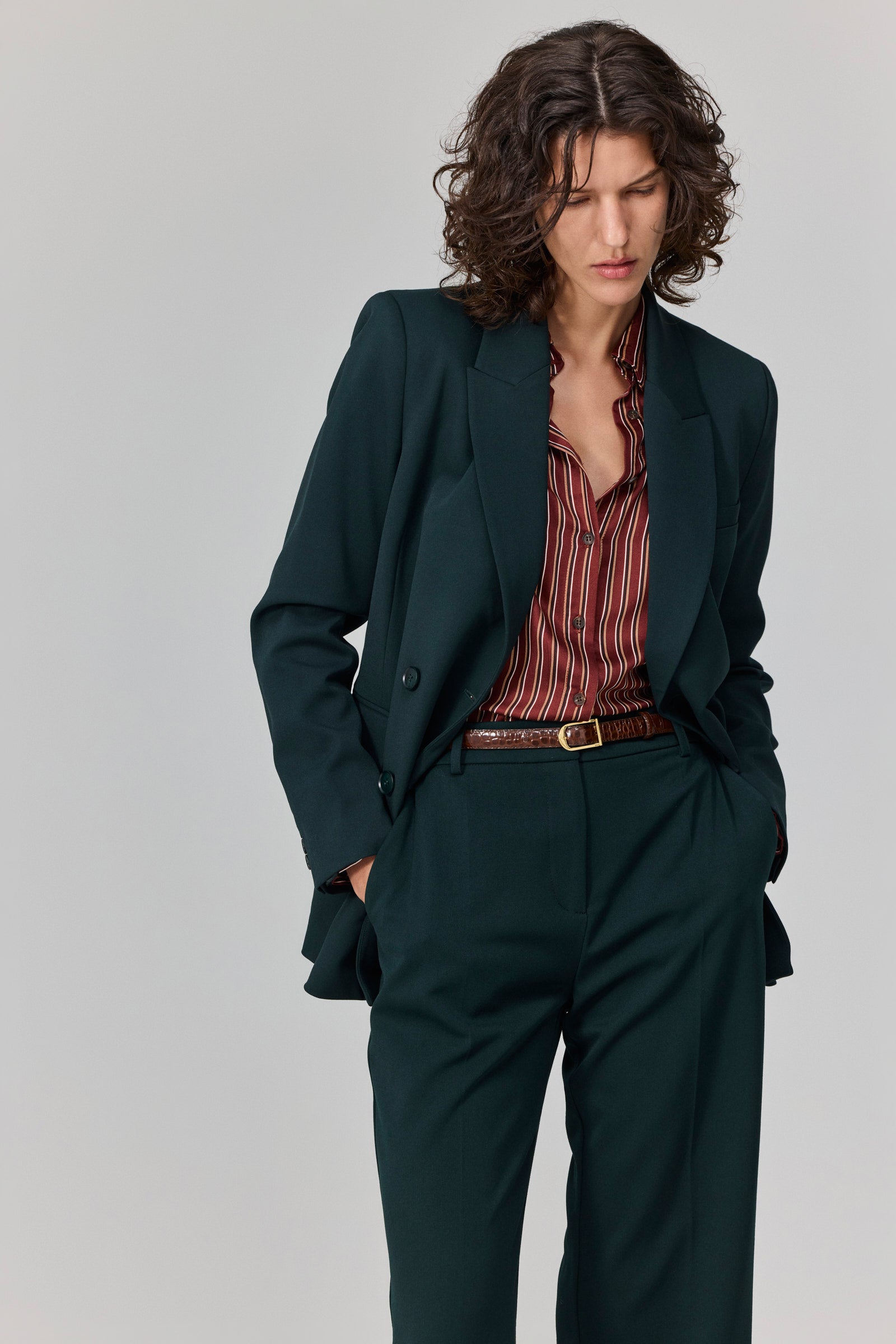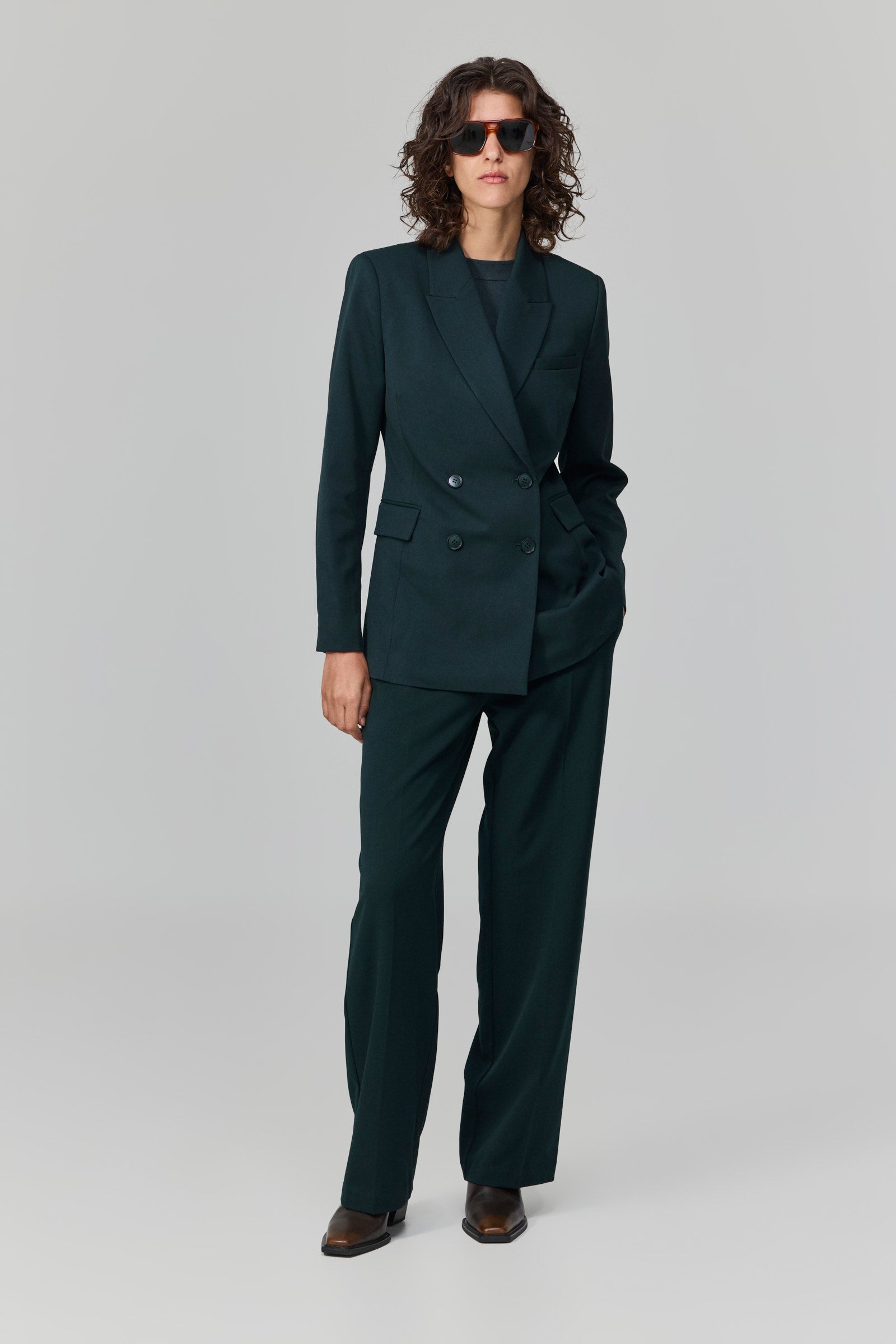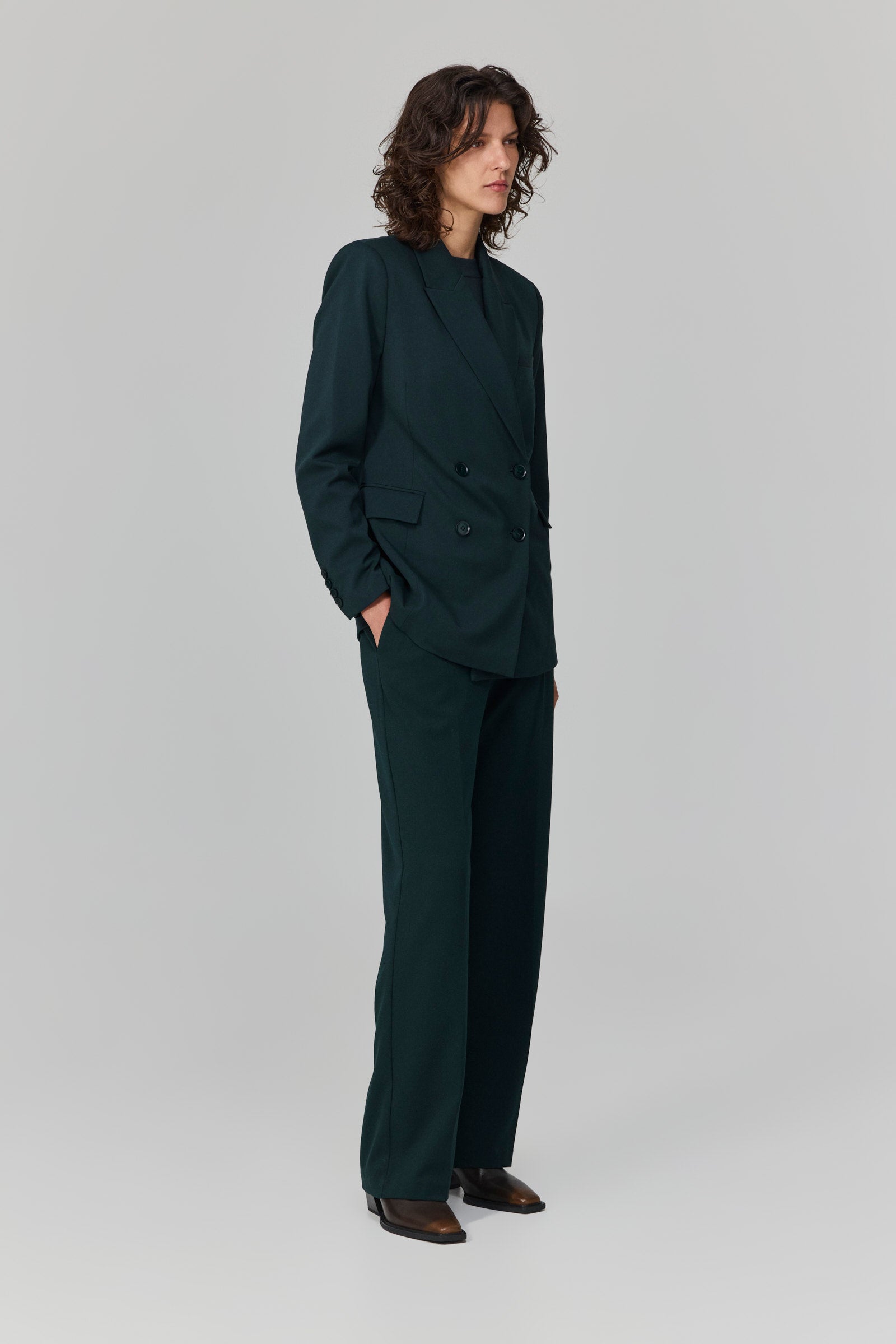 ז׳קט מחויט בגזרת דאבל-ברסט בצבע ירוק כהה עמוק.