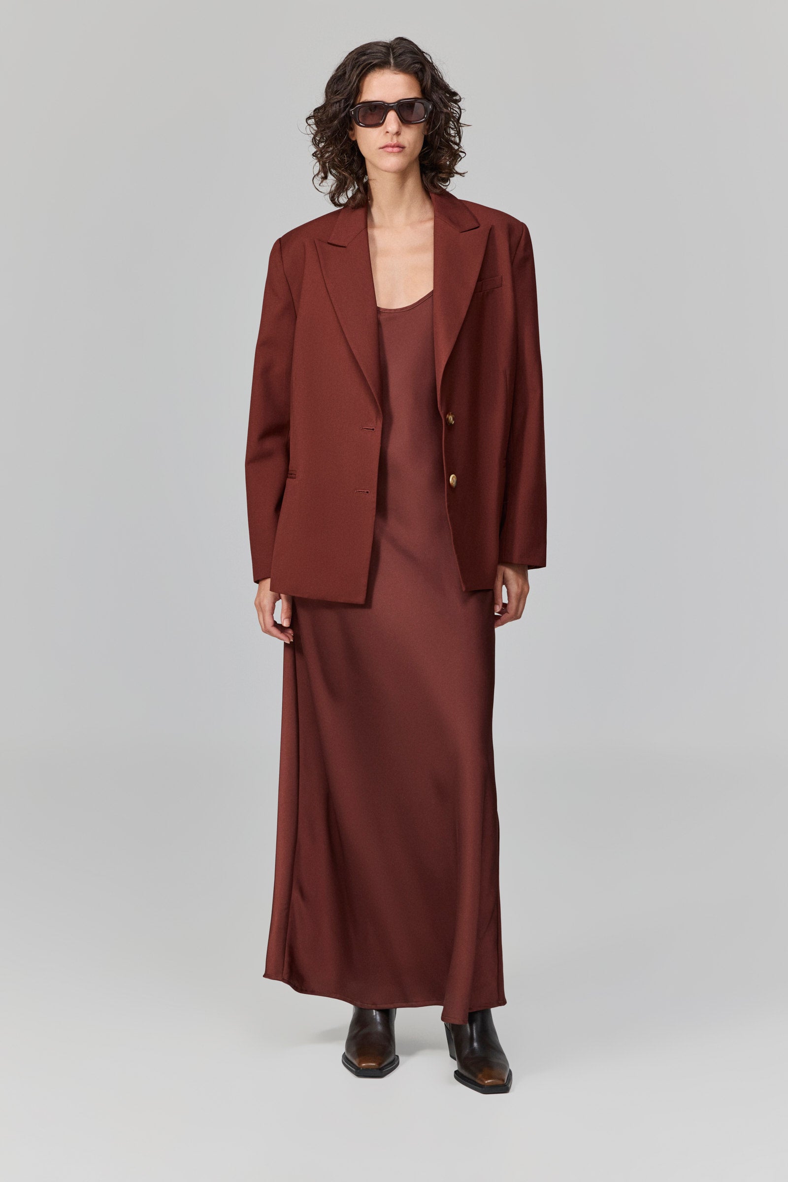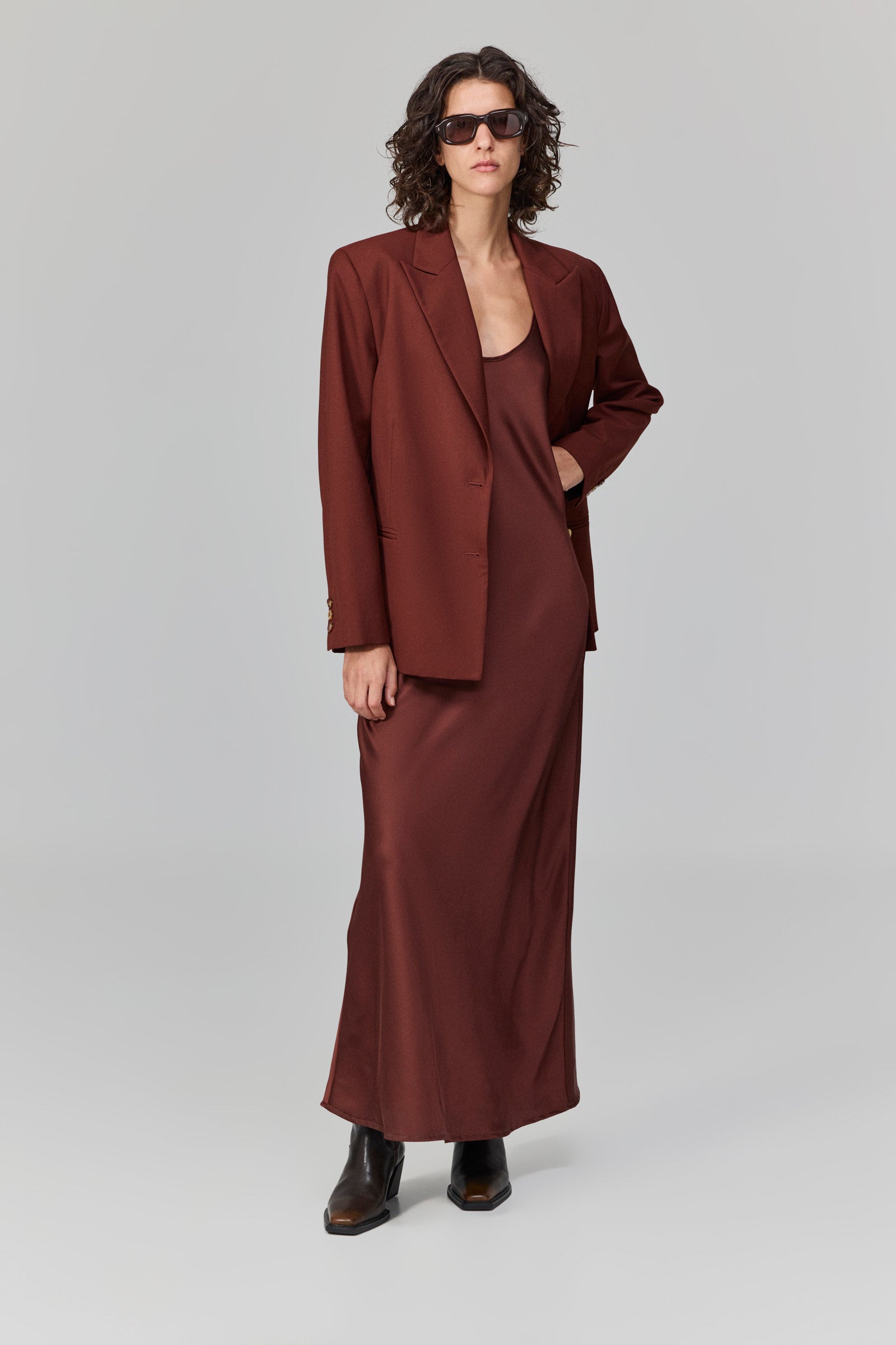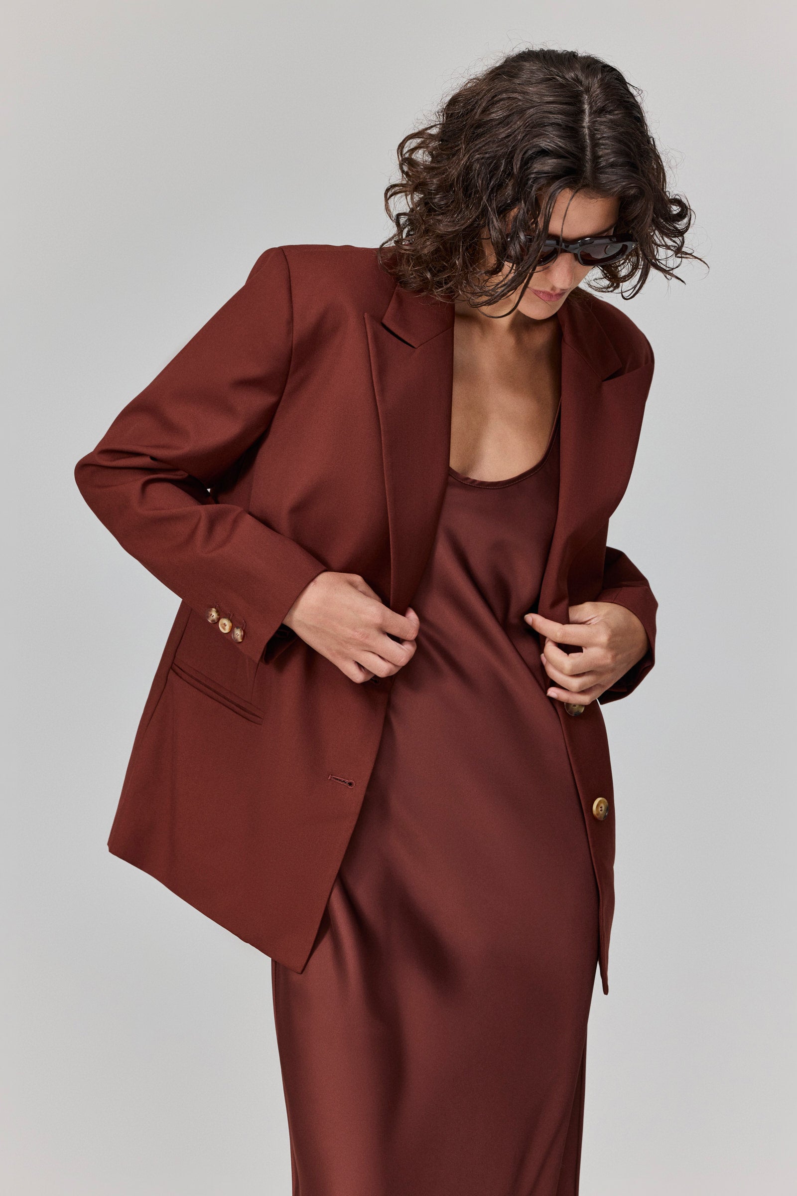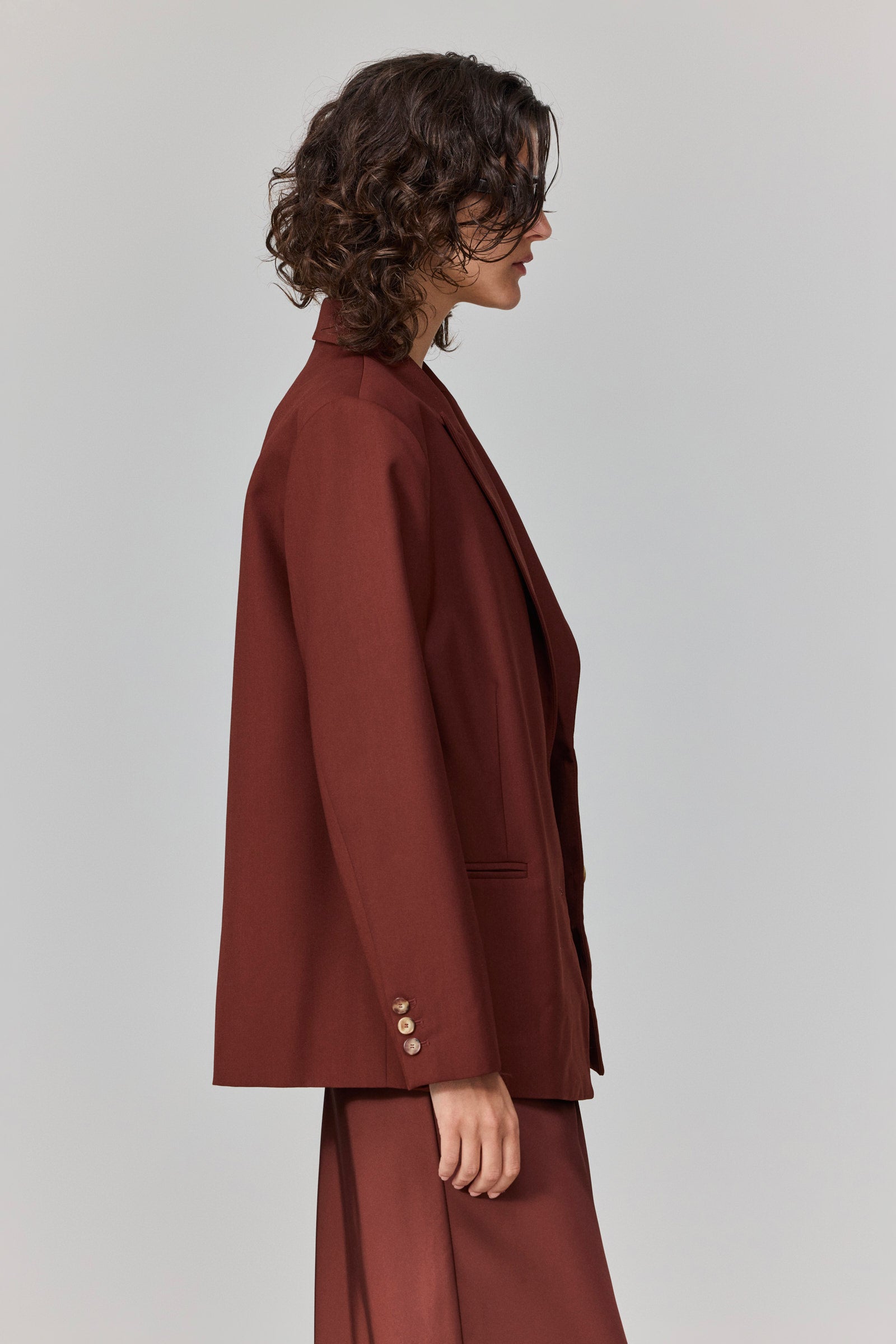 ז׳קט מחויט בצבע חום עמוק, בגזרה ישרה עם כתפיים מובנות וכפתורים בחזית.