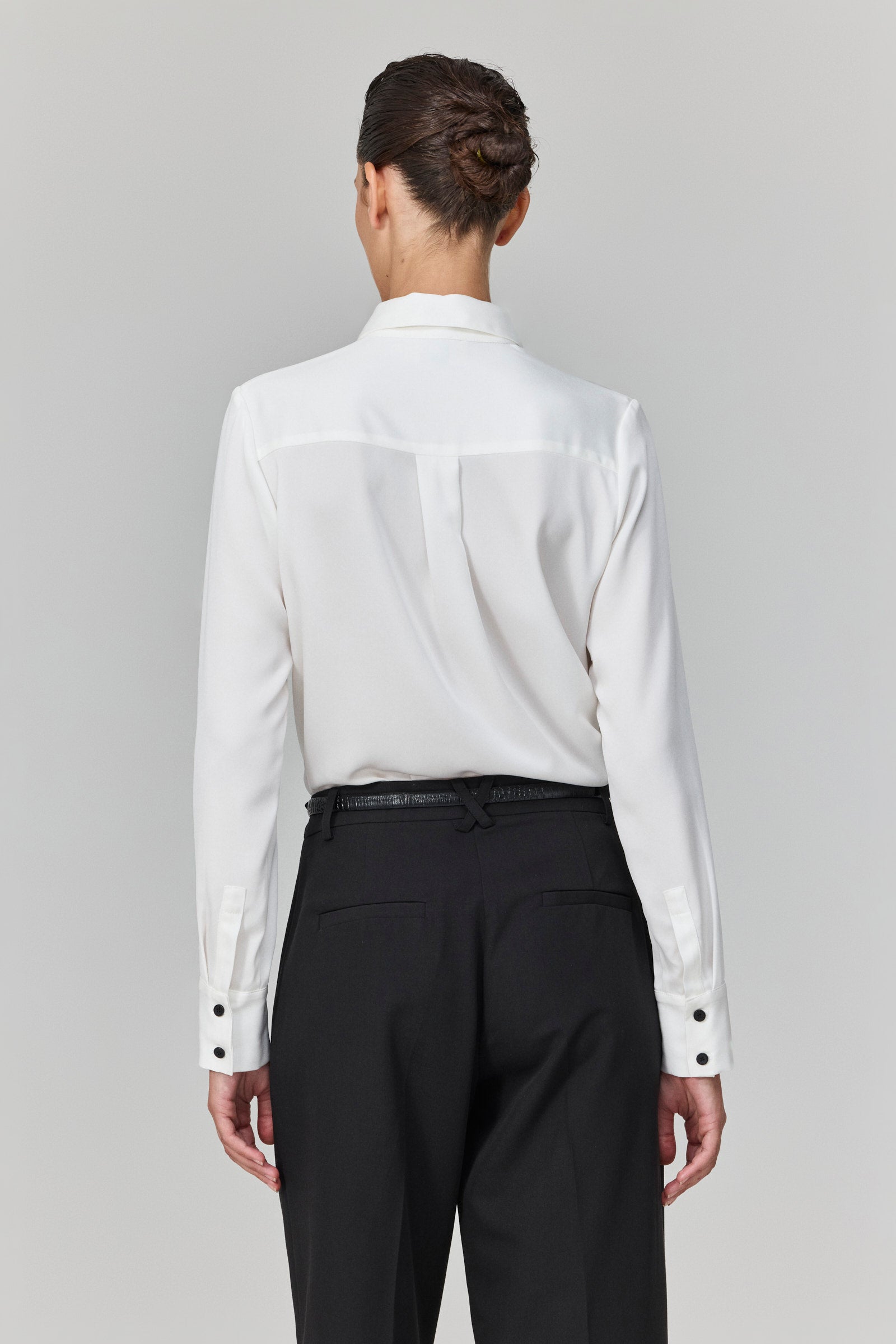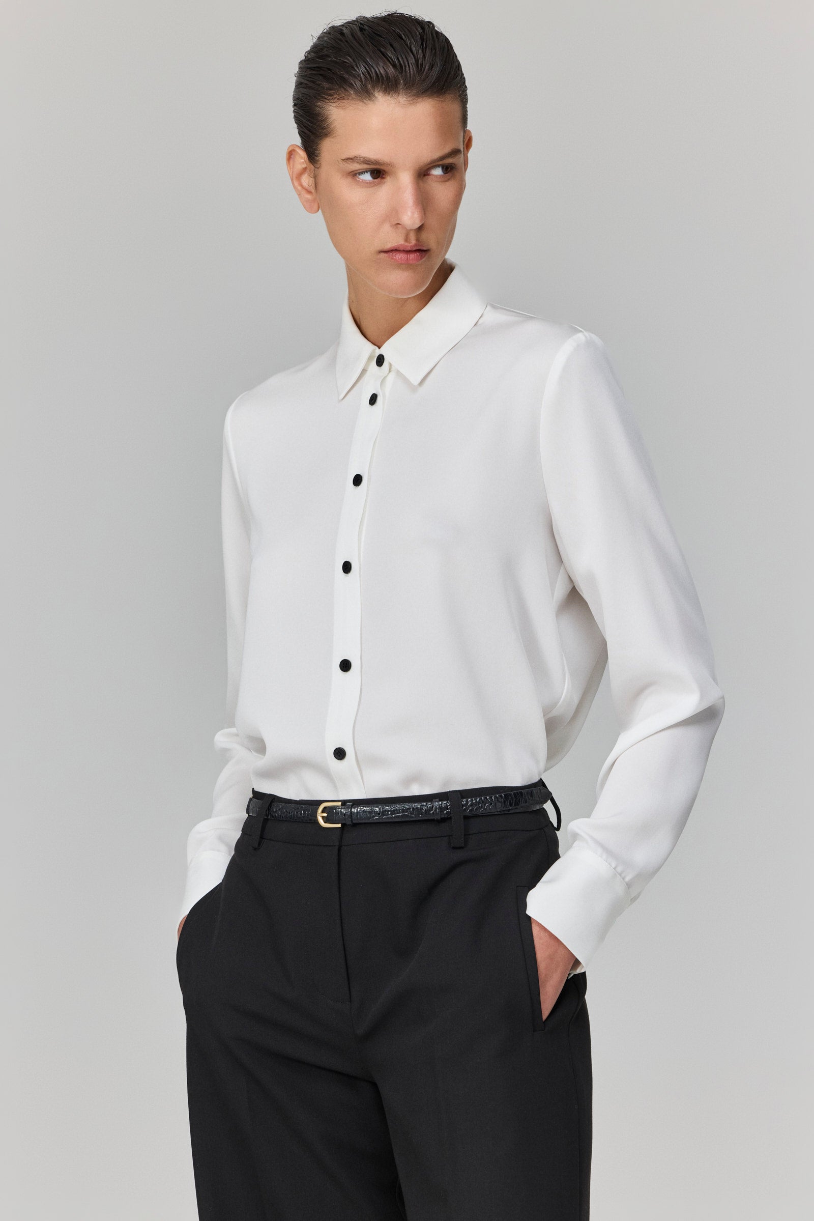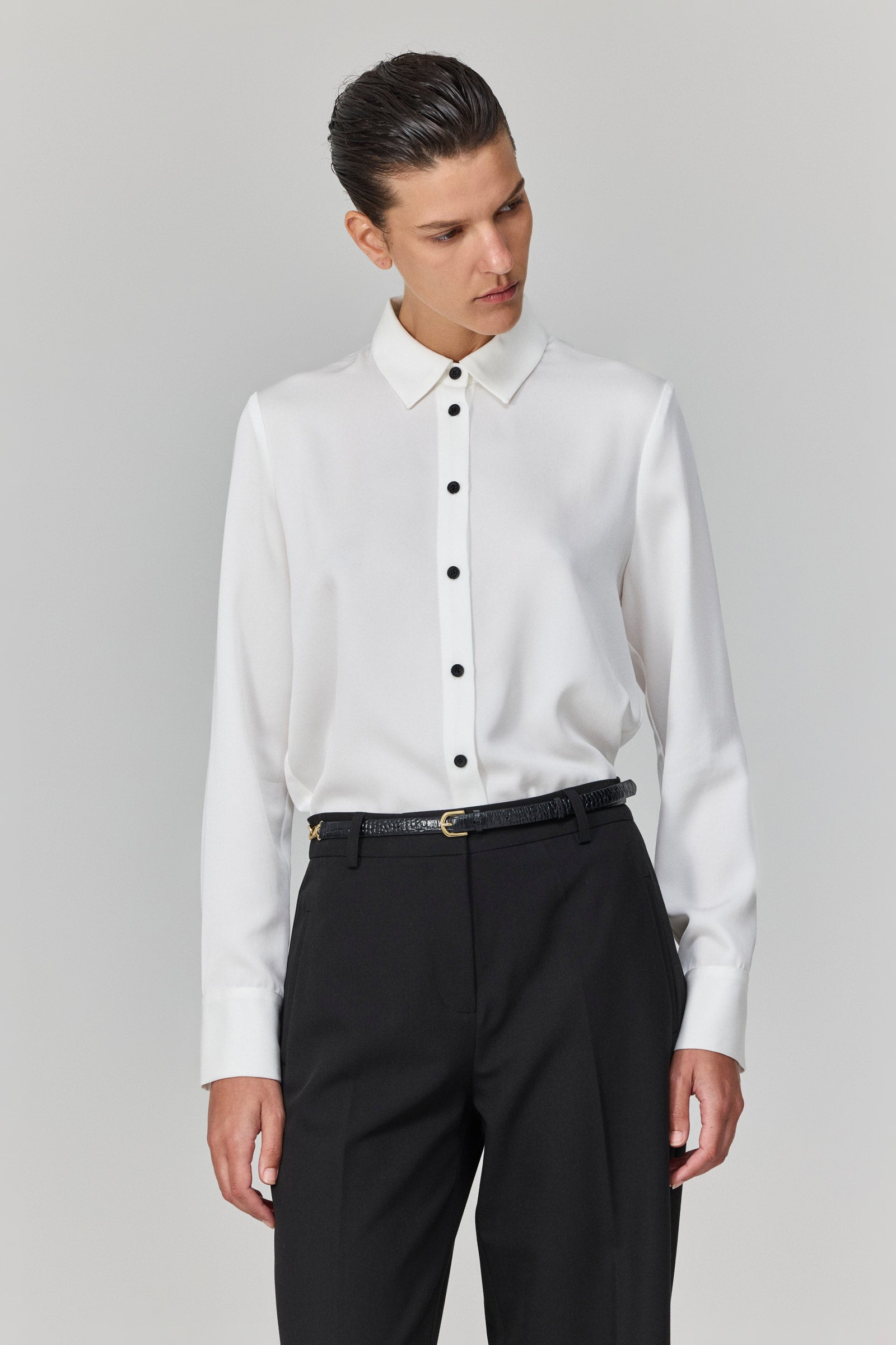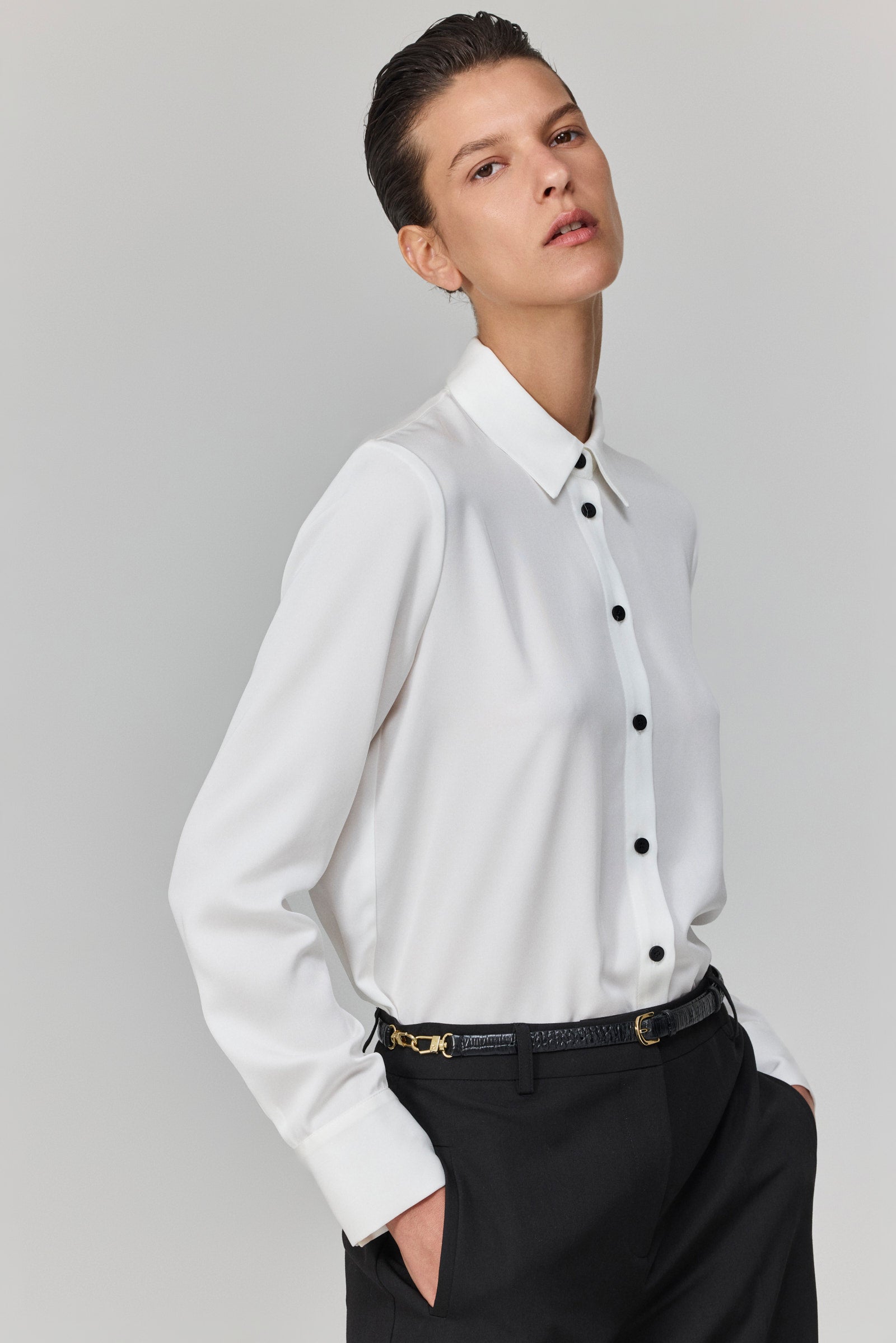 חולצה לבנה מחויטת עם כפתורים שחורים קונטרסטים, שמוסיפים טוויסט אלגנטי לפריט קלאסי. הבד והגזרה המדויקת מעניקים לה מראה נקי, מוקפד, ועל־זמני .החולצה משתלבת בקלות עם ג'ינס או מכנסיים אלגנטיים . פריט חובה לארון שכל פרט בו נבחר בקפידה.